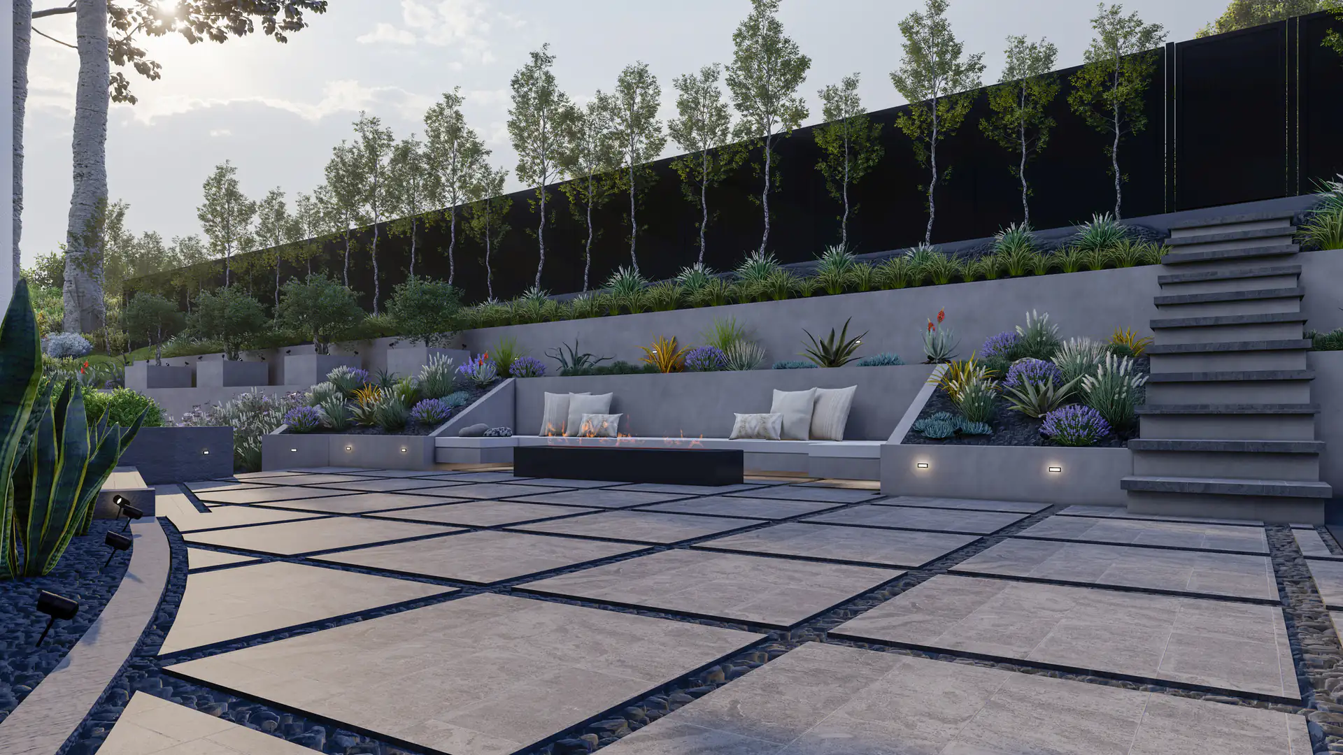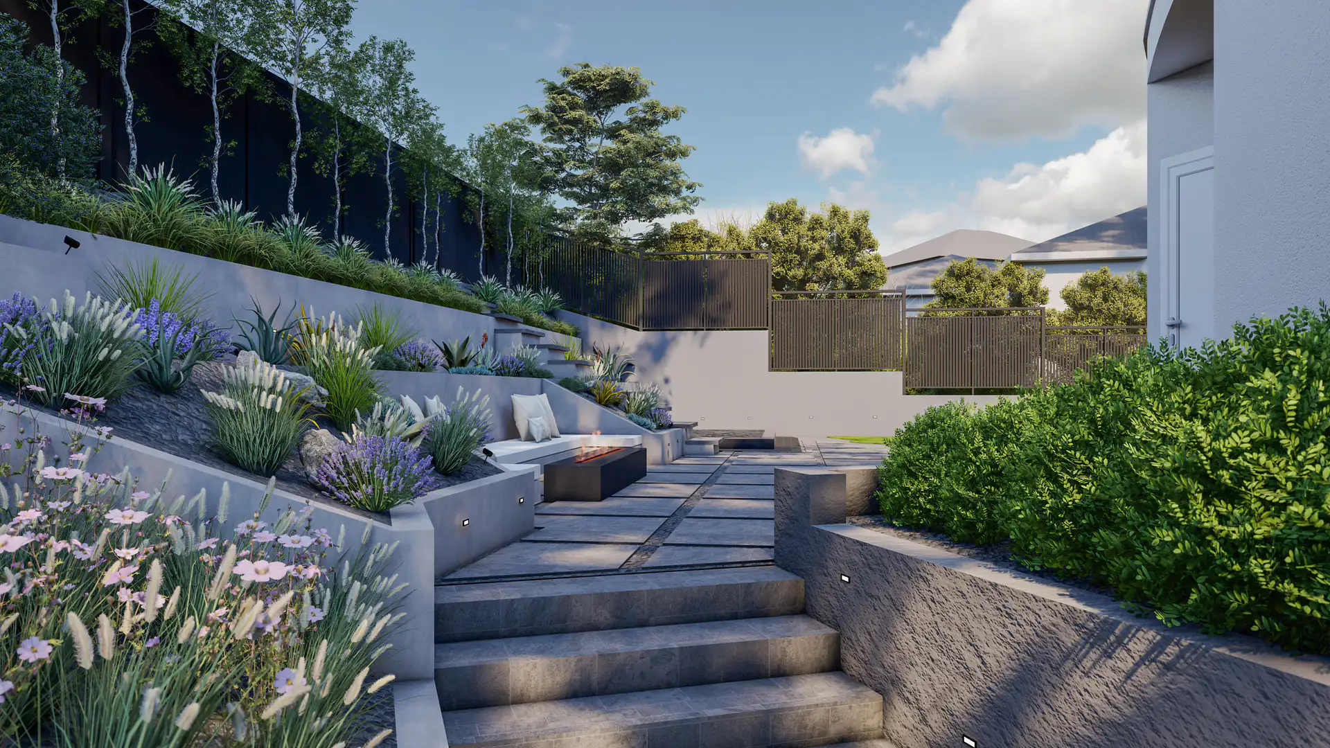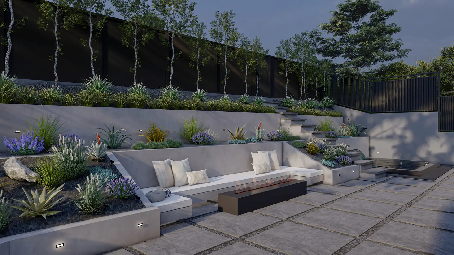 The design integrates stepped retaining walls with built-in planters, creating depth and texture. A sleek fire lounge and reflective pool balance bold structure with refined, comfortable finishes.