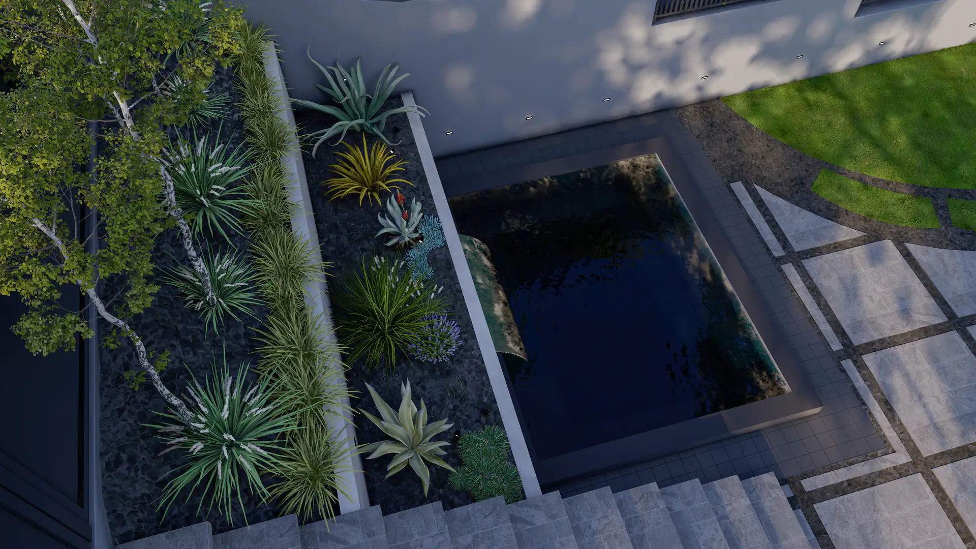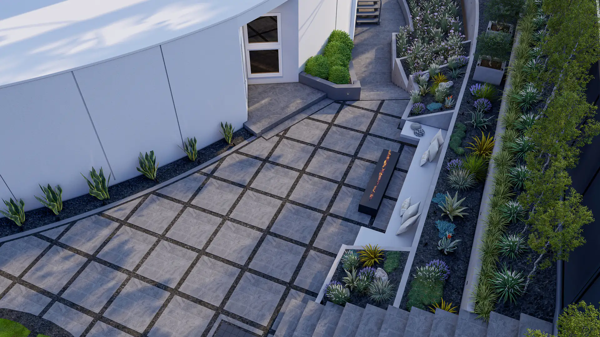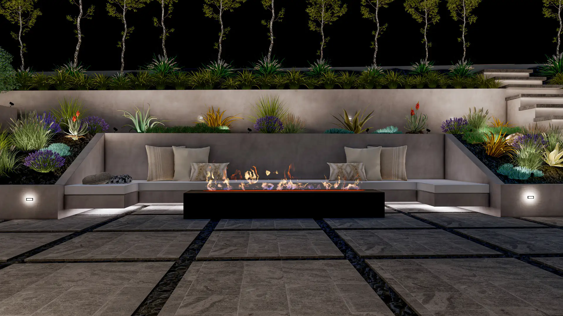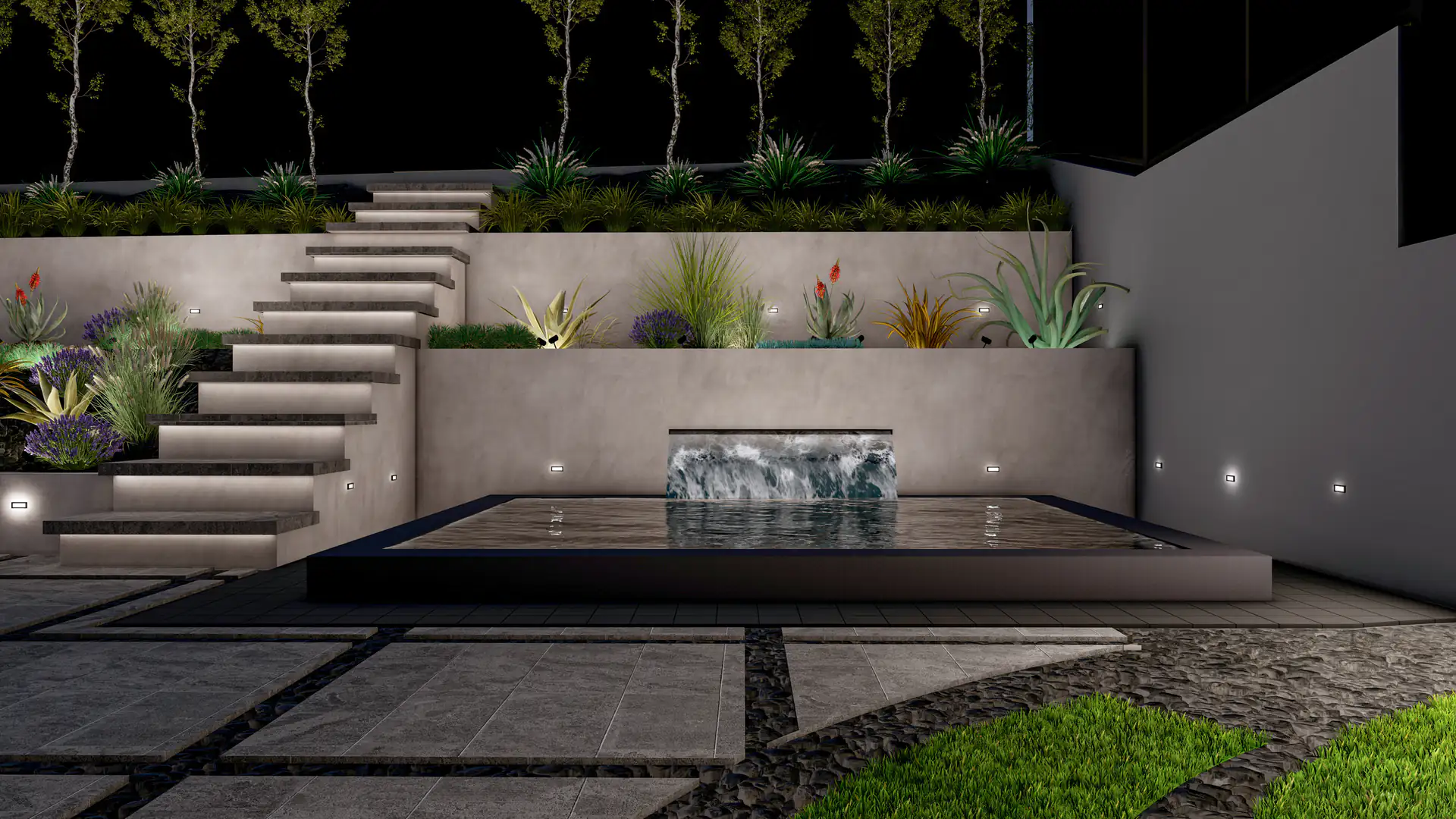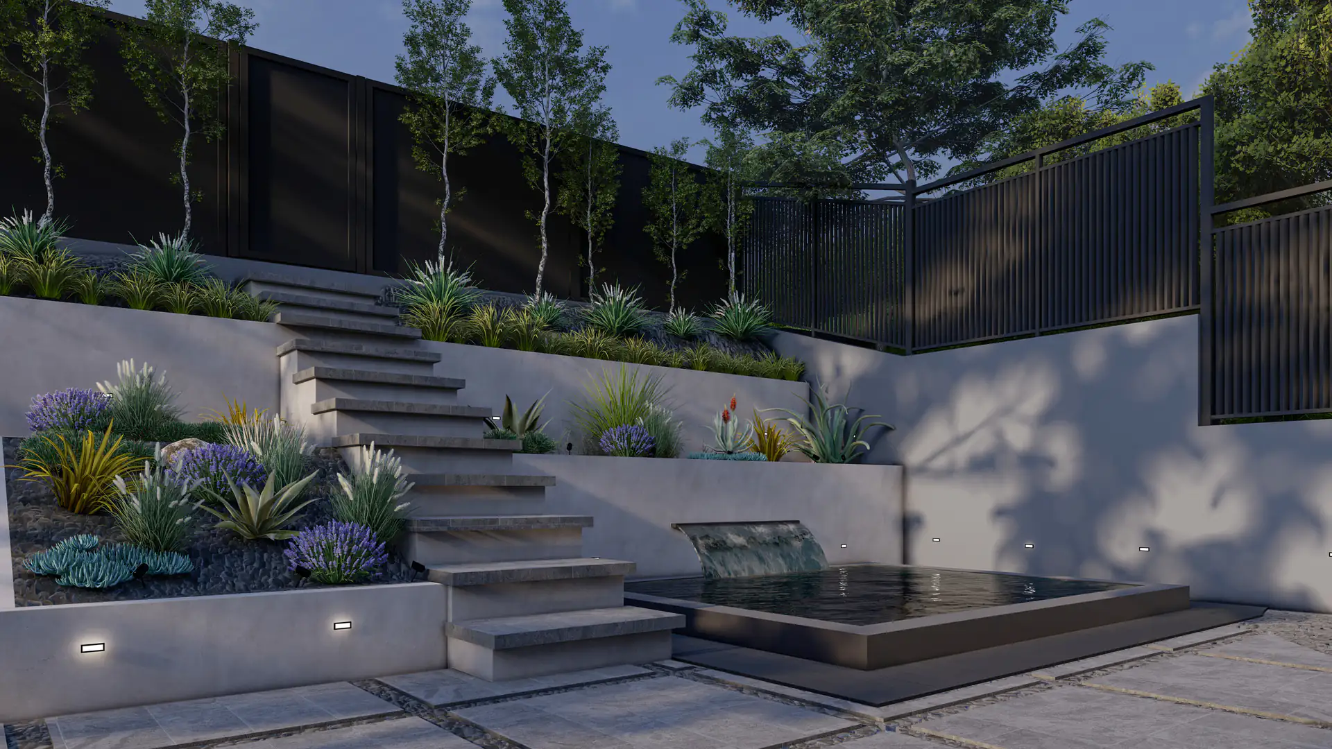 Concrete steps guide movement through vibrant landscaping, accented with soft lighting and modern stone finishes. The water wall and fire feature establish a dynamic, balanced focal point.