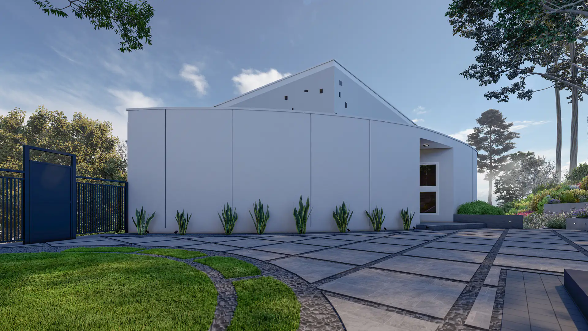 Clean geometric lines and contrasting materials define the layout, blending stone pavers, modern seating, and custom planters. Finishes emphasize minimal elegance with rich planting textures throughout.