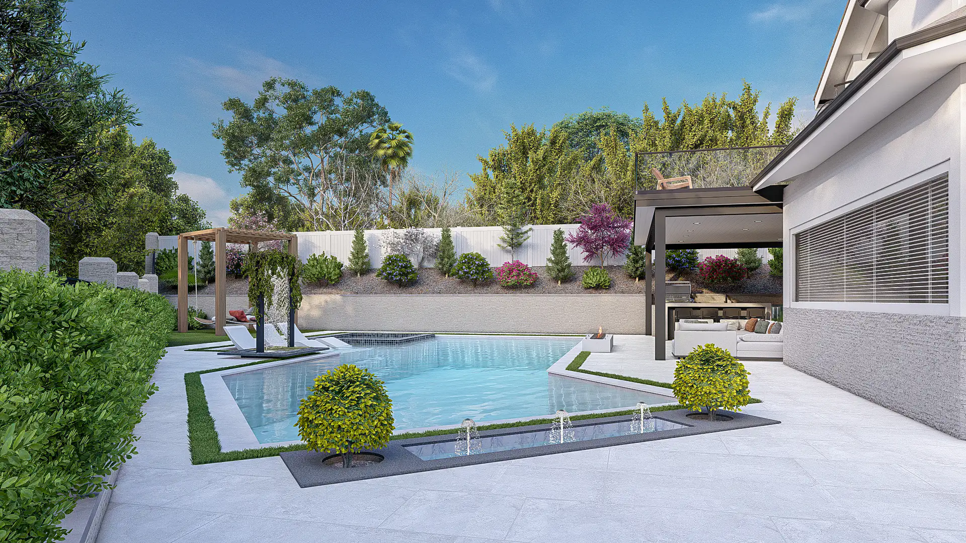 Flow connects every space: a raised spa with in-pool loungers, shaded pergola seating, sunken fire lounge, and outdoor kitchen balanced by layered plantings and natural stone details.\