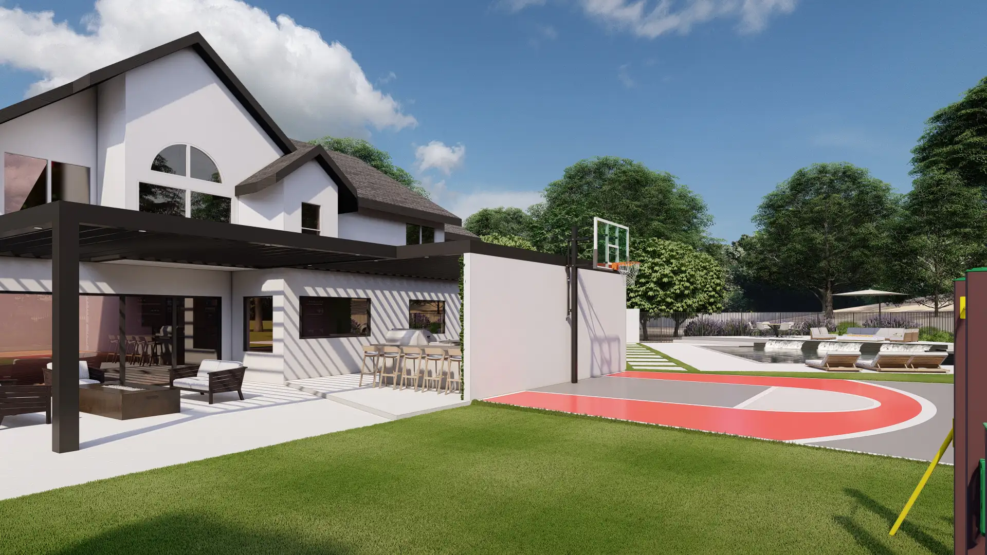 A family resort yard unites a sculpted pool, half-court basketball, louvered outdoor kitchen, and kid play lawn with seamless circulation.