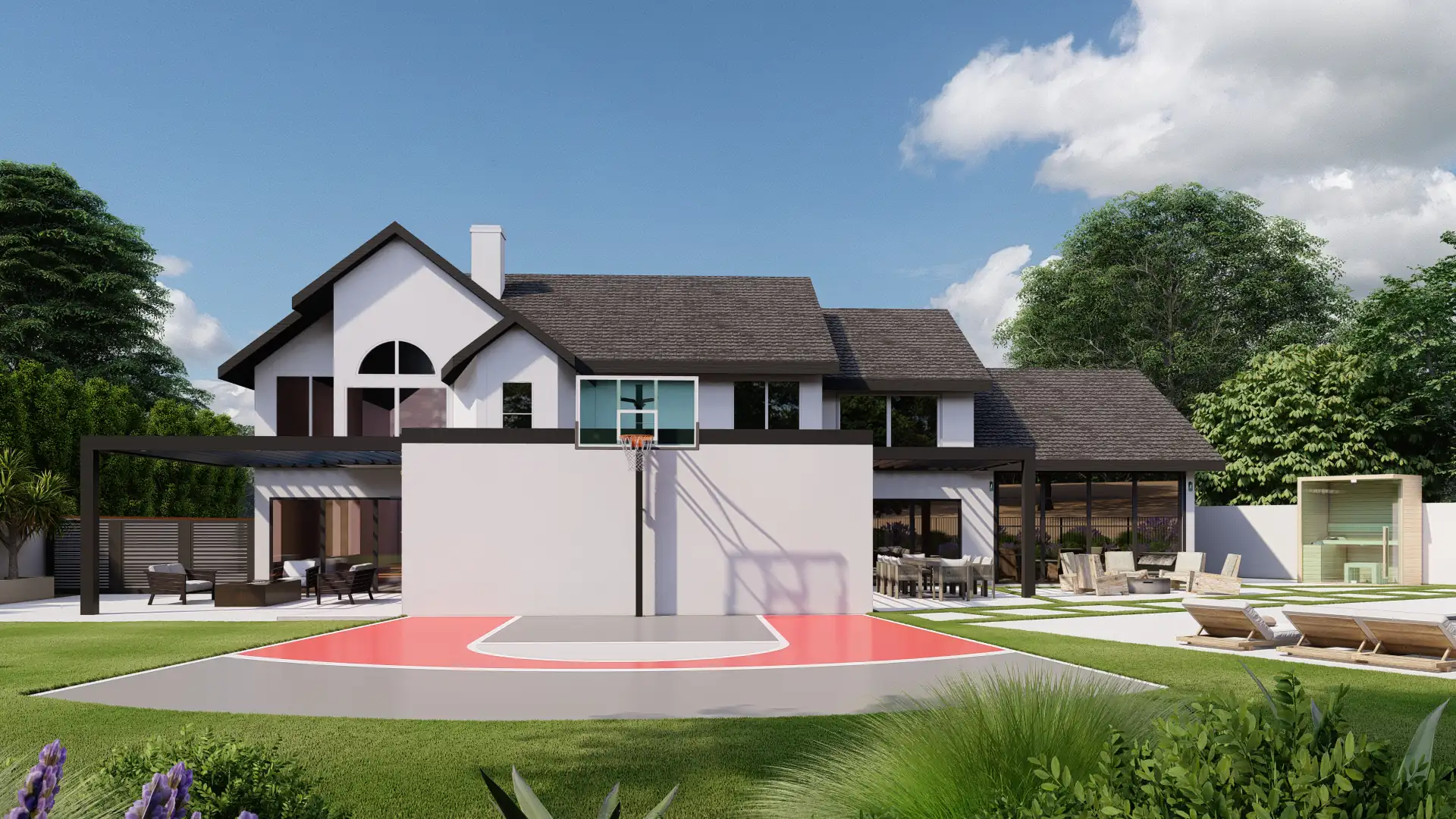 A dedicated half court anchors family activity beside a kids’ play zone. A cedar sauna cube, privacy wall with water feature, and layered lavender, grasses, and evergreen hedges complete the resort feel.
