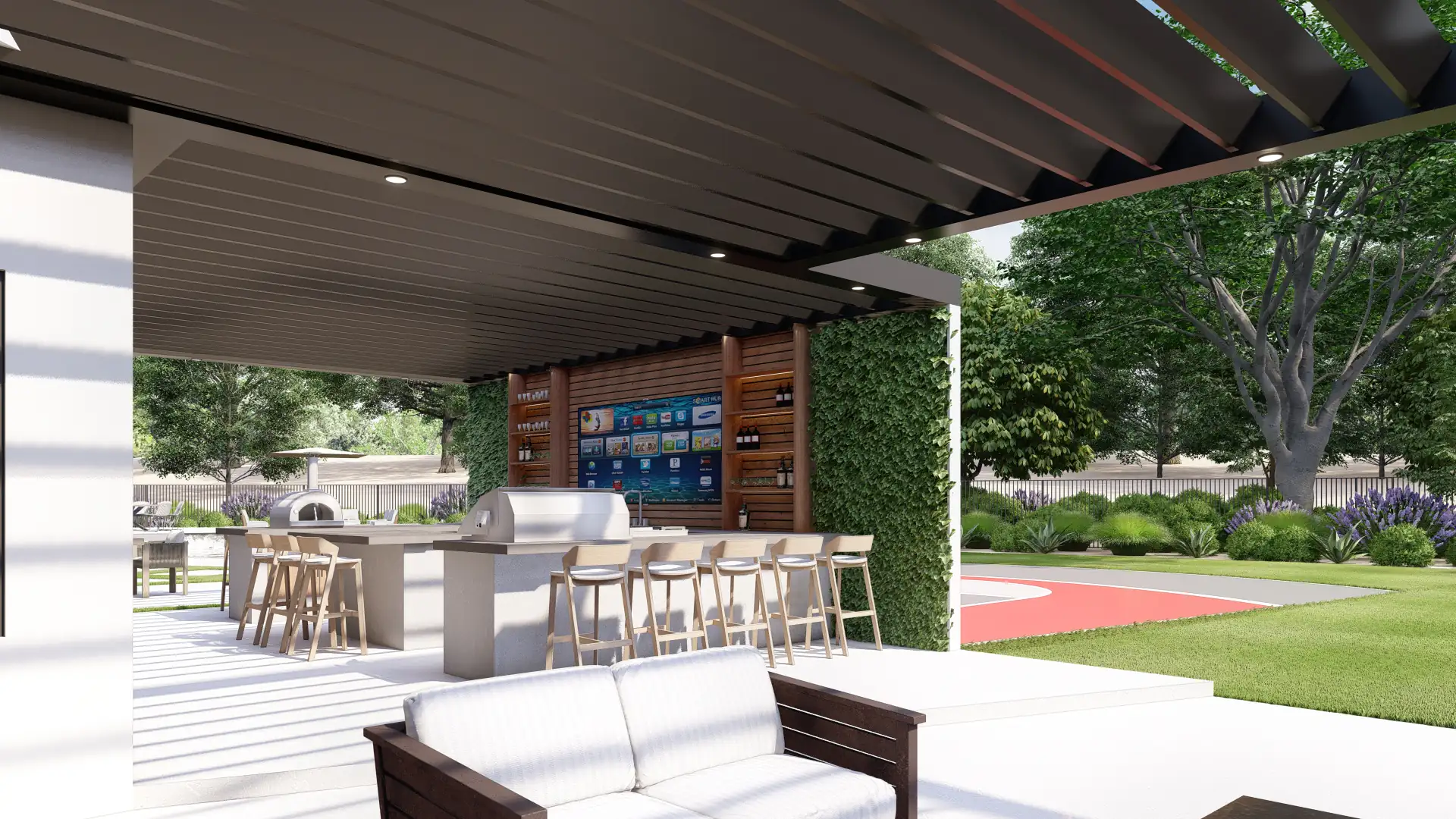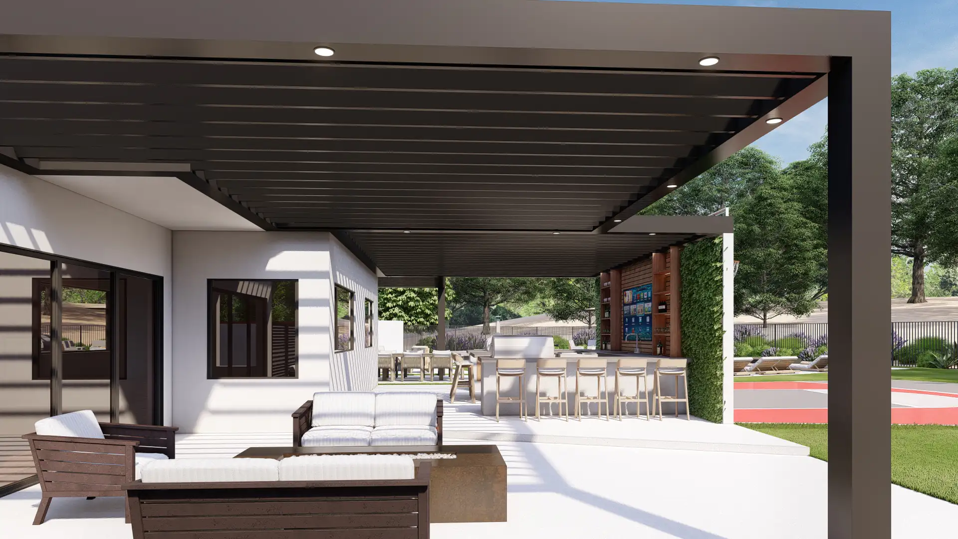 A black aluminum louvered cover shelters a chef’s station with grill, pizza oven, sink, and back-bar shelving around a media wall. An island and dining table host game-day spreads and weeknight dinners.
