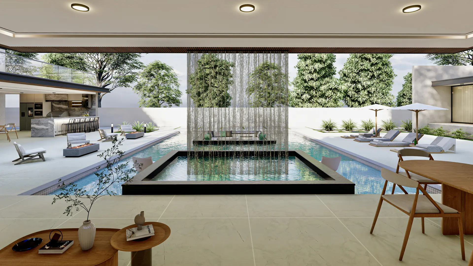 The centerpiece is a custom pool with a sunken lounge and firepit, complemented by a waterfall feature that creates movement and ambiance. Multiple seating areas, an outdoor kitchen, and a dining pavilion allow the space to adapt to gatherings of any size.