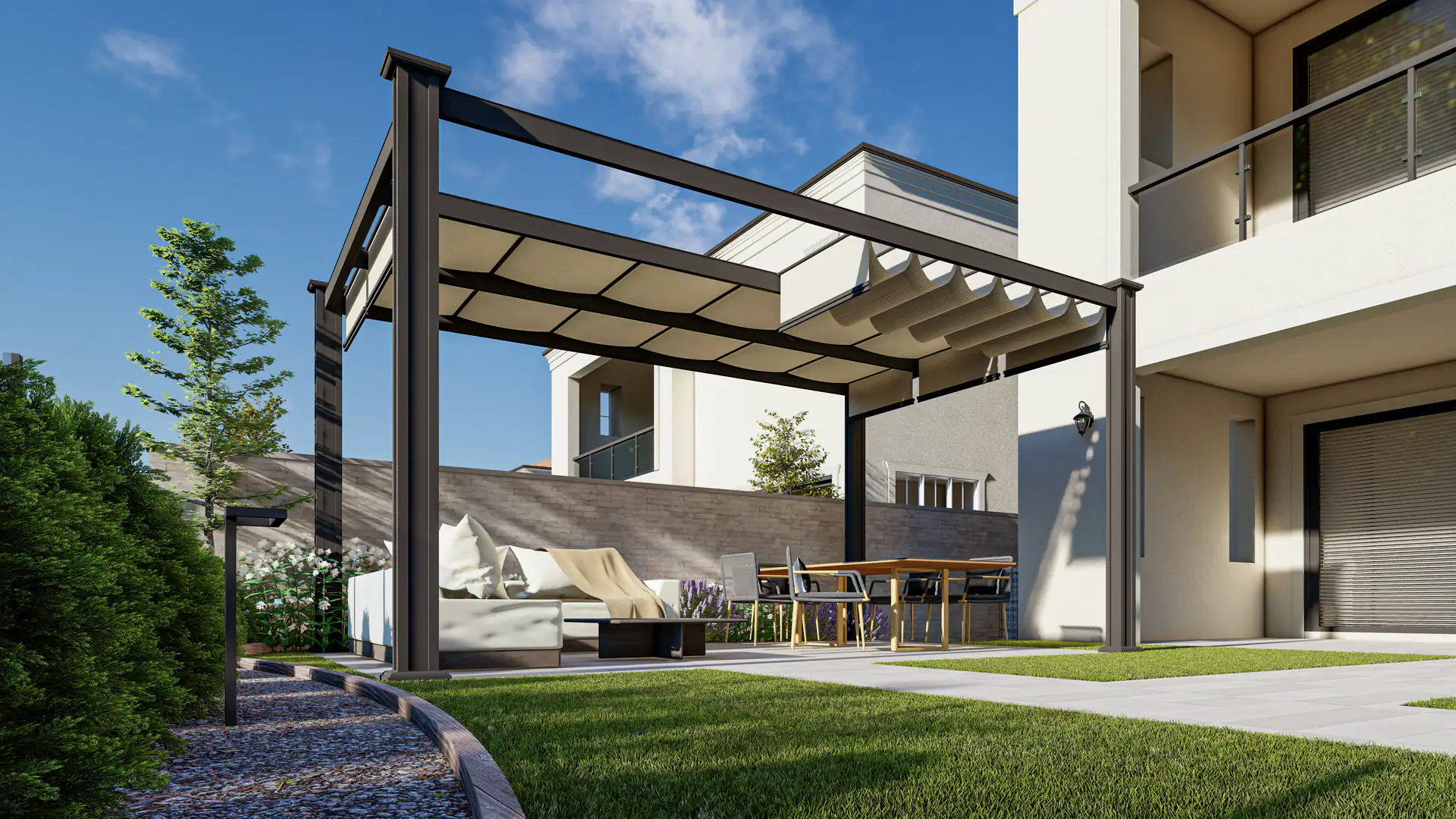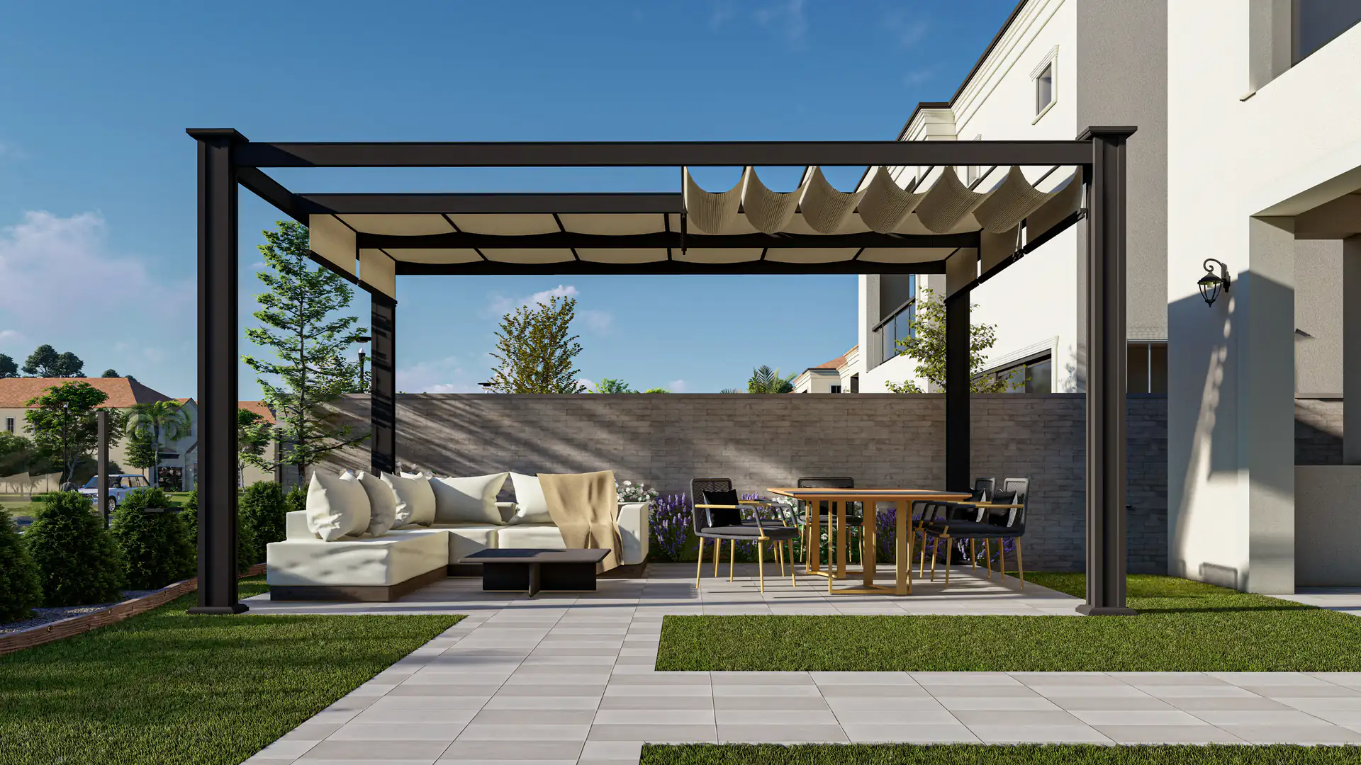 From structured paving to modern seating and pergola shade, this backyard blends balance, greenery, and comfort into a versatile outdoor escape.