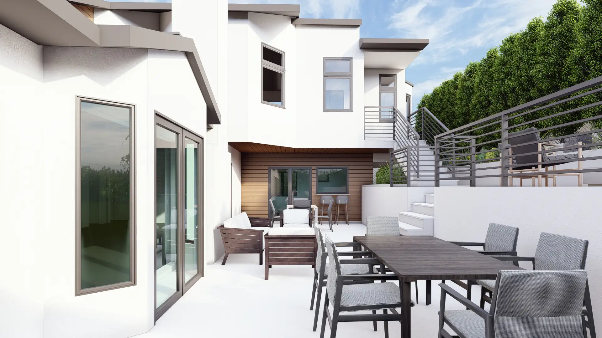 The backyard unfolds into interconnected terraces: lounge zones, fire pit seating, and multiple dining spaces designed for privacy while maintaining strong architectural symmetry.