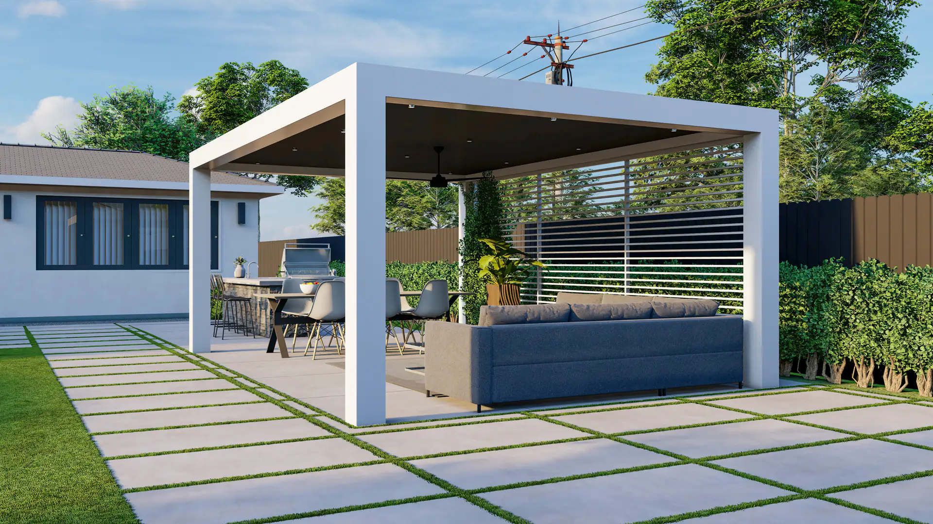 A dedicated outdoor structure provides a shaded lounge and dining area, complete with a ceiling fan and elegant slatted screens, ensuring comfort and privacy for both relaxation and entertainment.