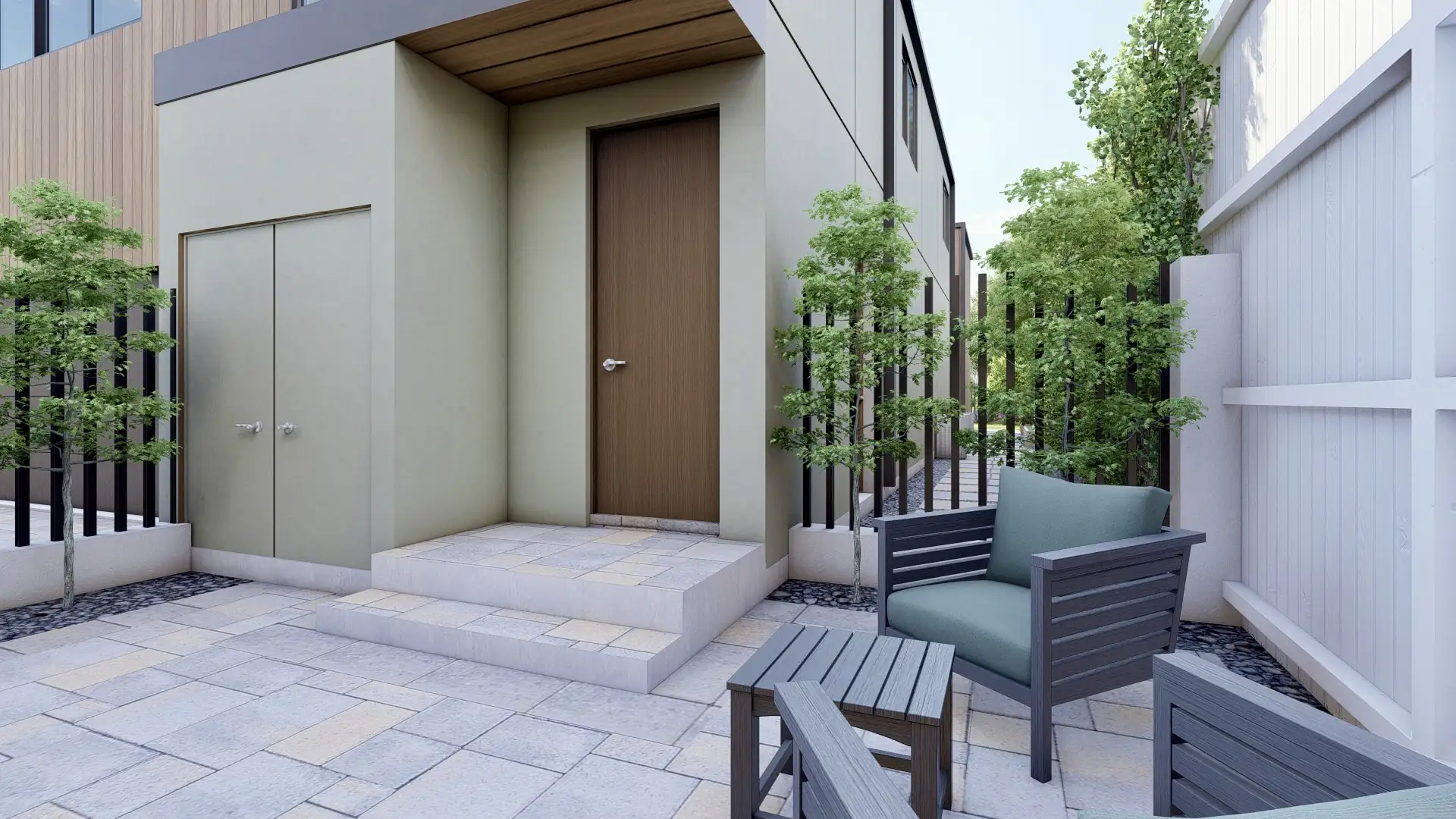 Finishes highlight sophistication: vertical wood panels contrast with black metal fencing, neutral stone pavers ground the landscape, and textured greenery softens the geometry. This careful balance ensures durability, timeless style, and architectural harmony throughout.