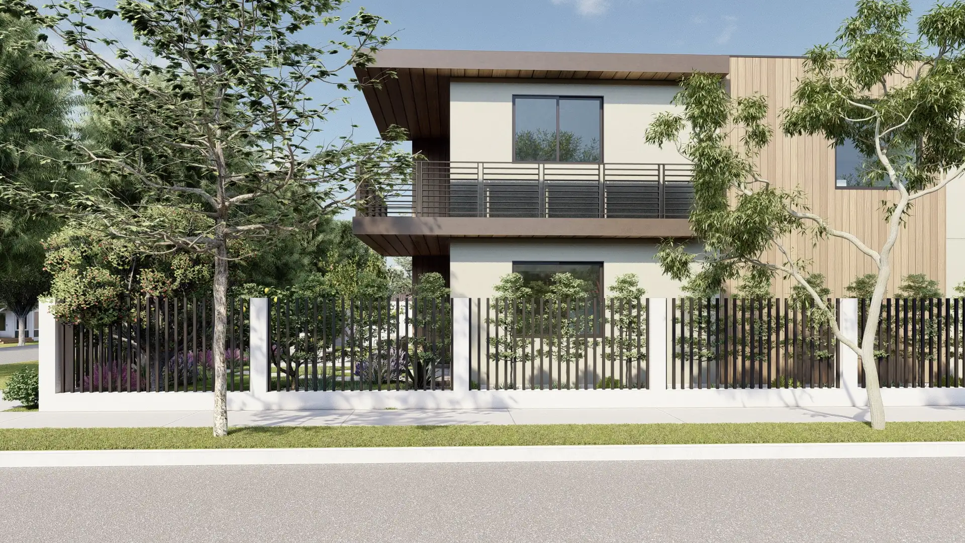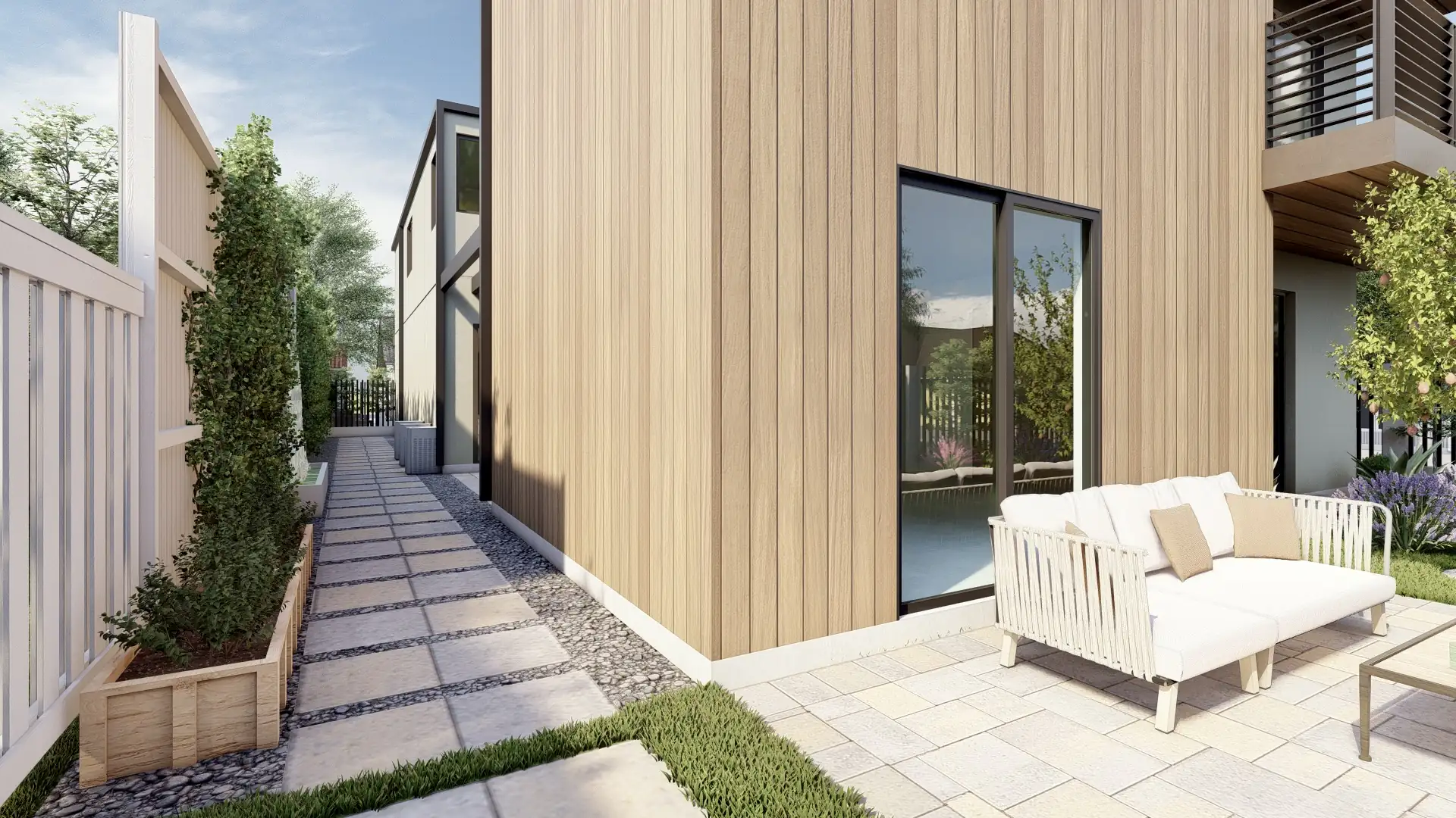 The home features a striking combination of vertical wood siding, smooth stucco walls, and expansive windows. Integrated balconies, sleek fencing, and defined outdoor spaces create a cohesive environment that balances privacy, functionality, and visual sophistication.