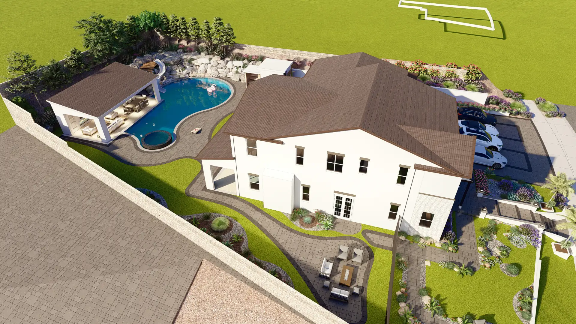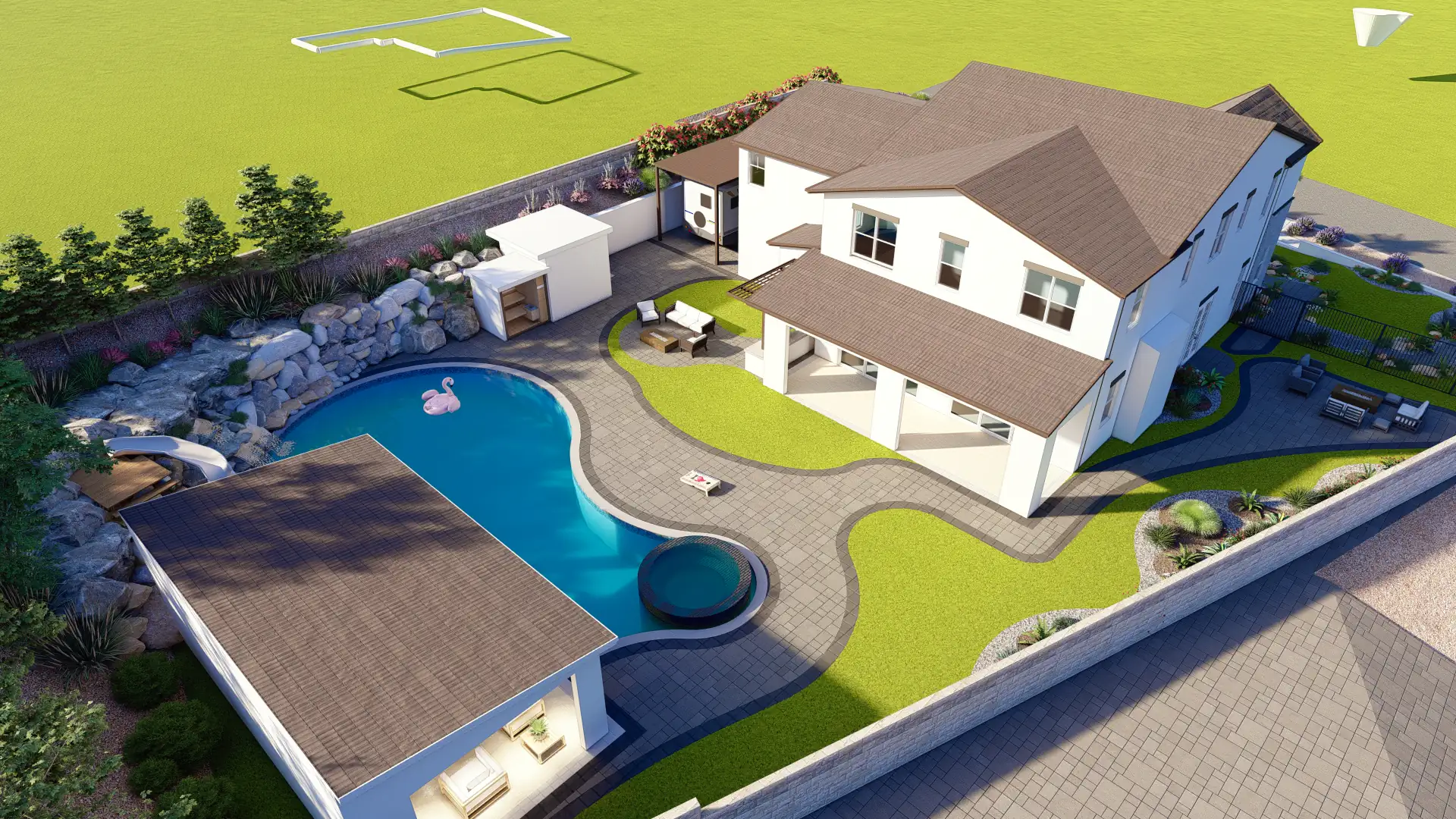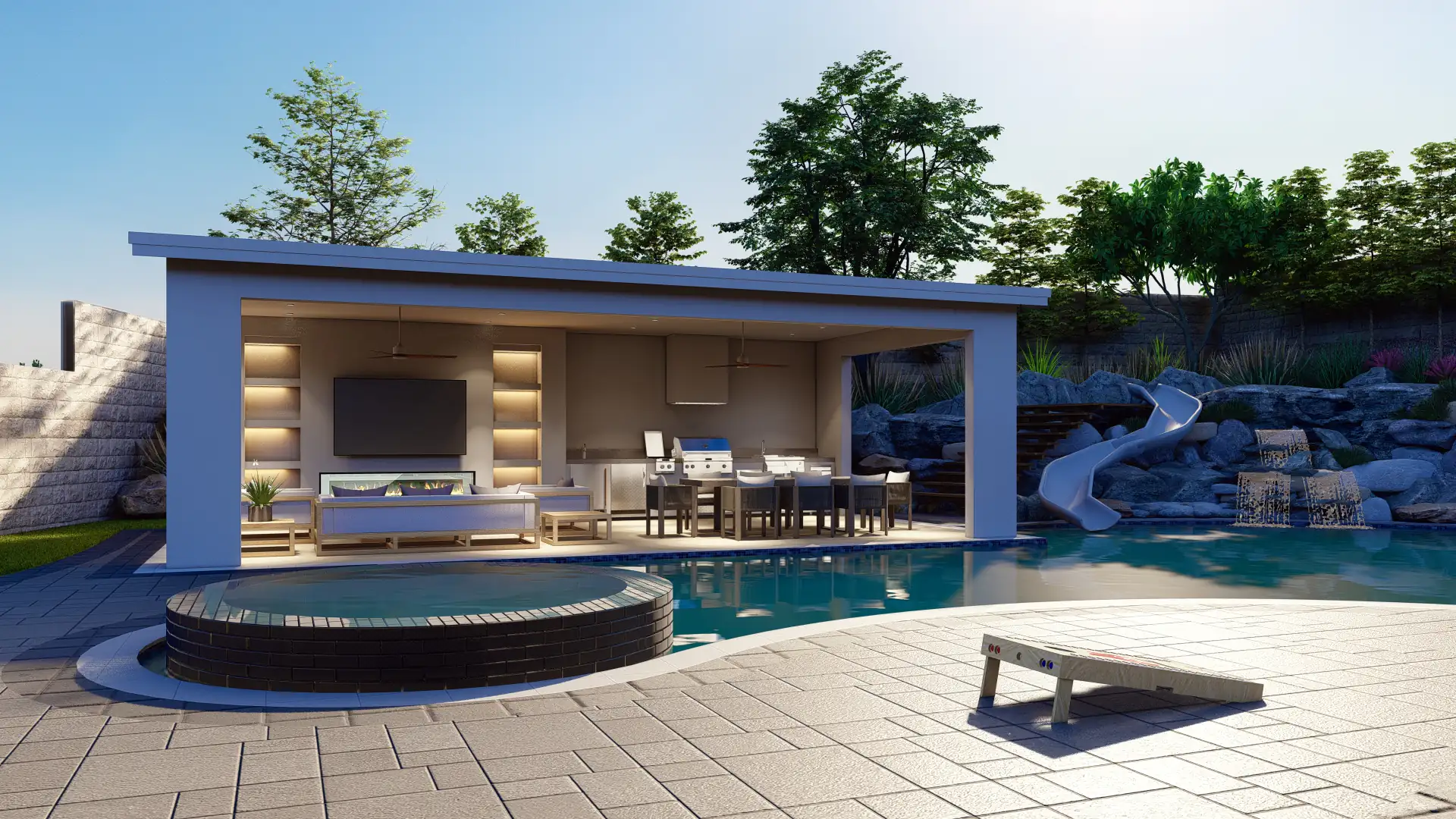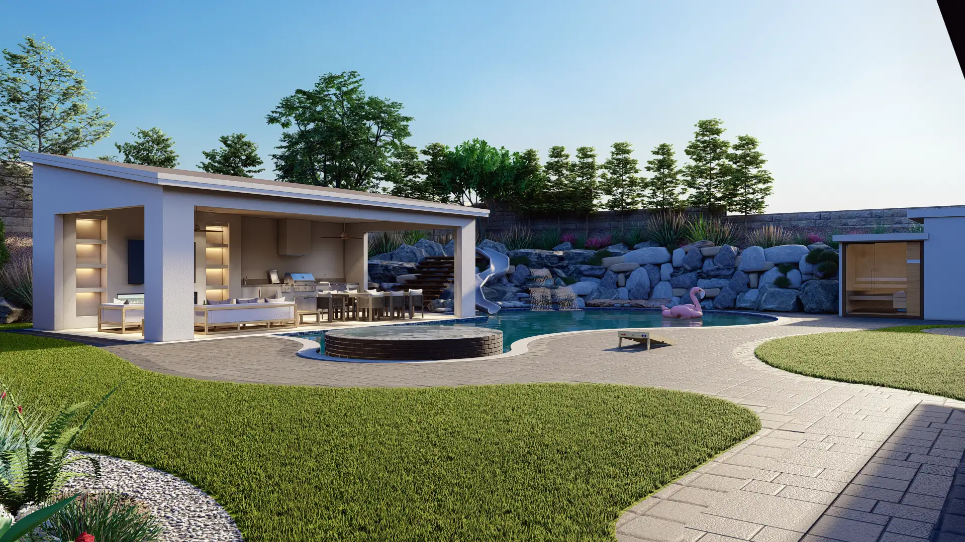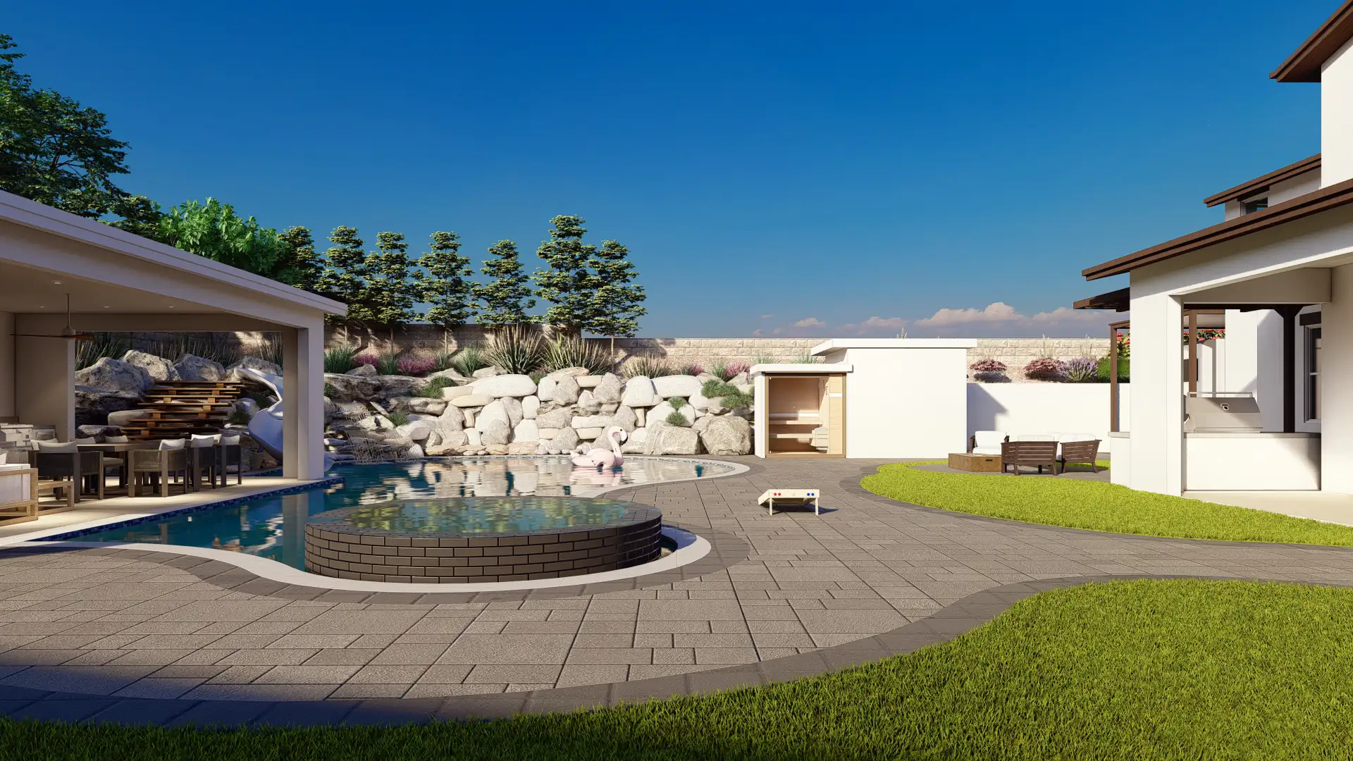 A resort-inspired backyard with a freeform pool, elevated spa, custom waterslide built into natural boulders, and a full outdoor entertainment zone.