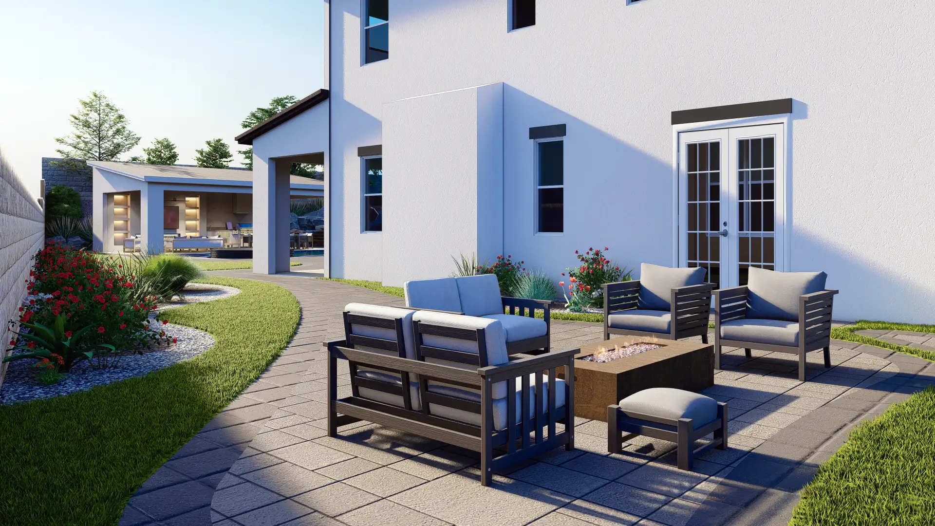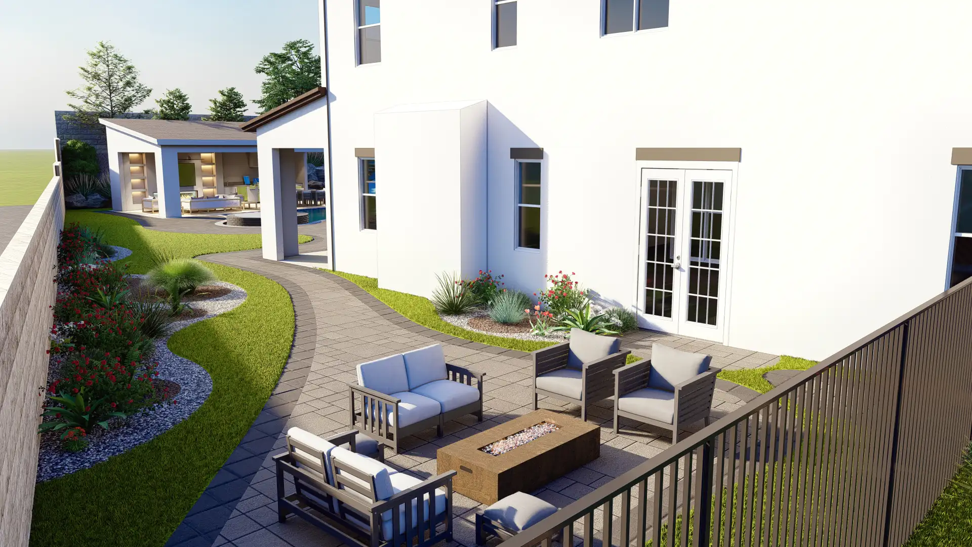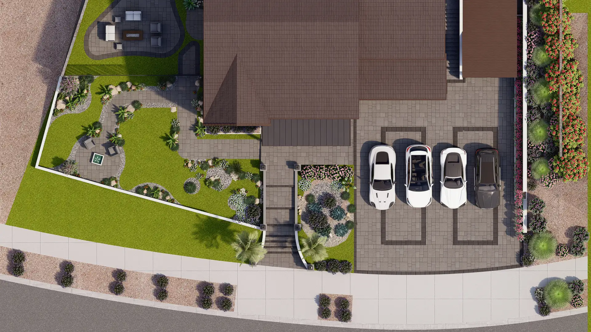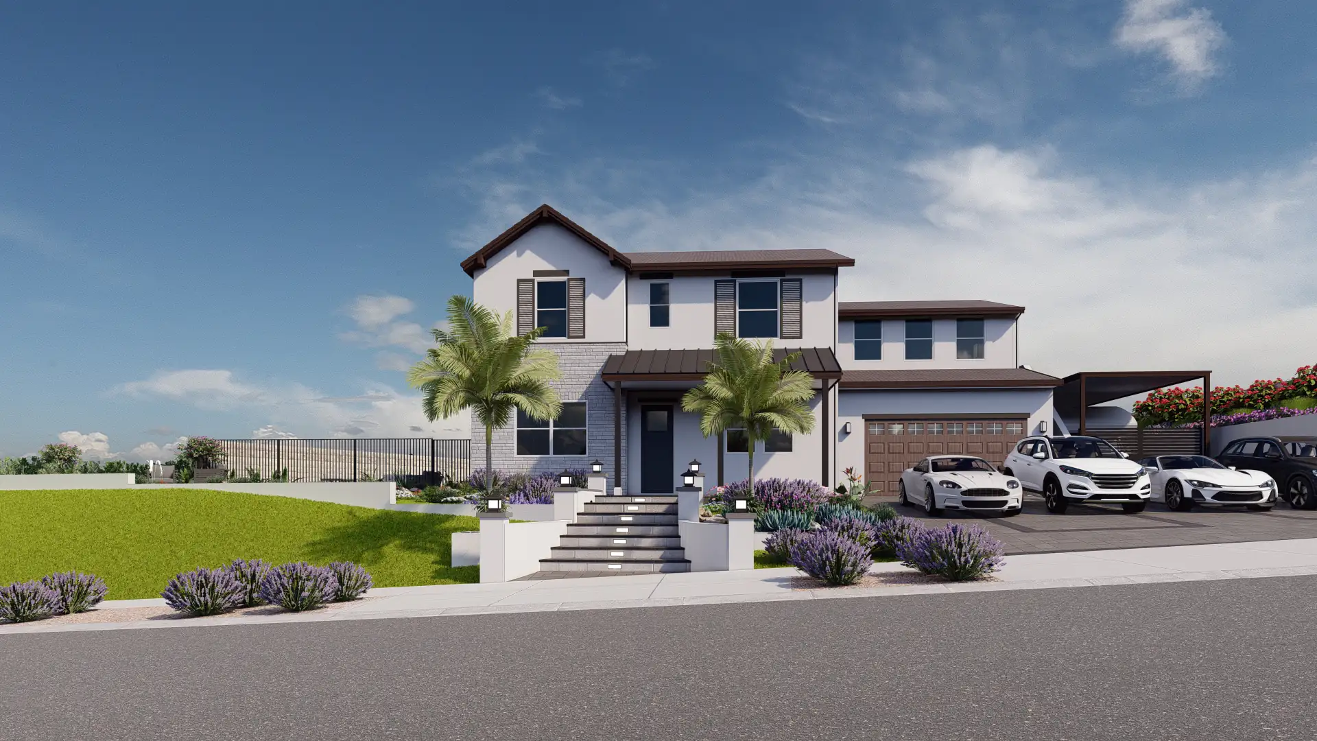 The front yard design integrates layered planting, palm trees, and custom hardscaping with lighting, while the driveway accommodates multiple vehicles with style, blending elegance and practicality in every corner of the property.
