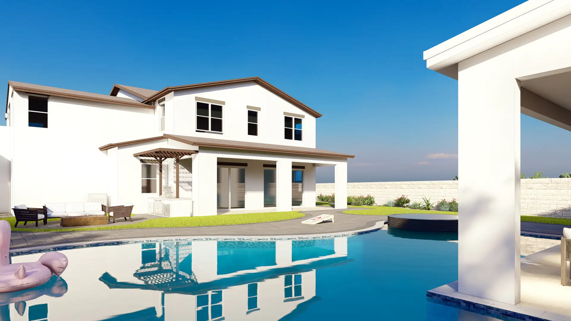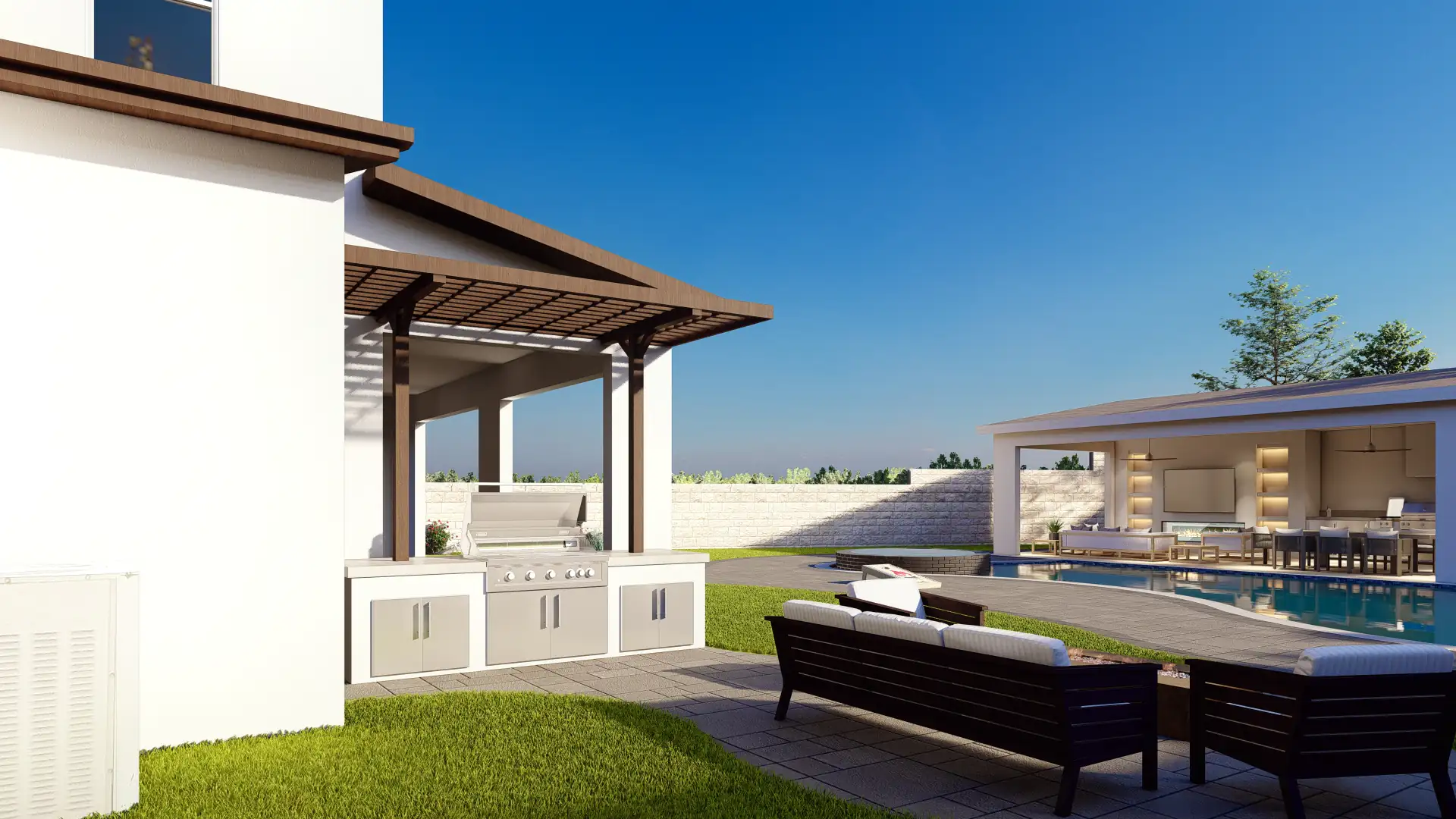 The design features an expansive covered structure with integrated lighting, outdoor kitchen, TV wall, and lounge seating, all overlooking the pool and spa for a seamless day-to-night living experience.