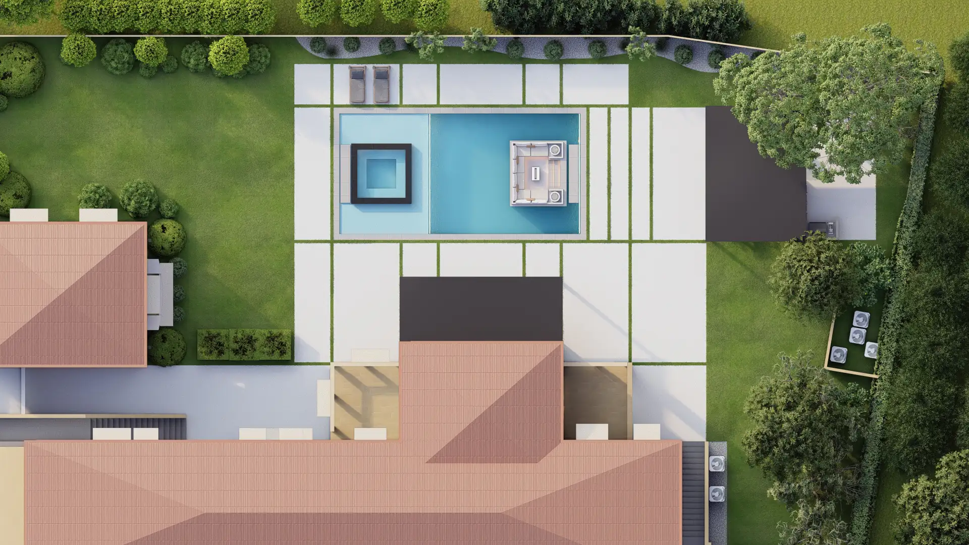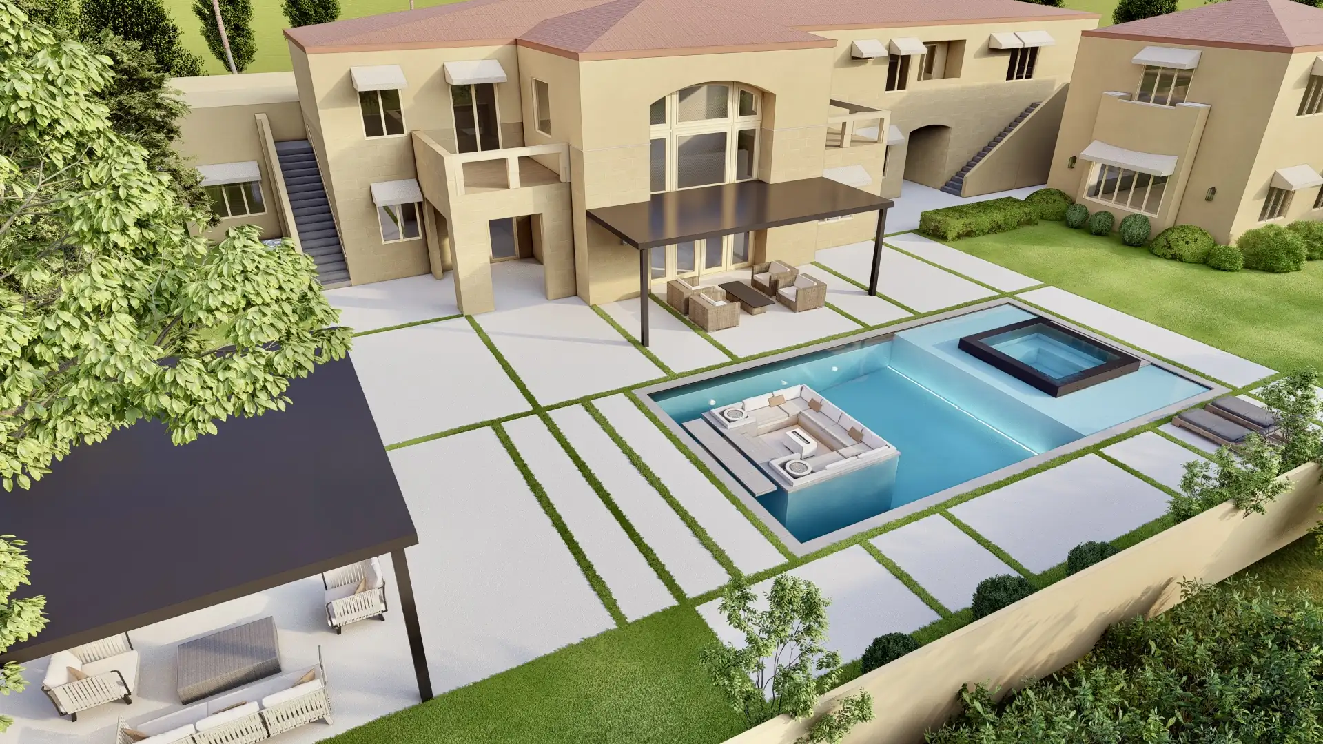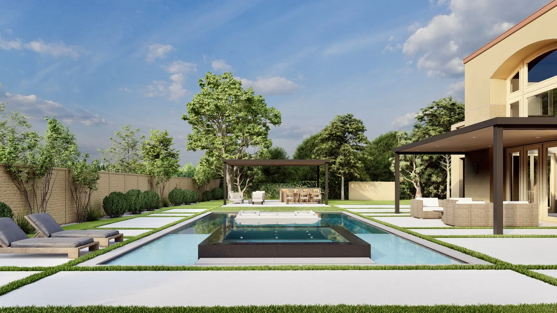 This courtyard blends precision geometry with warm textures, combining concrete pads, turf inlays, sleek pool tile, and natural wood accents for a polished, timeless environment.