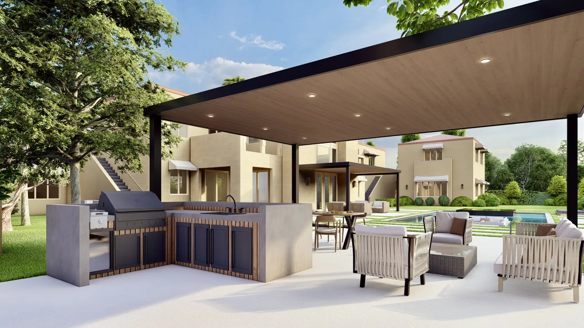 Flowing design connects poolside lounge, shaded dining, and outdoor kitchen, enhanced by clean architectural lines and curated finishes that merge elegance with functionality.