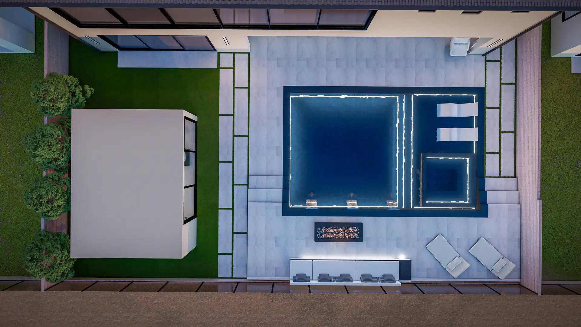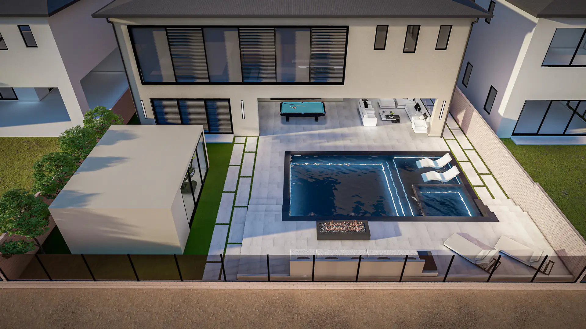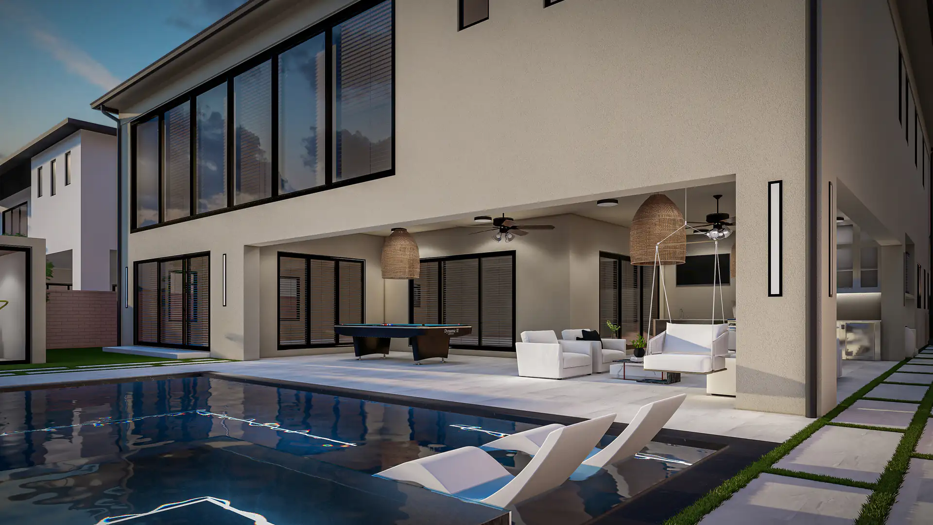 Indoor and outdoor areas flow effortlessly, from a striking front approach with structured greenery to a private backyard featuring a pool, lounge spaces, and custom entertainment zones.