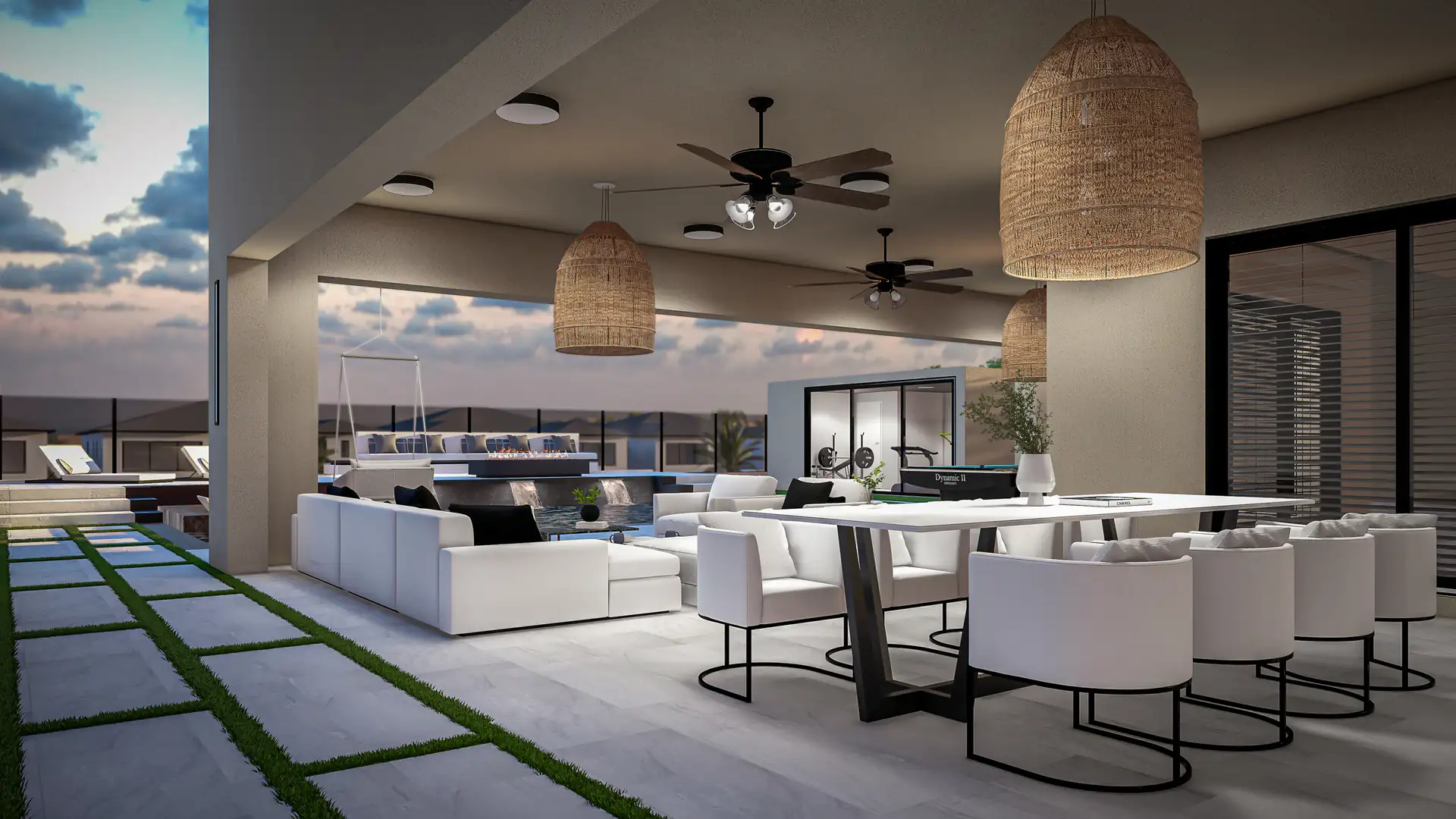 Finishes include porcelain tile flooring, modern water features, and minimalistic landscaping, chosen to elevate the architecture while maximizing durability, usability, and style across every surface of the property.