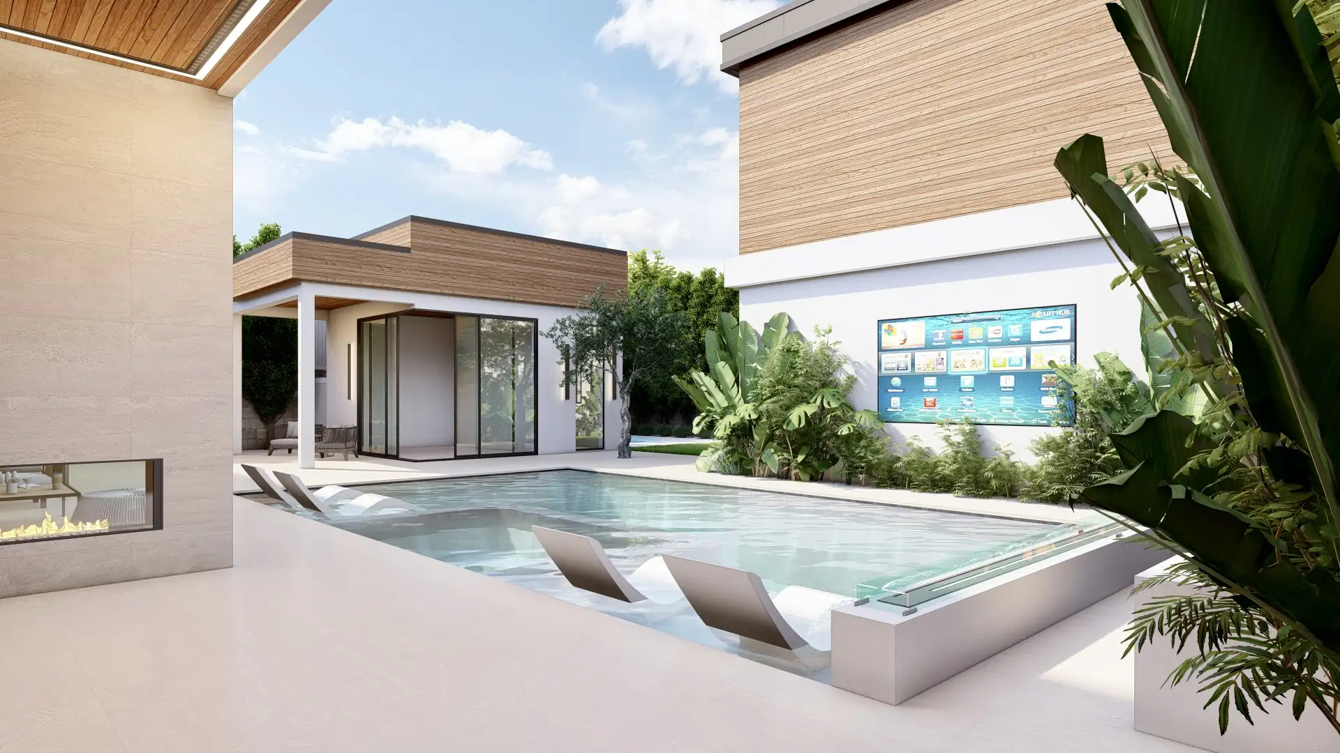 From concept to modern escape — Palm Court Estate was designed with a resort-style pool, water wall, sports court, and outdoor pavilion.