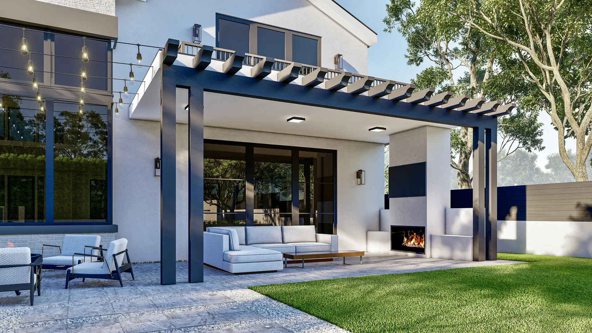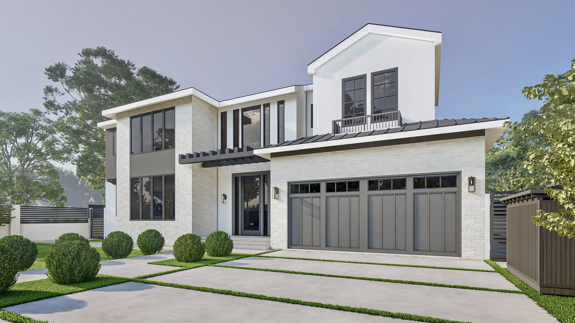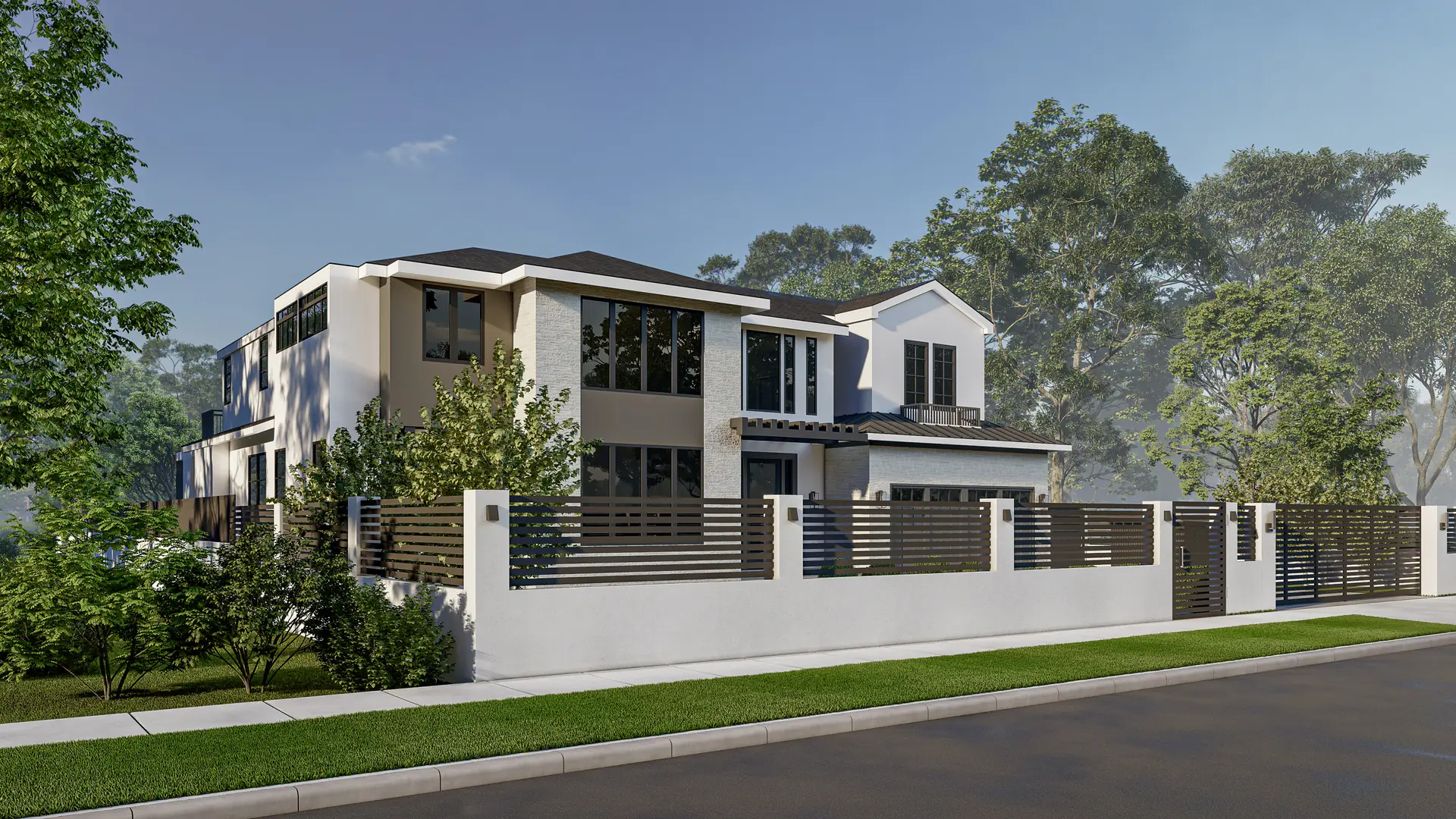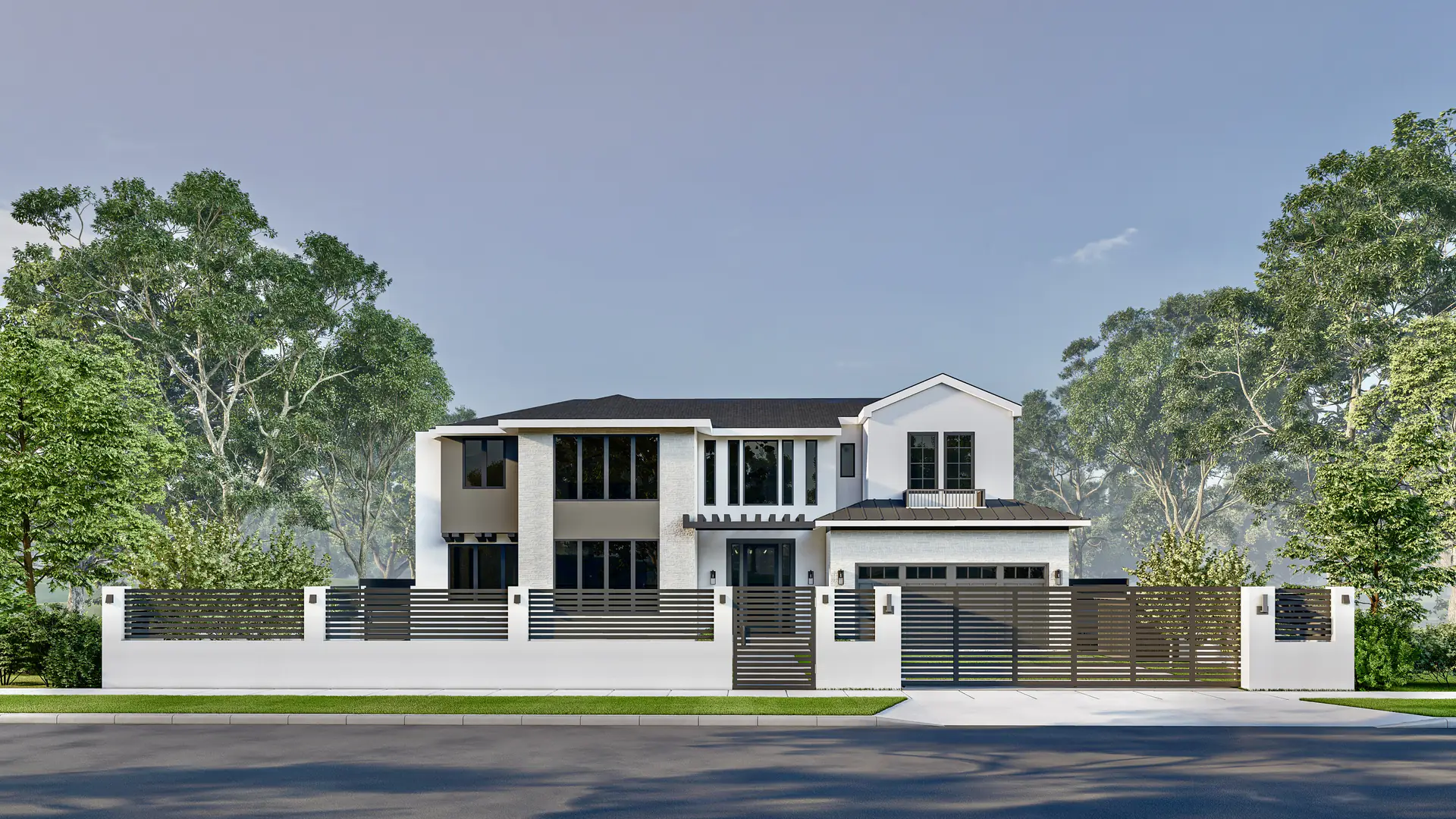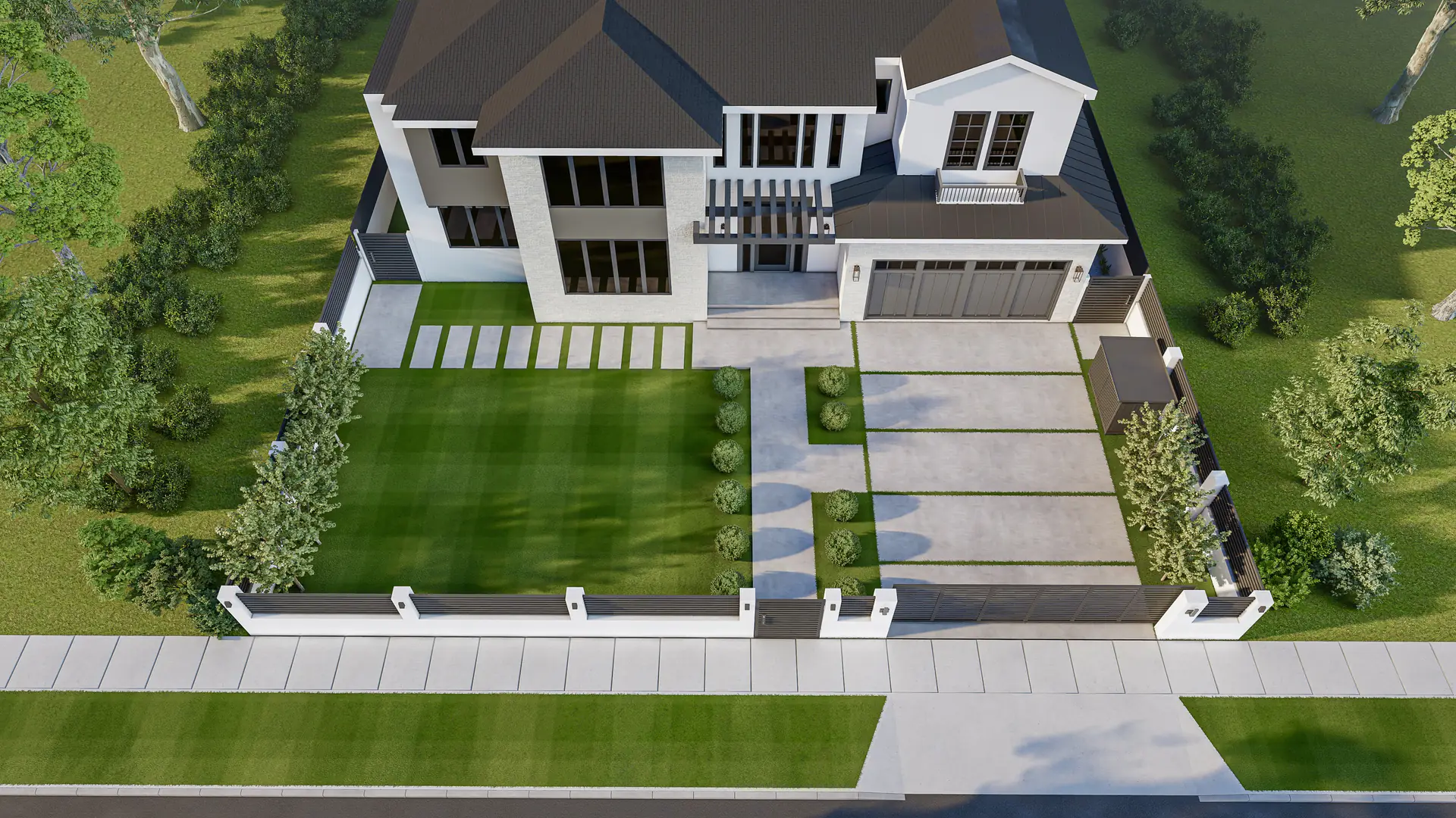 Added a custom modern fence, clean landscaping, and driveway layout with sharp lines and symmetry.