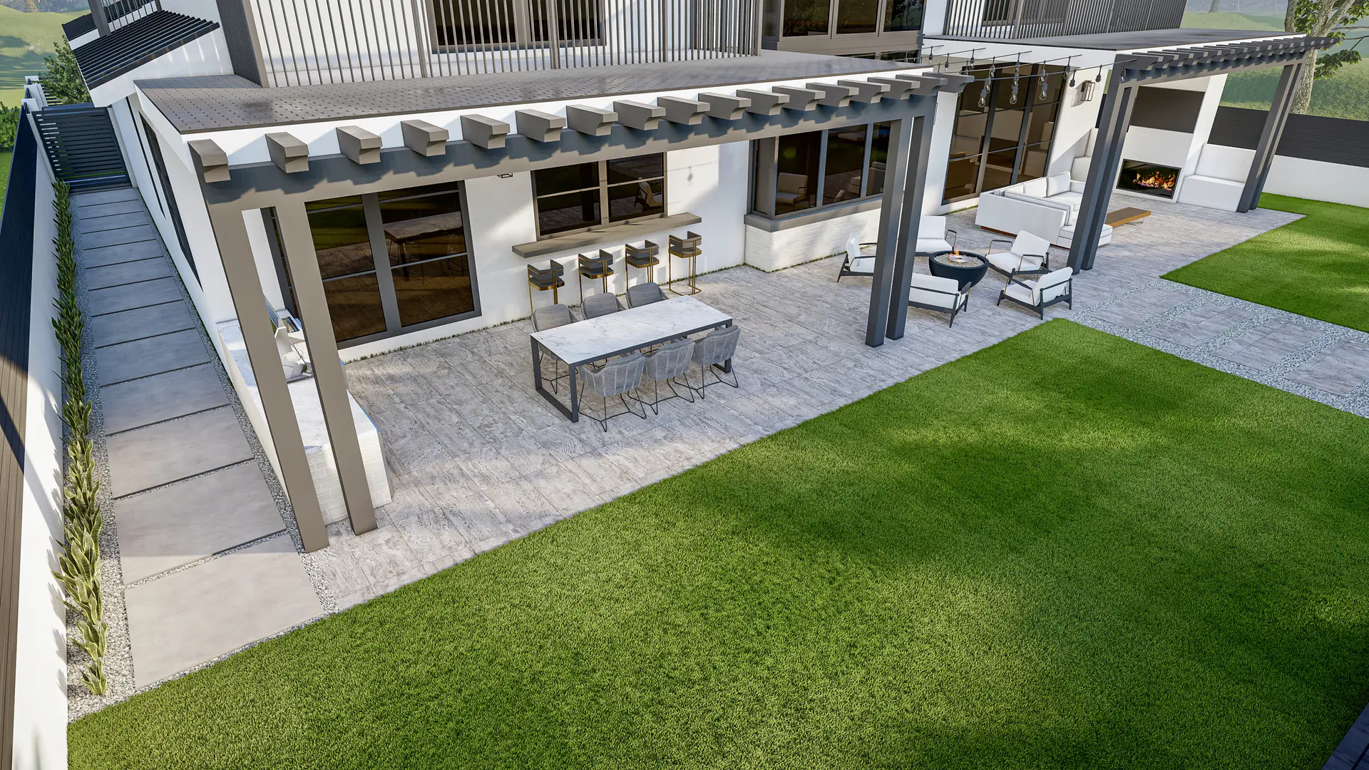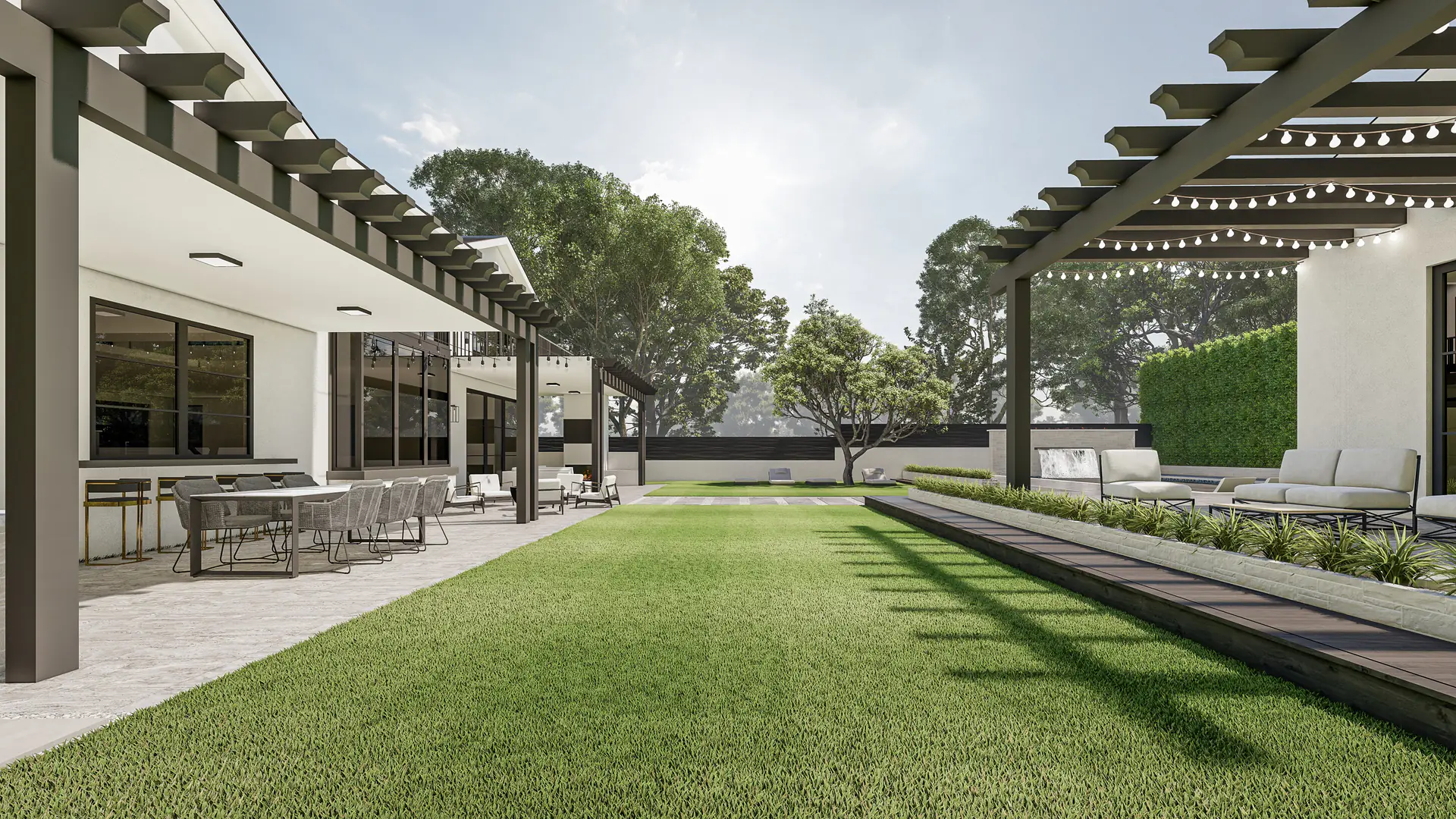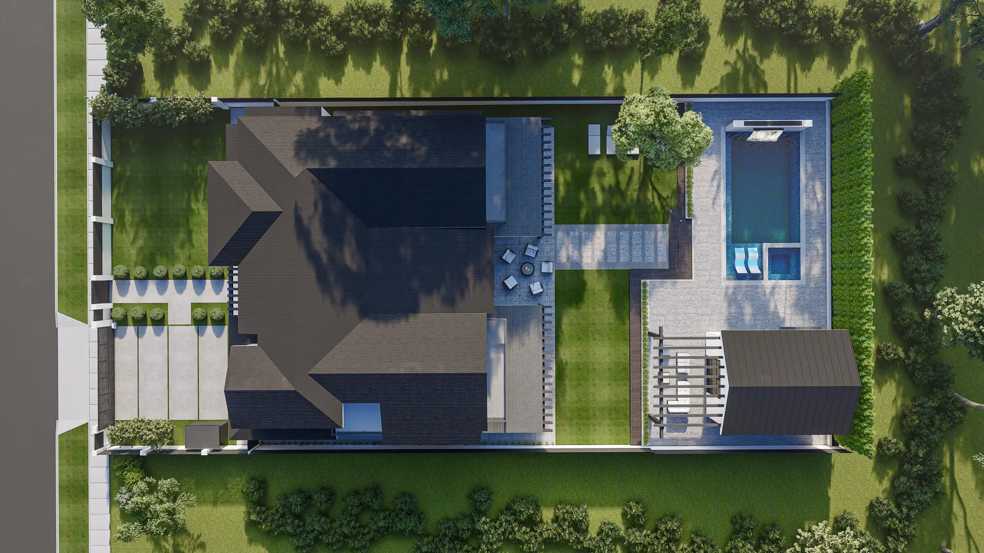 Designed a full resort-style space including a pool with integrated spa, fire pit lounge, outdoor kitchen, and large green areas.