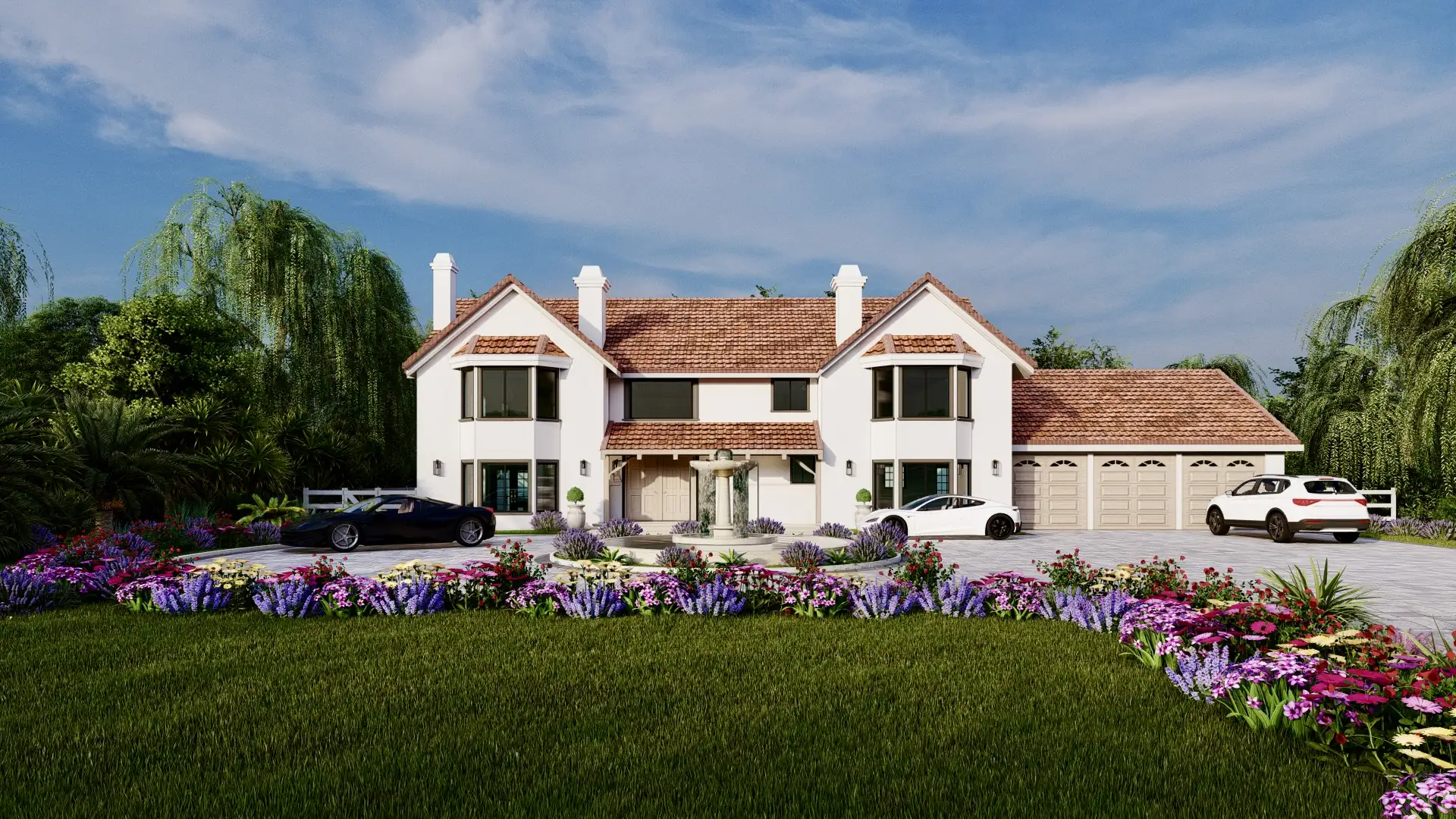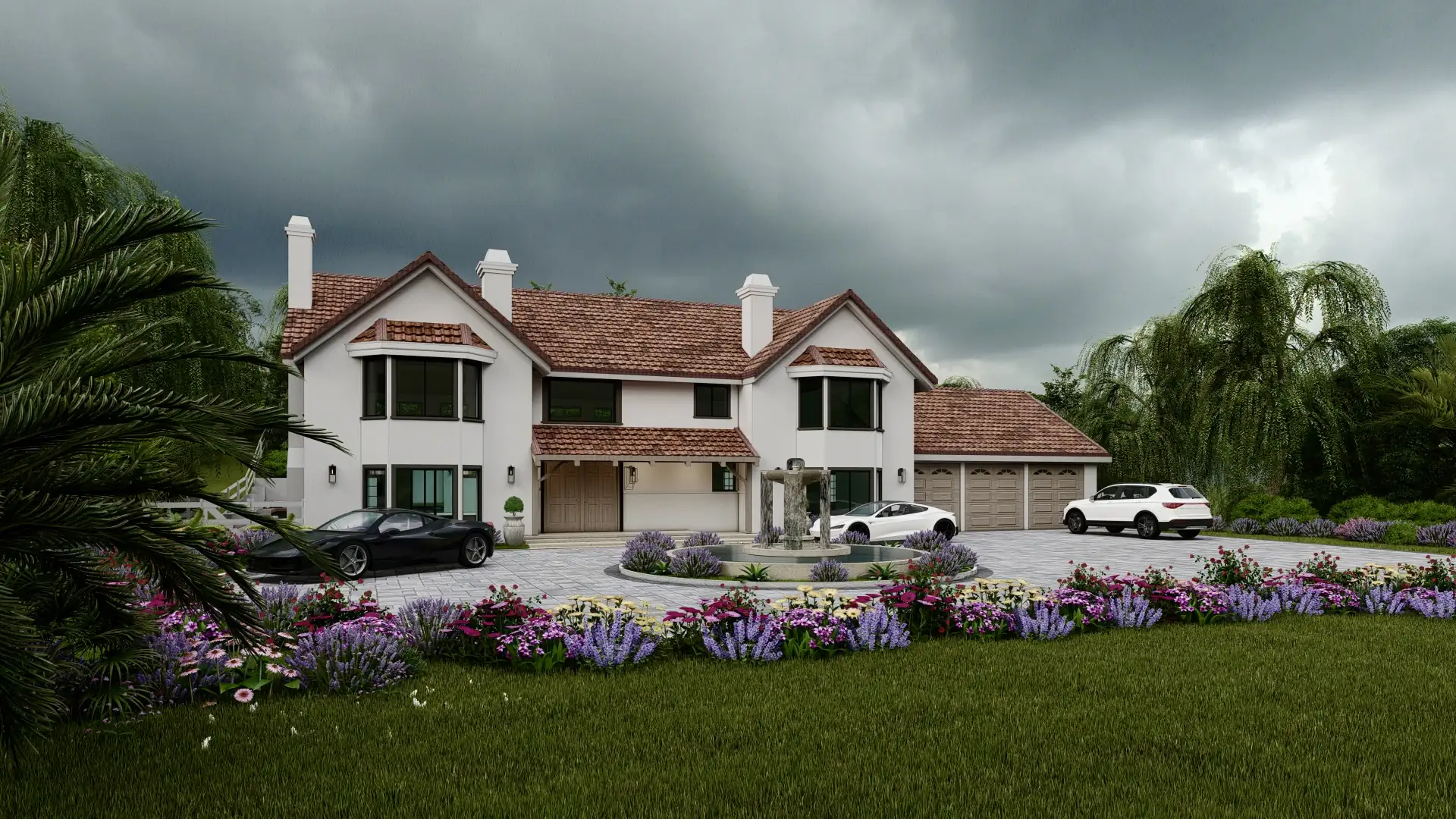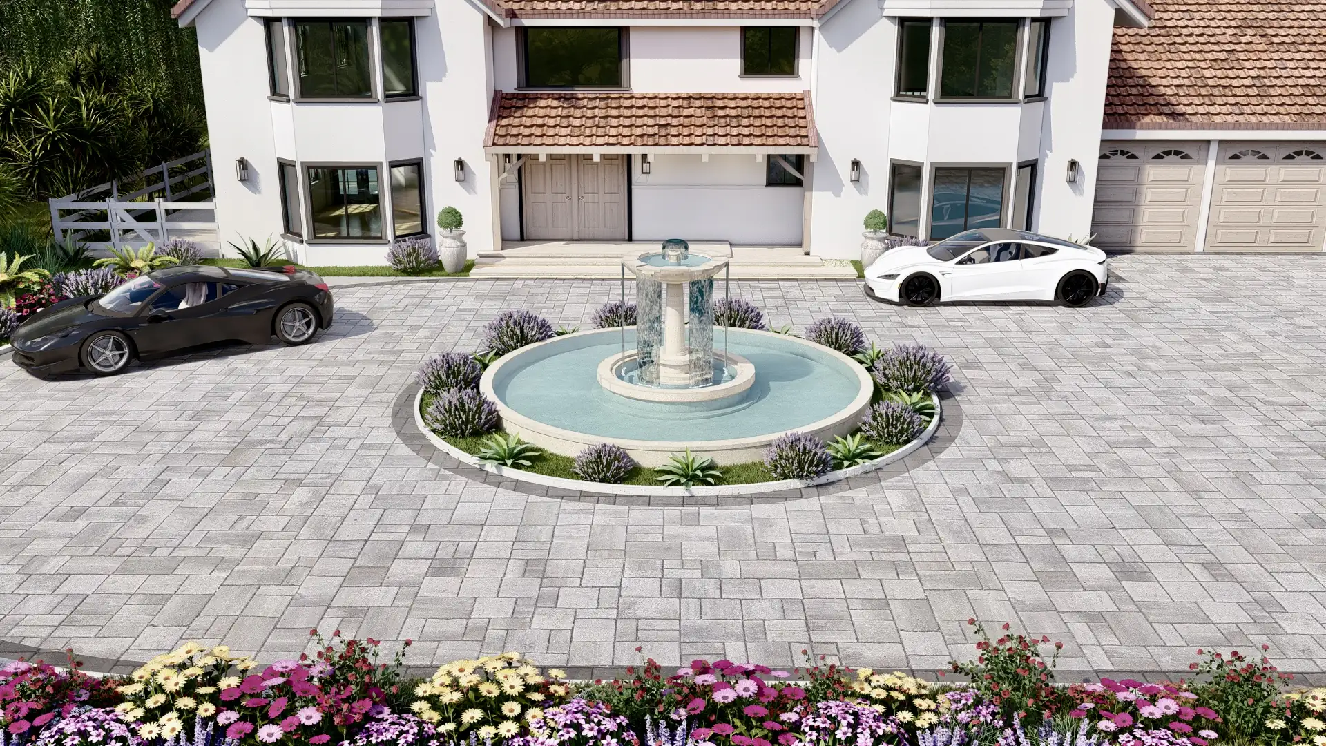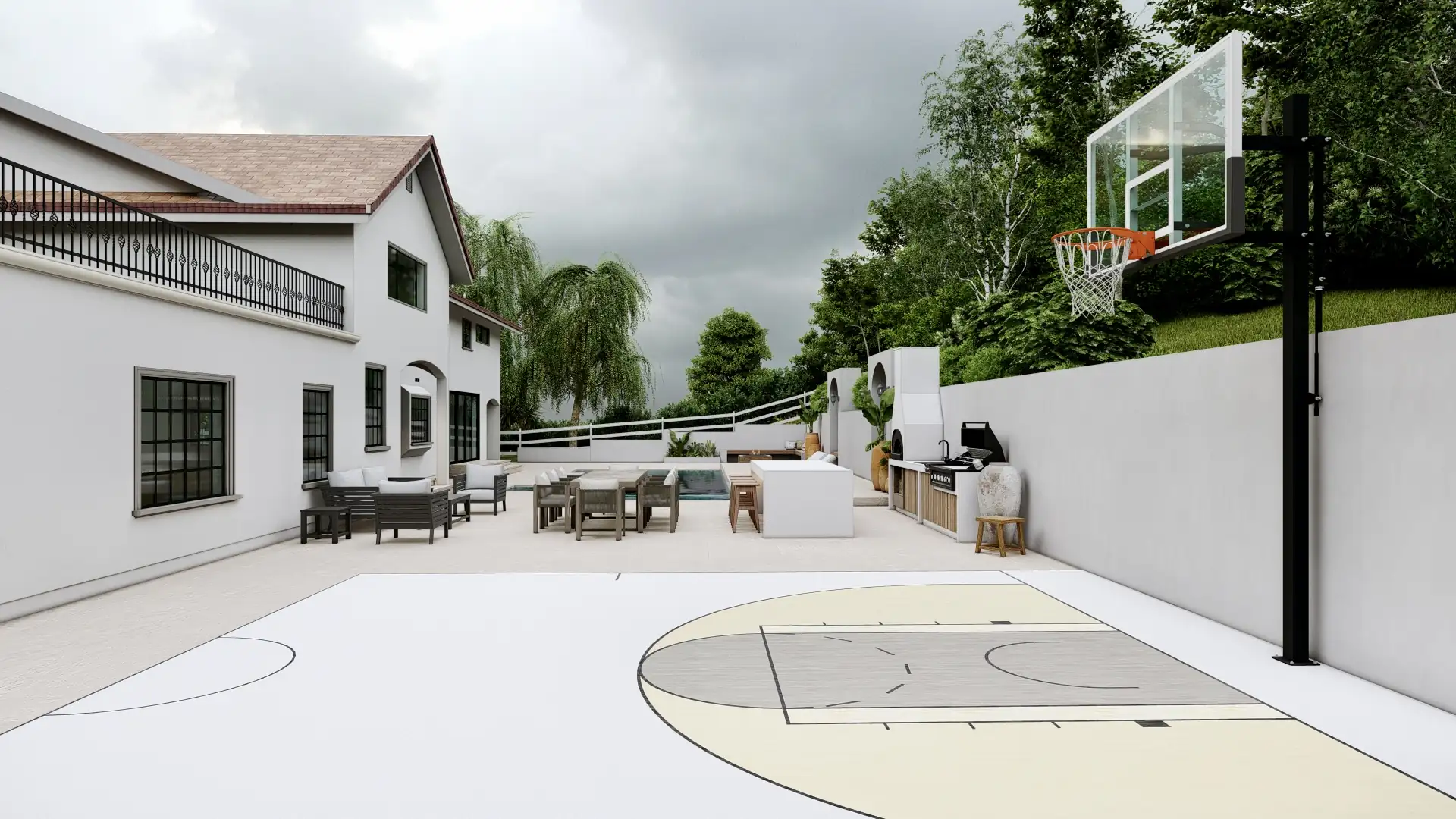 From the circular driveway with stone fountain centerpiece to the expansive pool, outdoor kitchen, and sports court, every detail balances beauty, functionality, and lifestyle.