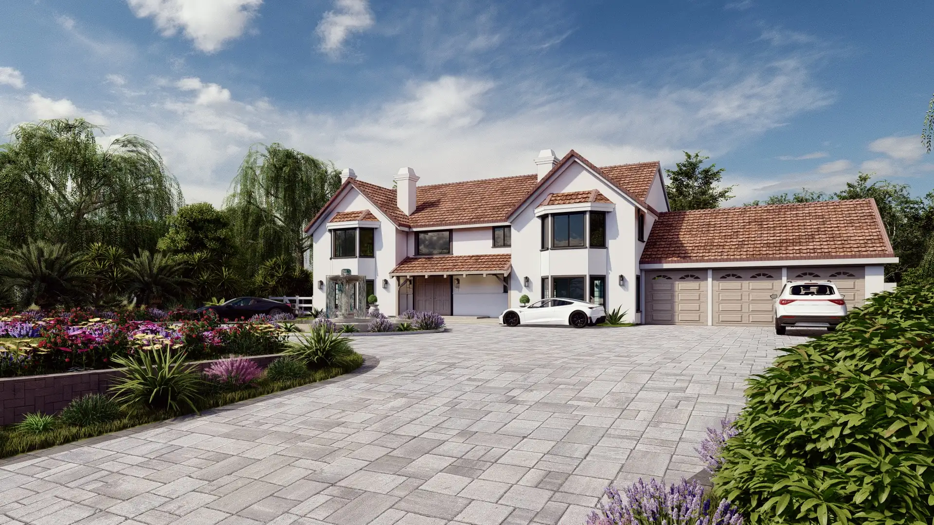 Finishes include light stone pavers, warm wood details, smooth stucco walls, and lush layered planting, creating a balanced palette across all spaces.