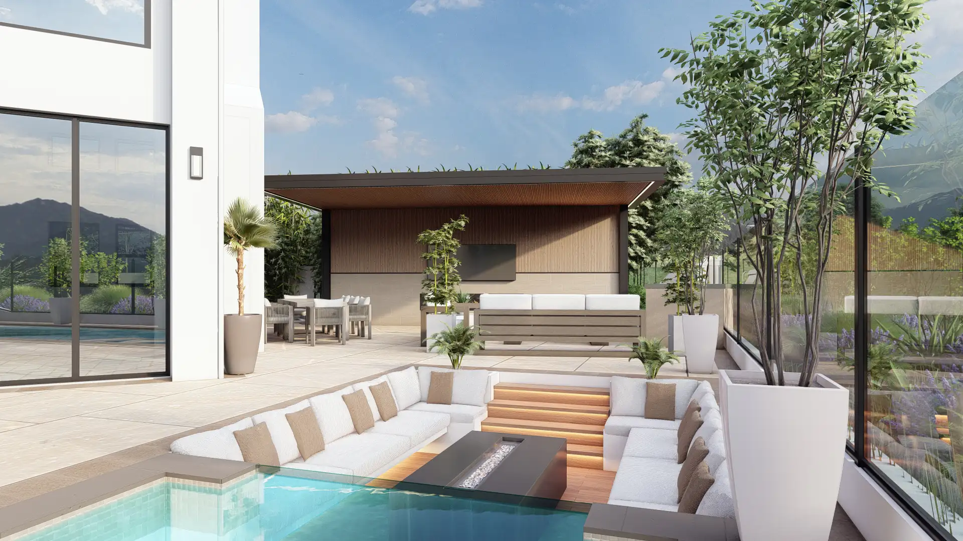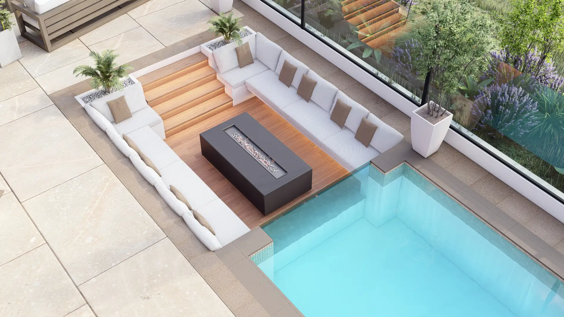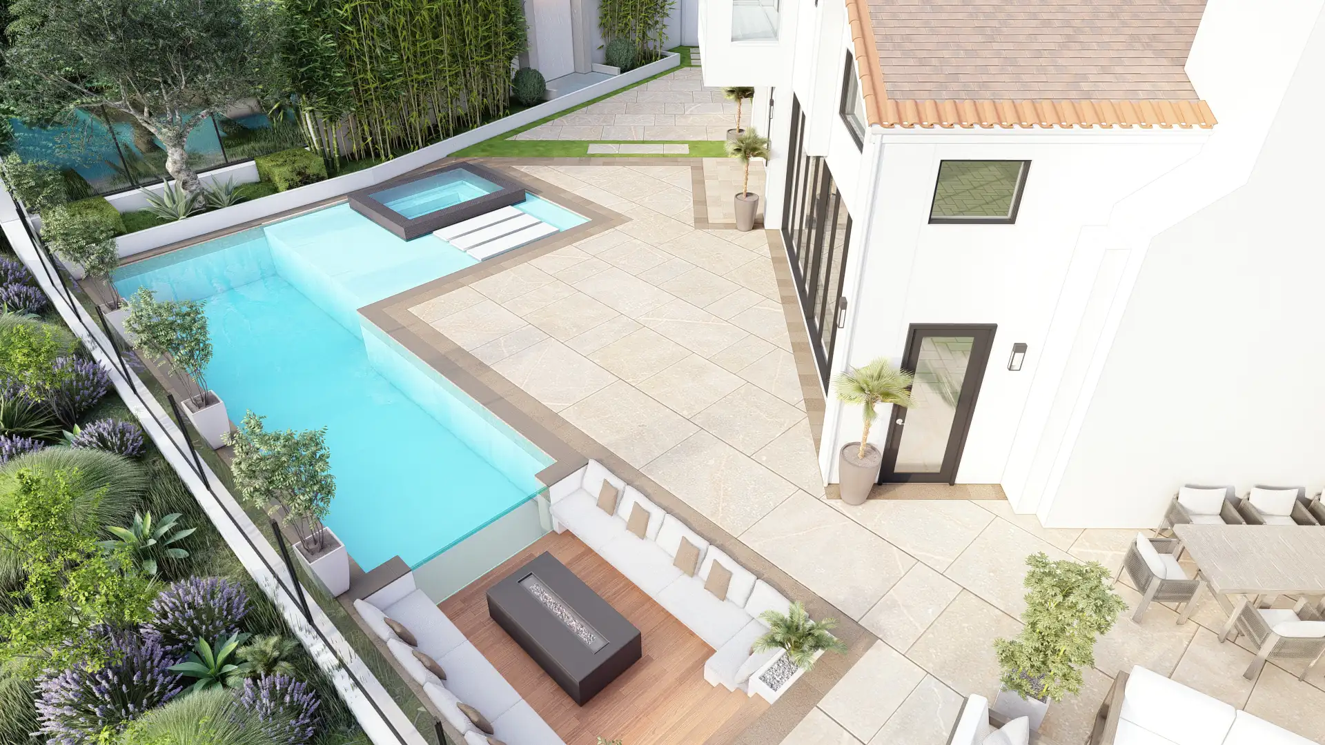 Centered around a sunken fire lounge, the layout connects poolside seating, open entertainment zones, and defined pathways for effortless flow.