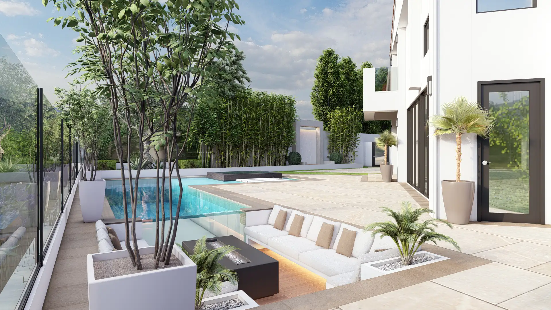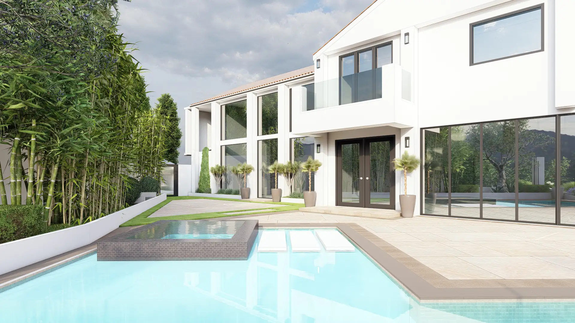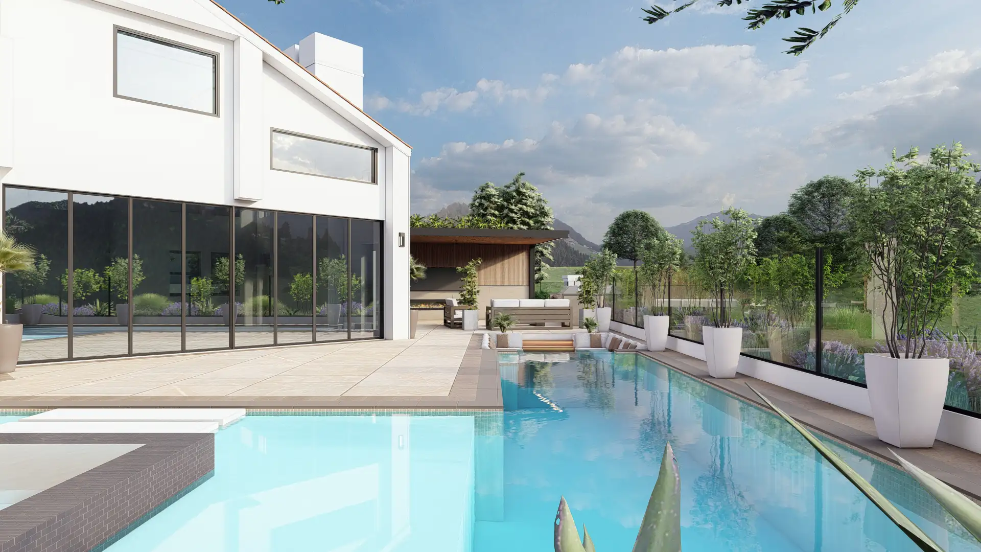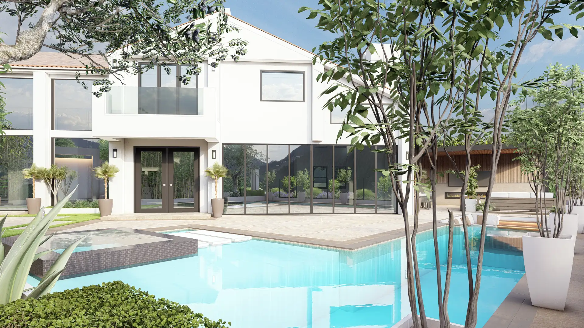 A striking zero-edge pool anchors the design, seamlessly blending water and hardscape into one continuous modern outdoor experience.