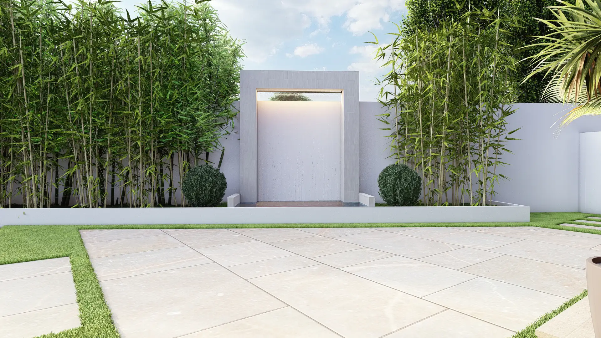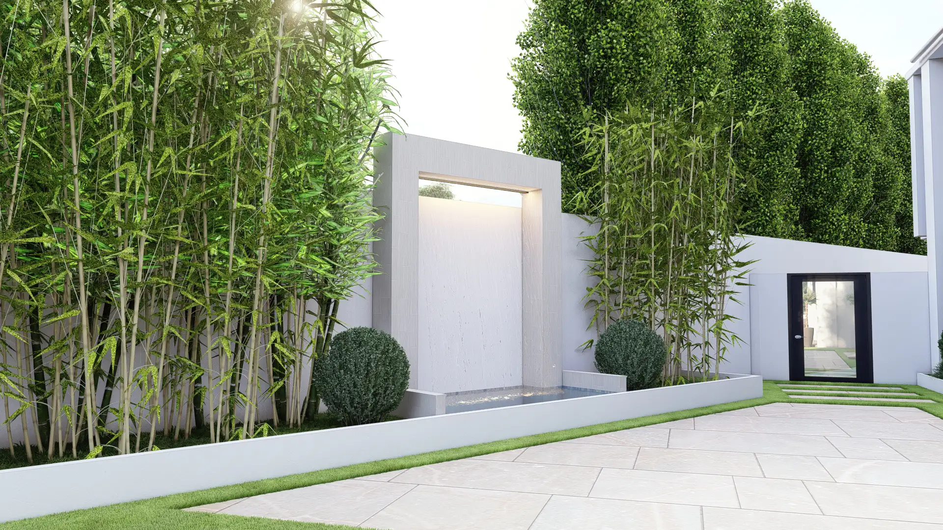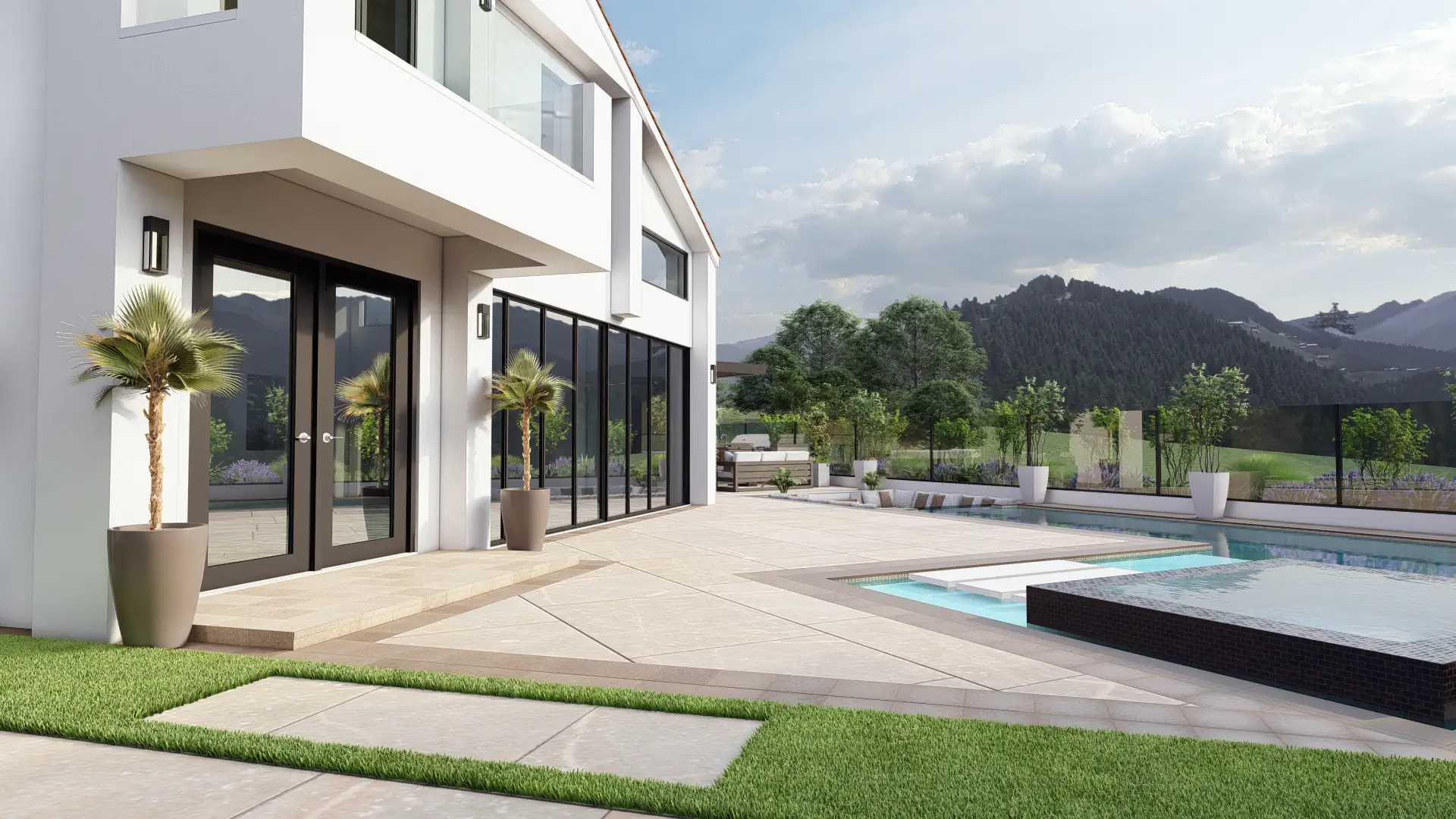 Finishes include smooth concrete decking, aluminum detailing, and carefully placed accent lighting highlighting textures, water edges, and fire features.