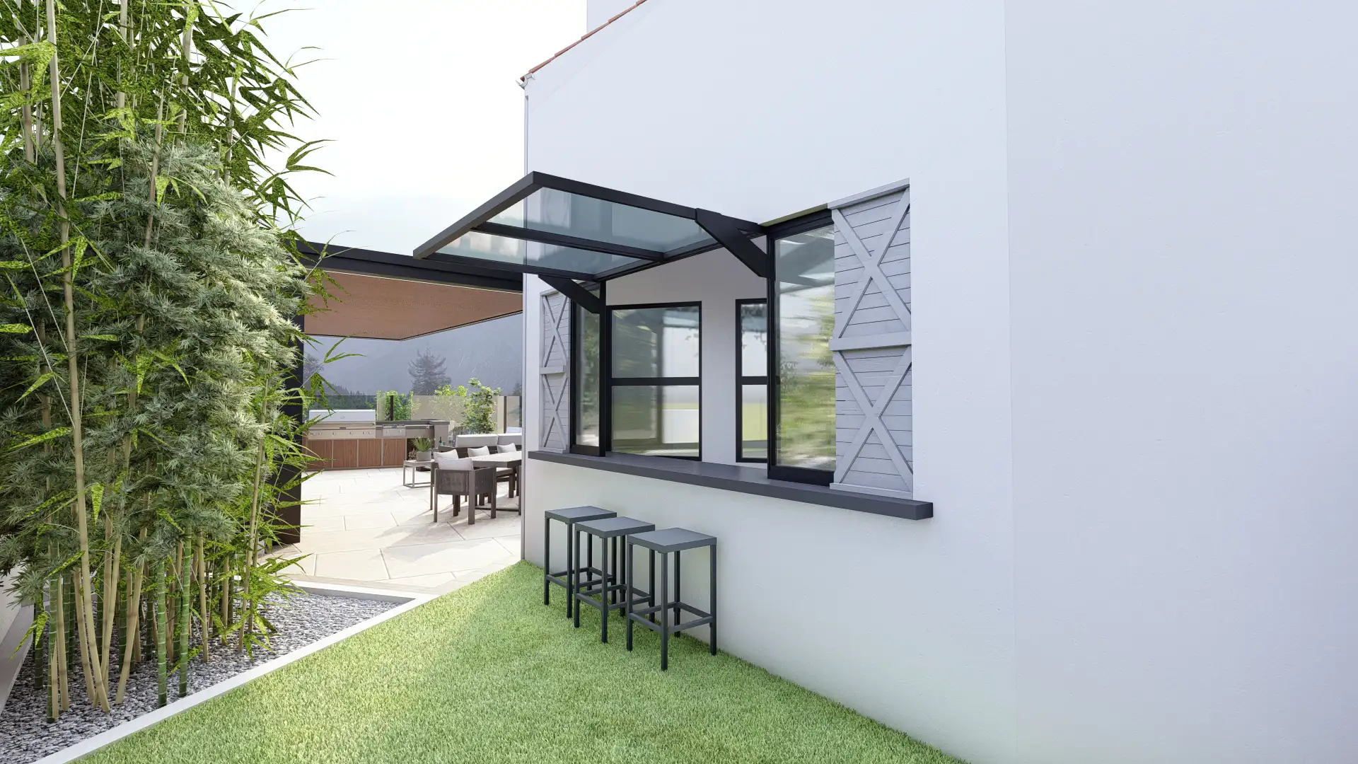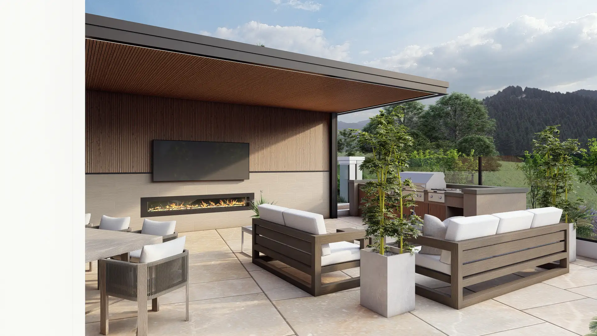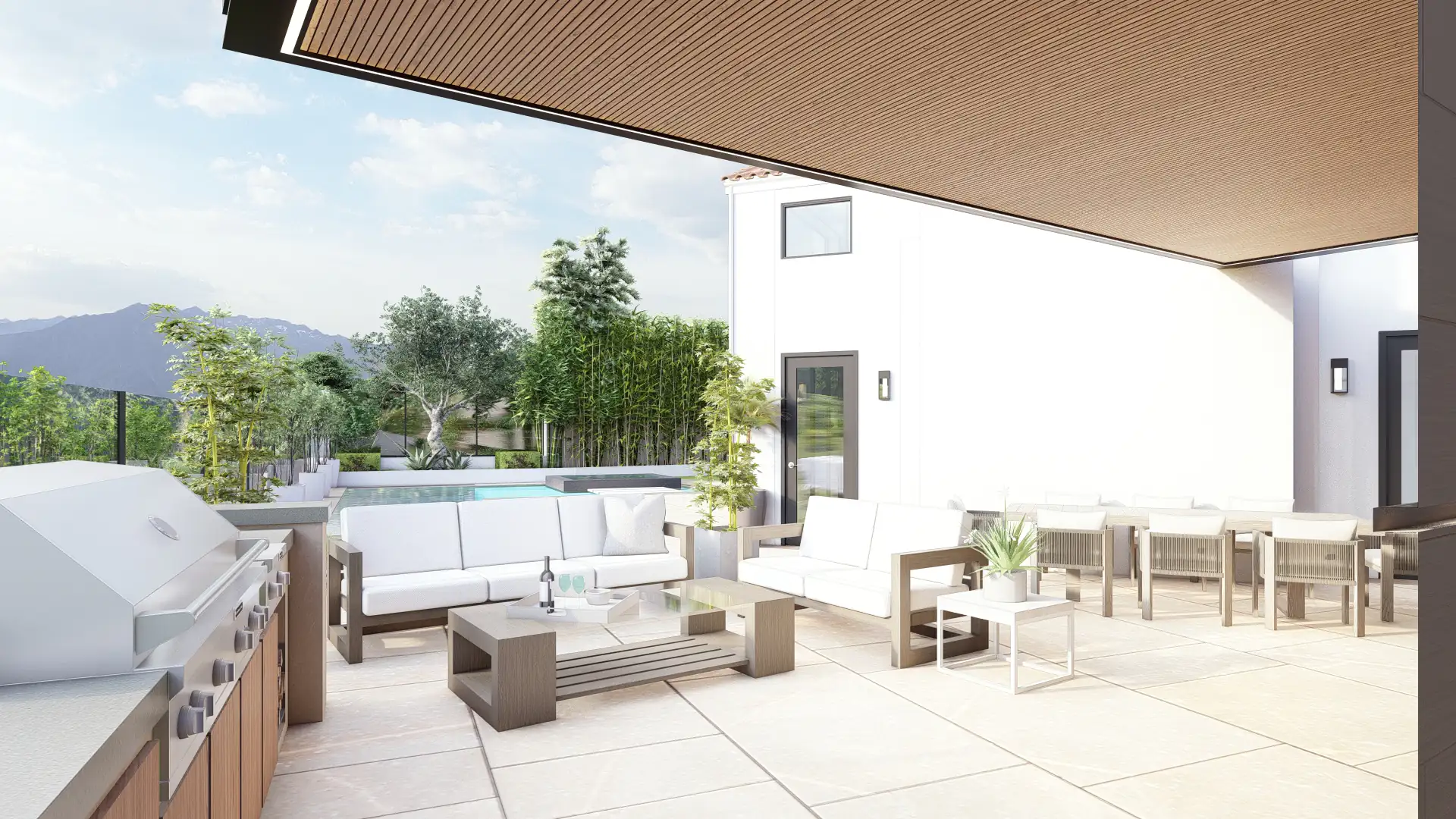 The outdoor kitchen features sleek stone countertops, a premium grill station, and integrated storage, framed by a bold cantilever patio cover.