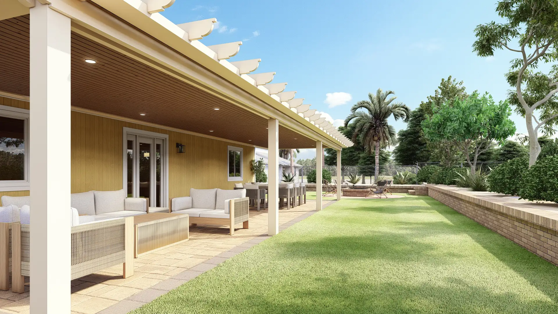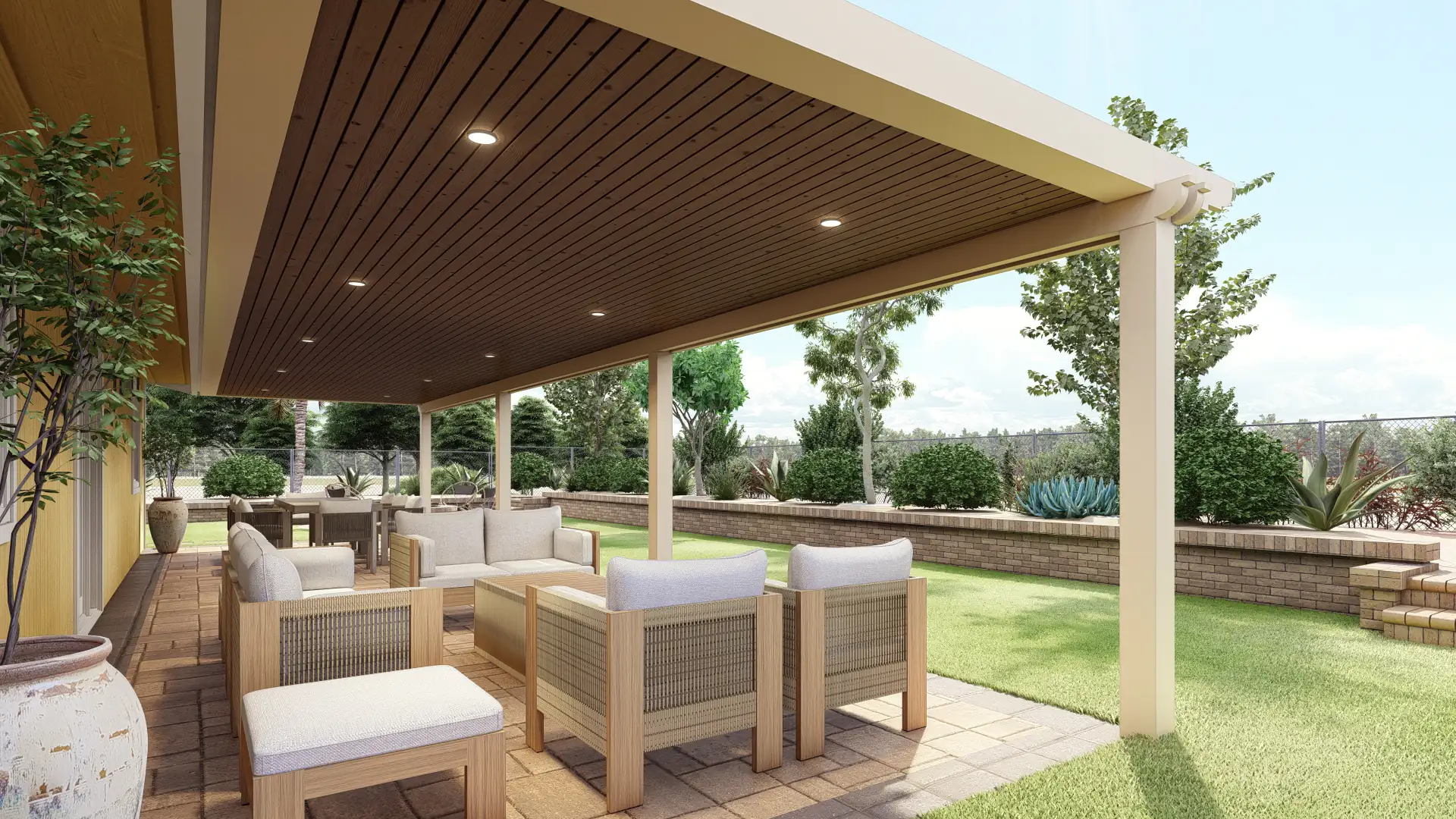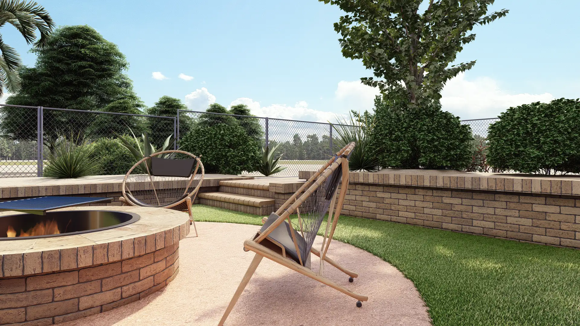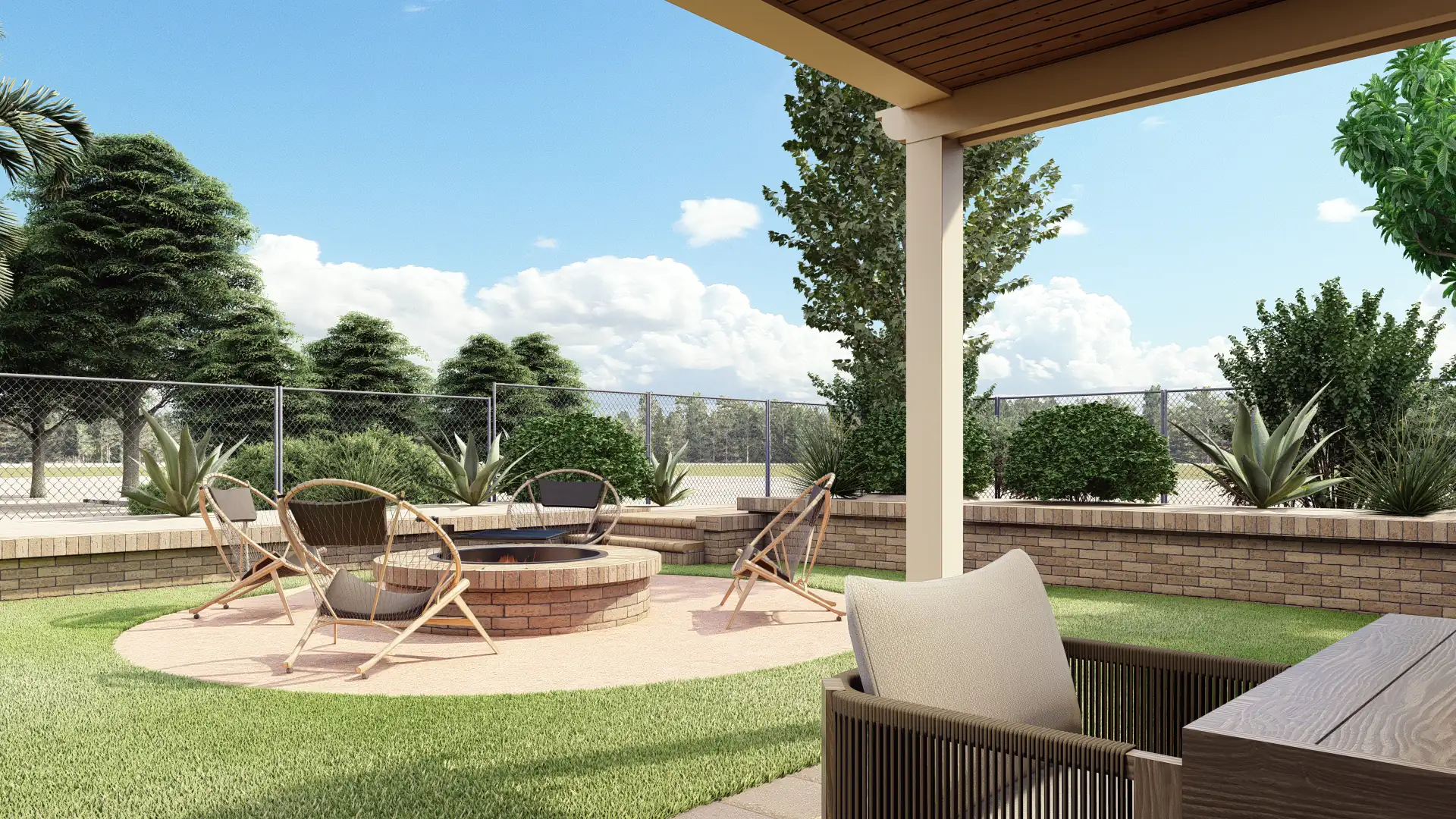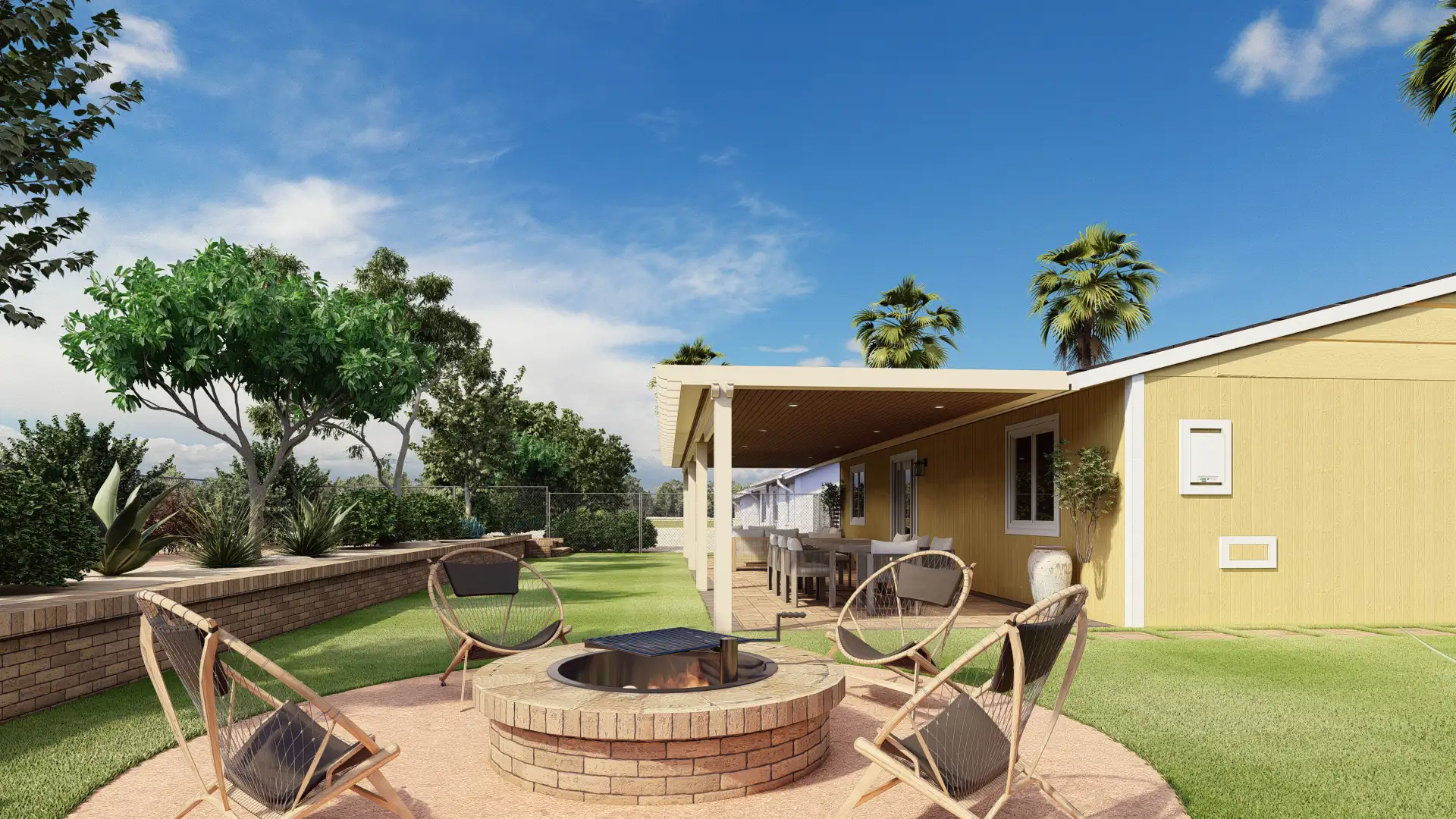 A thoughtfully planned fire pit area with circular stonework anchors the yard, while the extended patio cover frames outdoor dining and lounge space, bringing balance between open-air relaxation and shaded gatherings.