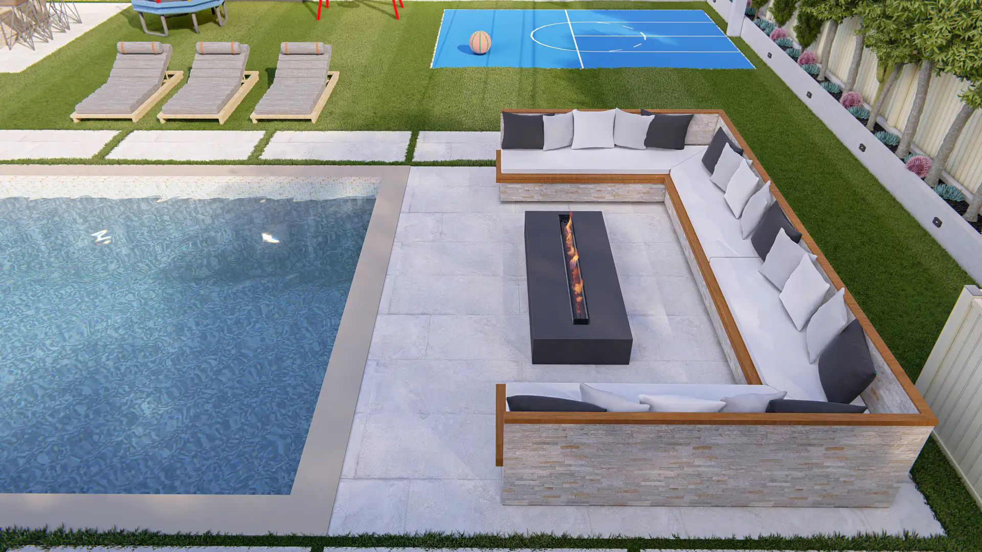 The pool anchors the space with tanning ledge loungers, raised spa, and an adjacent sunken firepit lounge. Beyond the pool, a half-court for basketball, trampoline, and swings create active zones for kids while loungers frame the water’s edge.