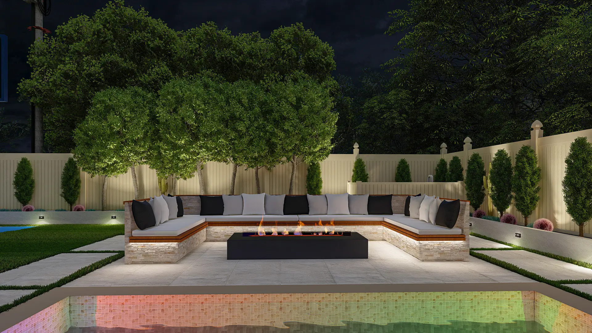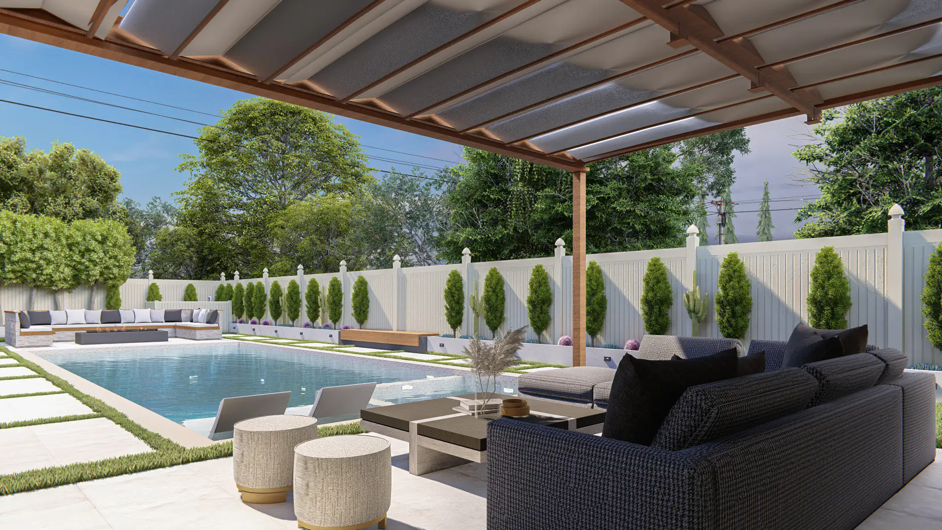 The design turns a simple backyard into a multi-zone retreat for family and guests. Featuring a pool with spa, fire lounge, outdoor kitchen, and dedicated play areas, the layout balances entertainment with relaxation..