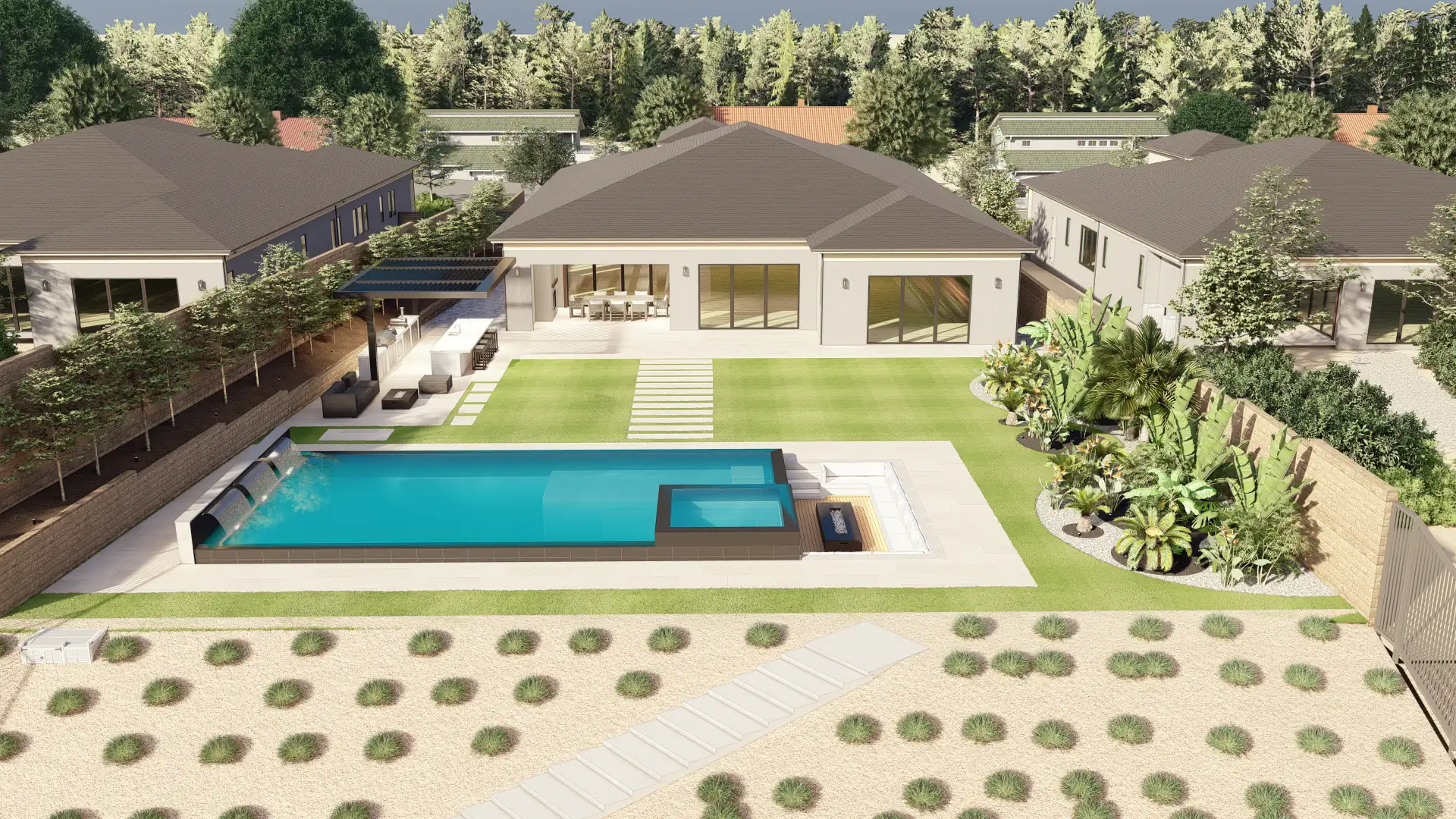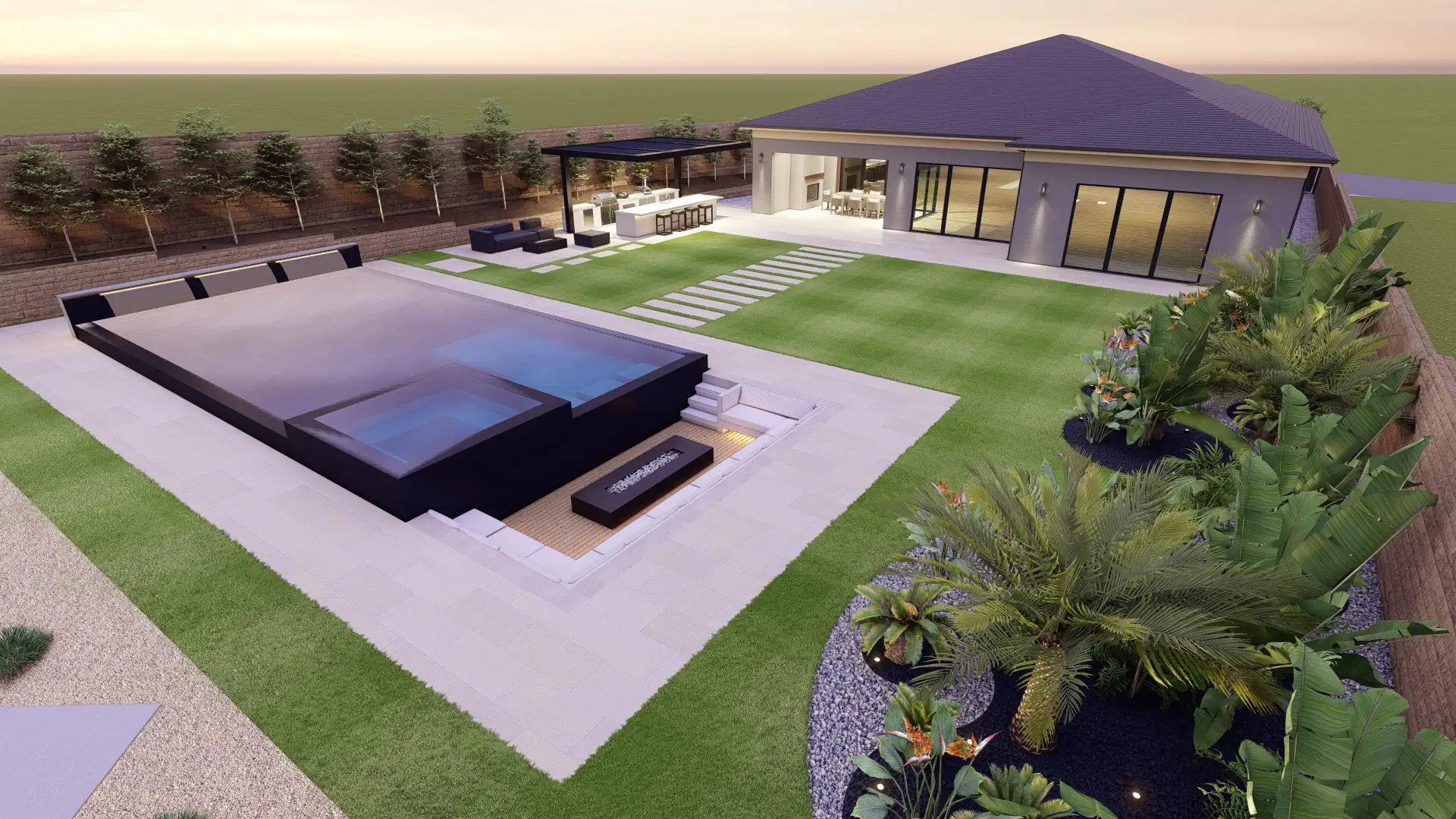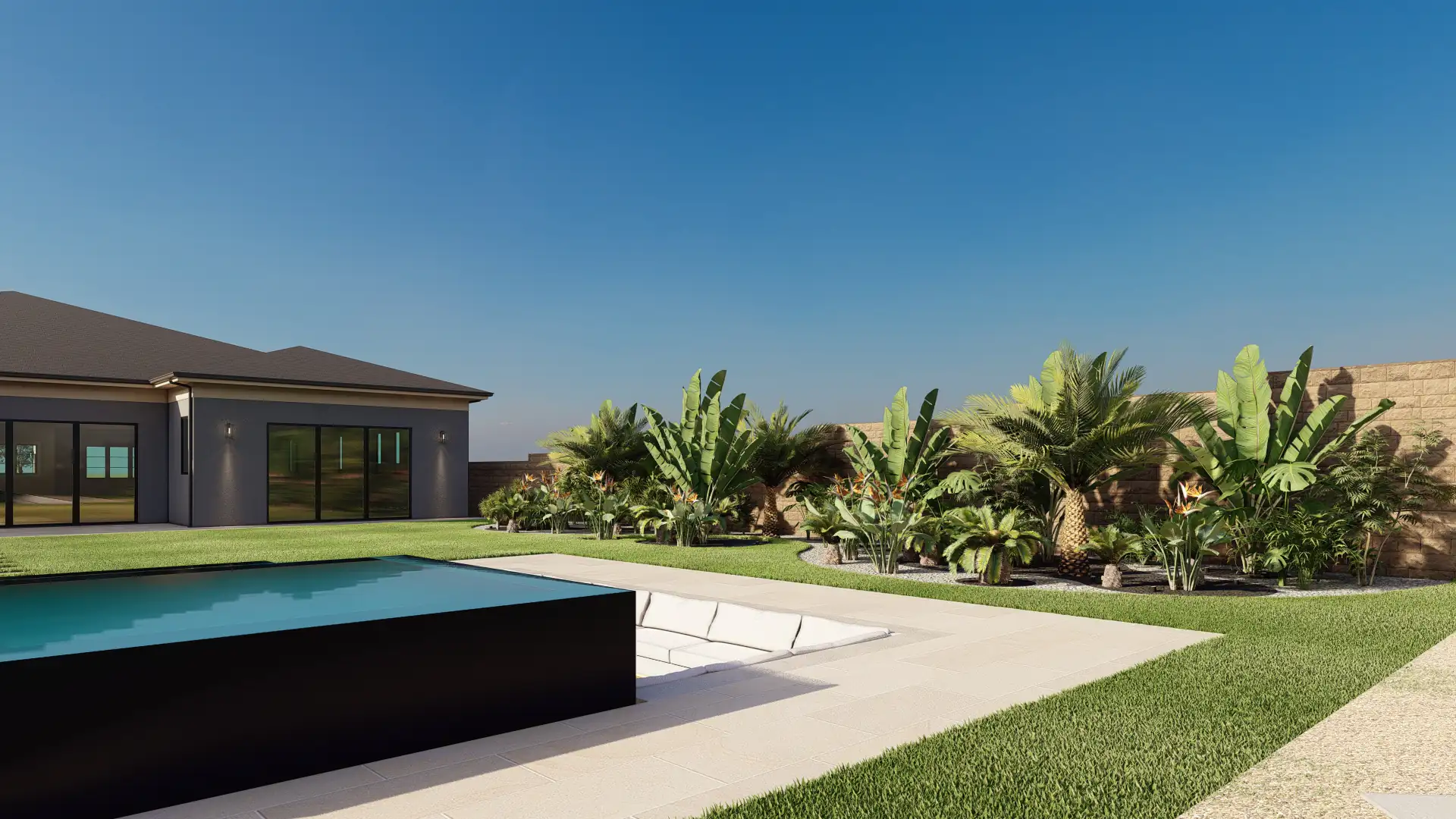 The backyard integrates tropical plantings, porcelain pavers, and clean geometry. Cantilevered shade, LED step lighting, and a zero-edge pool with raised spa establish an immersive outdoor retreat balancing modern design details with warmth, comfort, and sophistication.