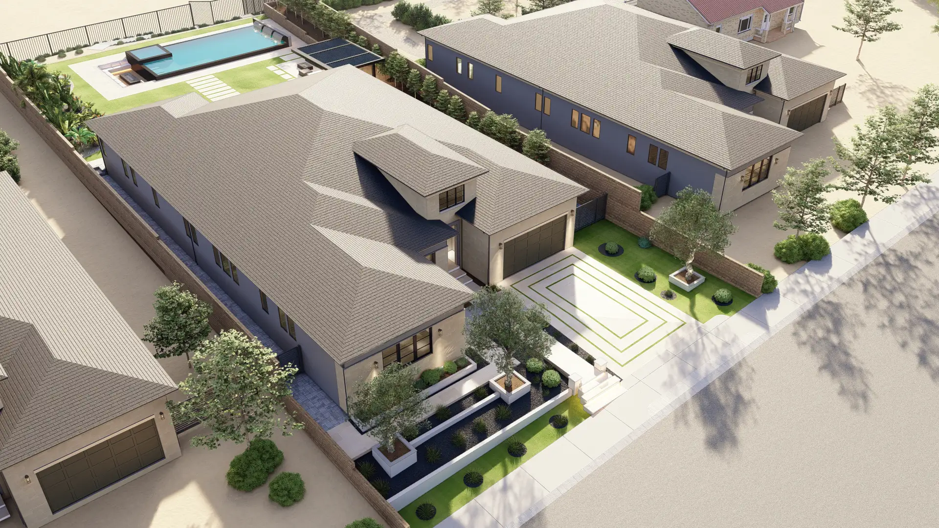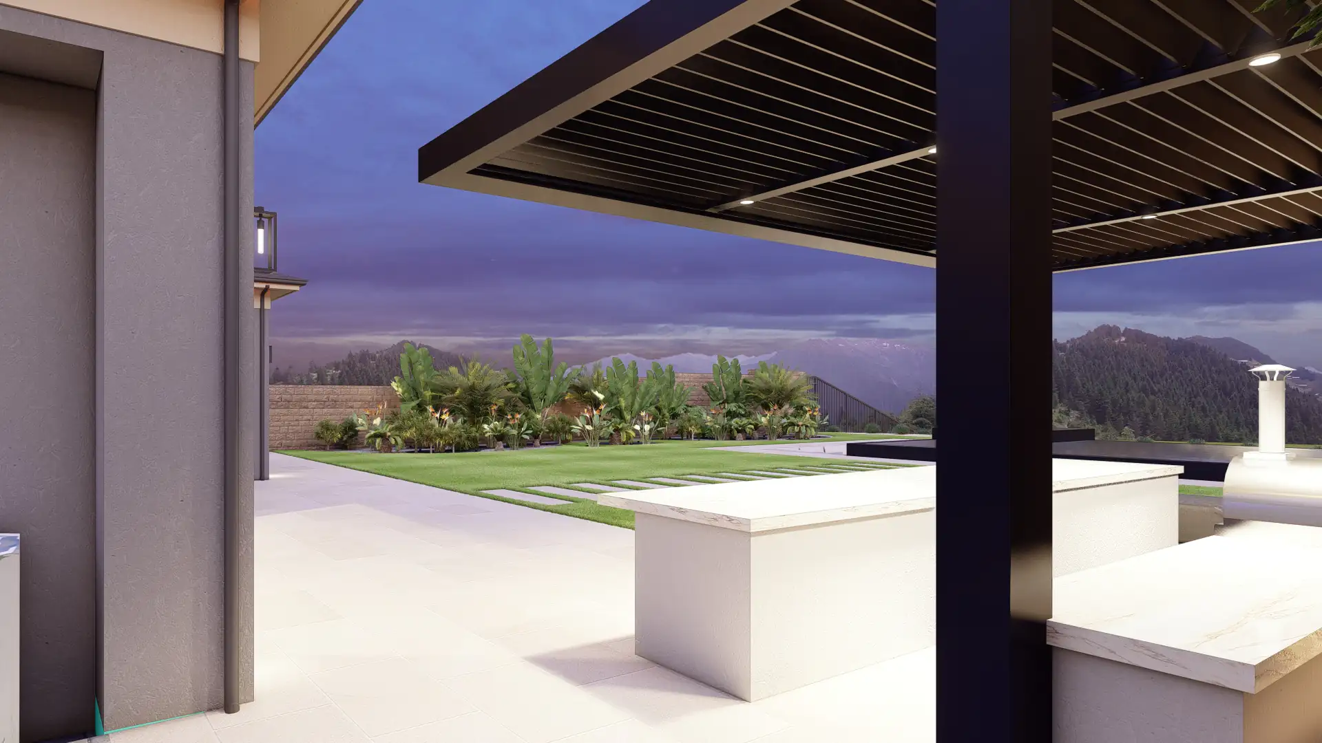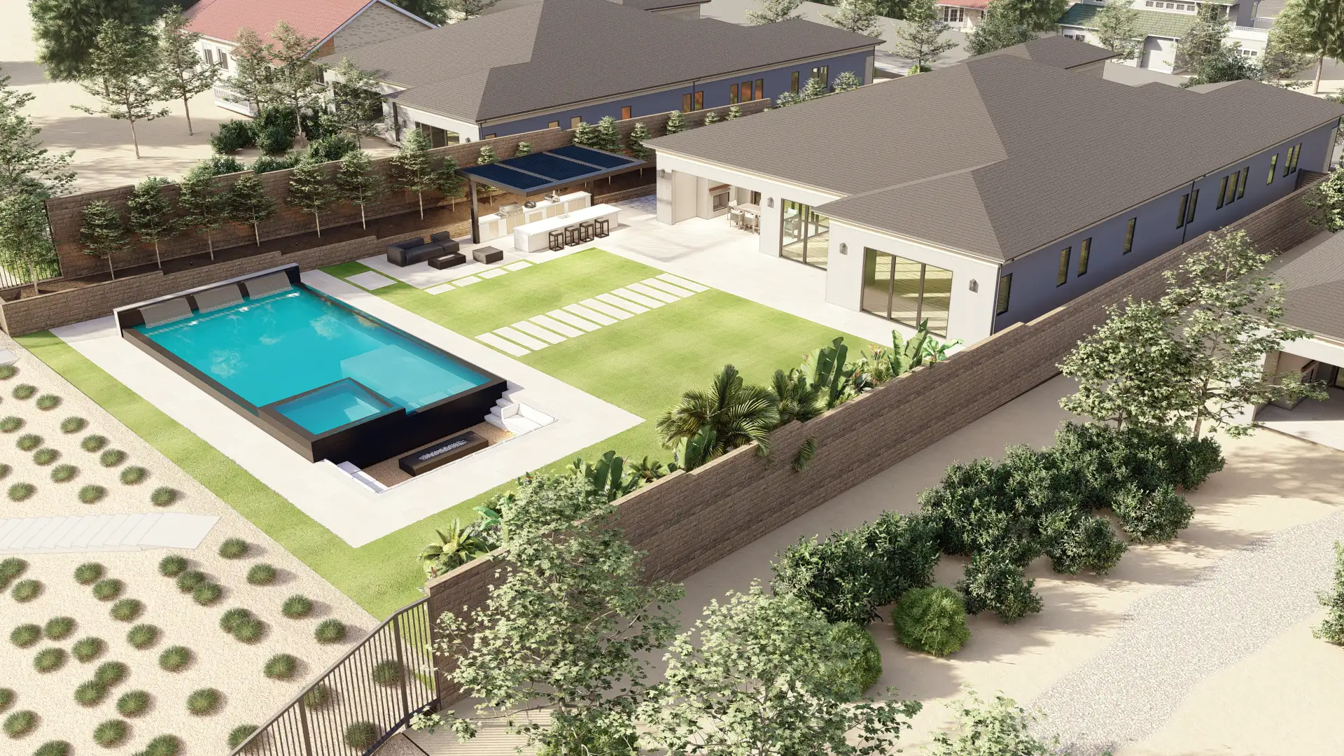 The backyard integrates tropical plantings, porcelain pavers, and clean geometry. Cantilevered shade, LED step lighting, and a zero-edge pool with raised spa establish an immersive outdoor retreat balancing modern design details with warmth, comfort, and sophistication.
