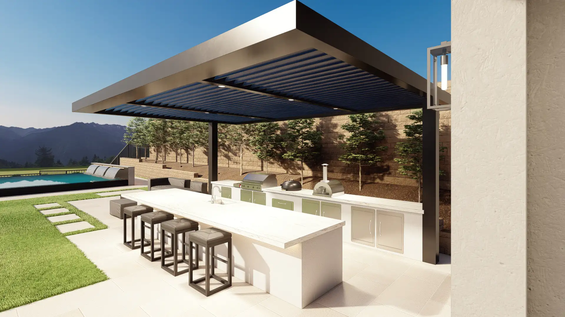 The outdoor pavilion features a cantilever aluminum patio cover with integrated lighting, a full kitchen with marble counters, built-in grill, pizza oven, bar seating, and adjacent lounge areas designed for seamless entertaining, dining, and relaxation year-round.