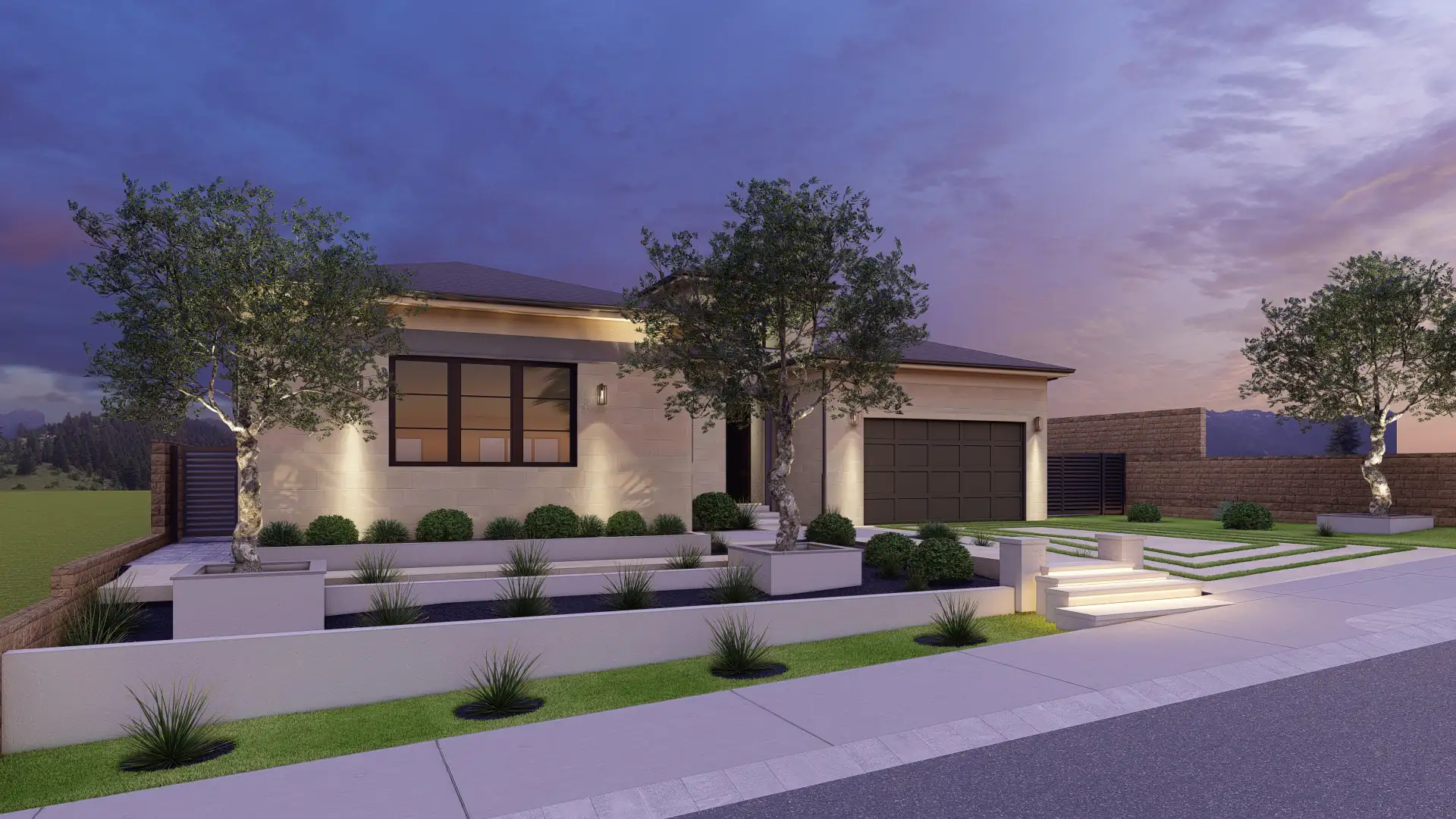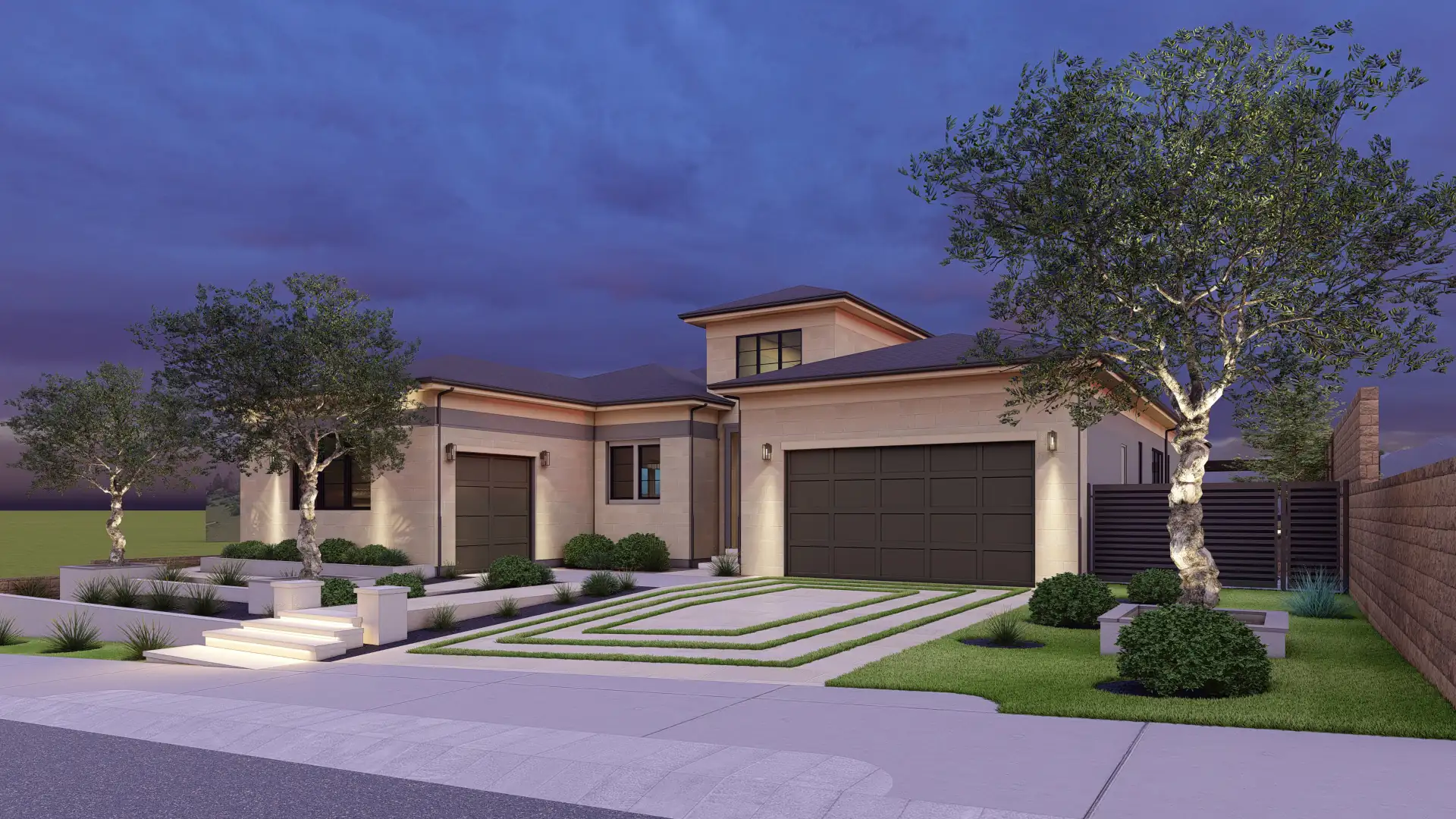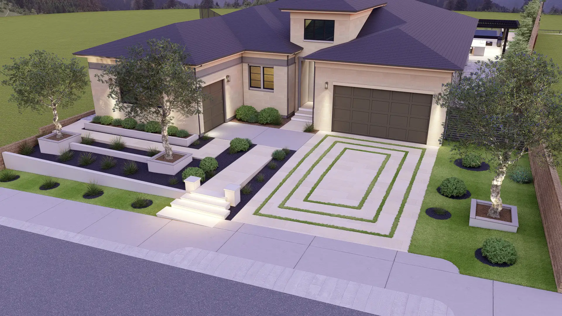 The entry showcases structured planter beds, olive trees, layered hedges, and geometric driveway lines, blending modern precision with soft greenery. Elevated steps and accent lighting create a welcoming, elegant façade that reflects the home’s architectural harmony.