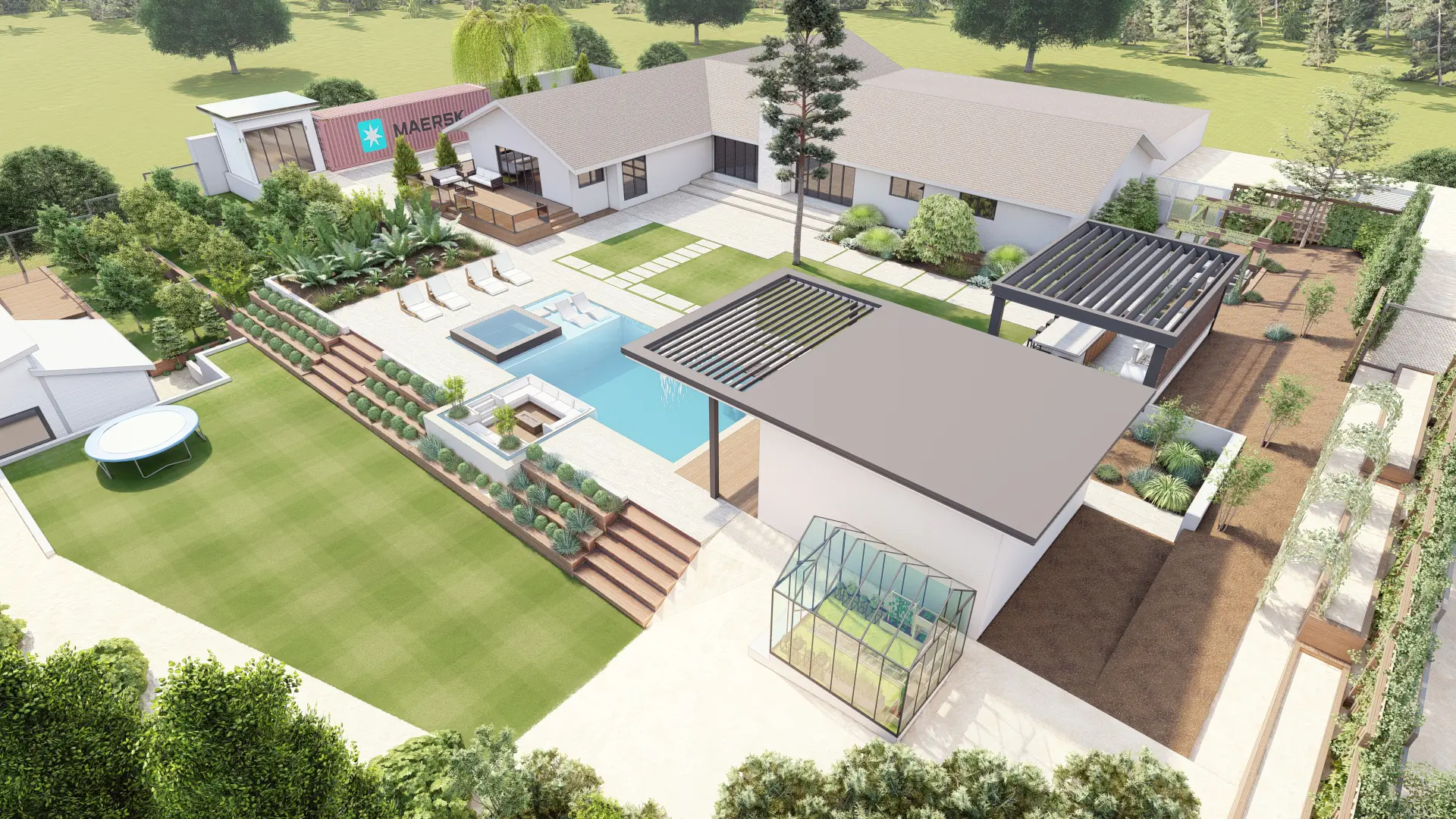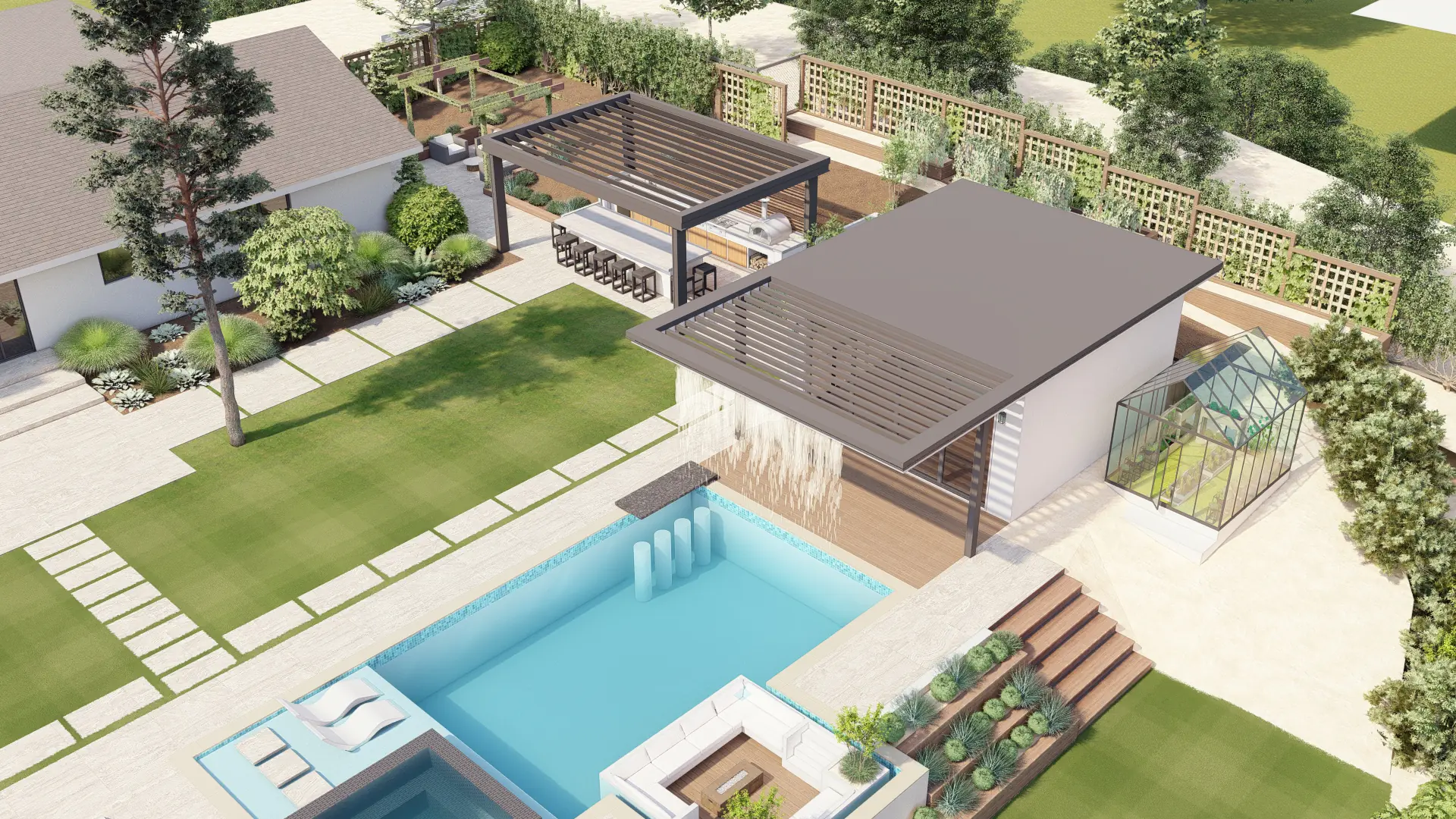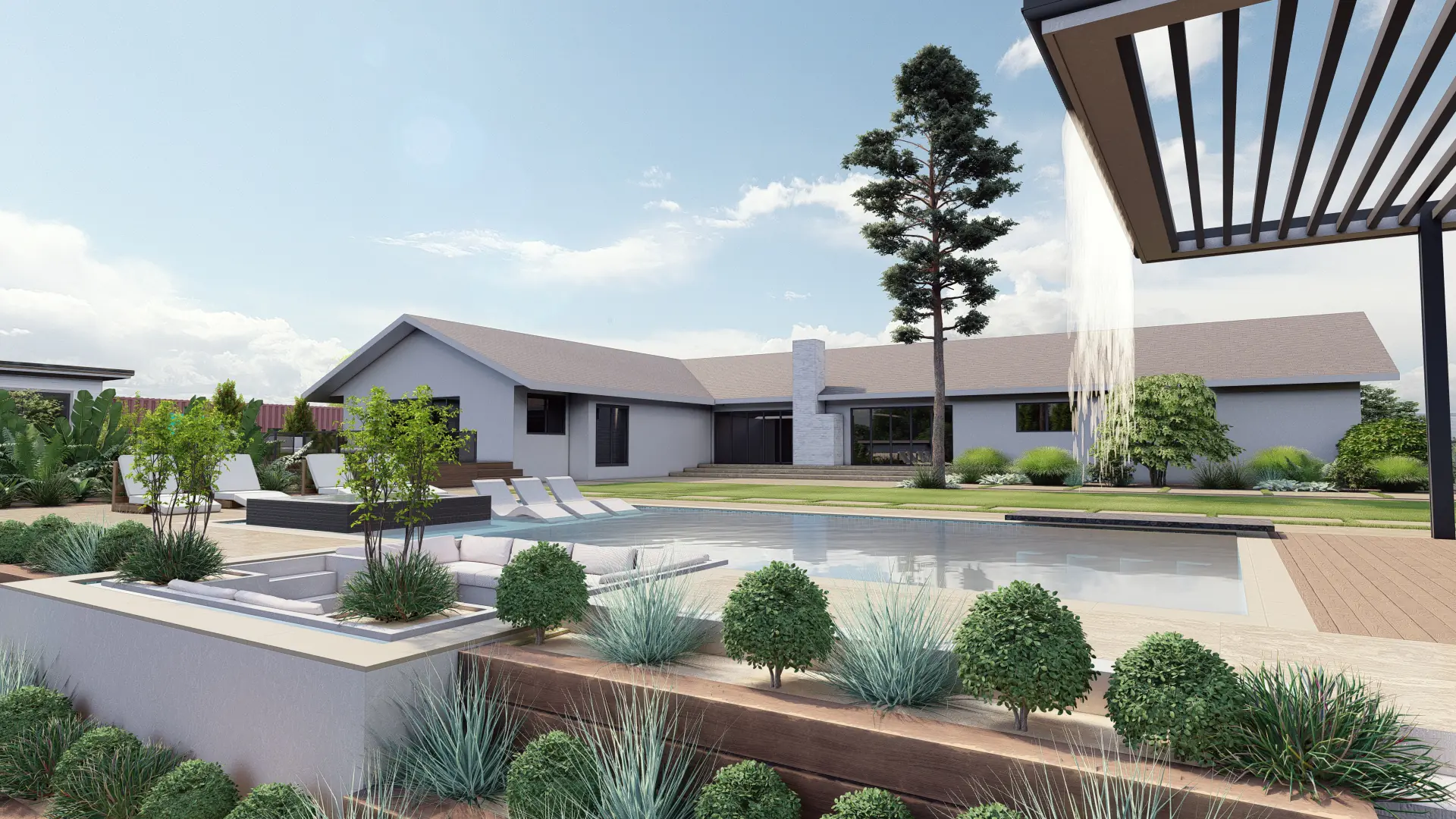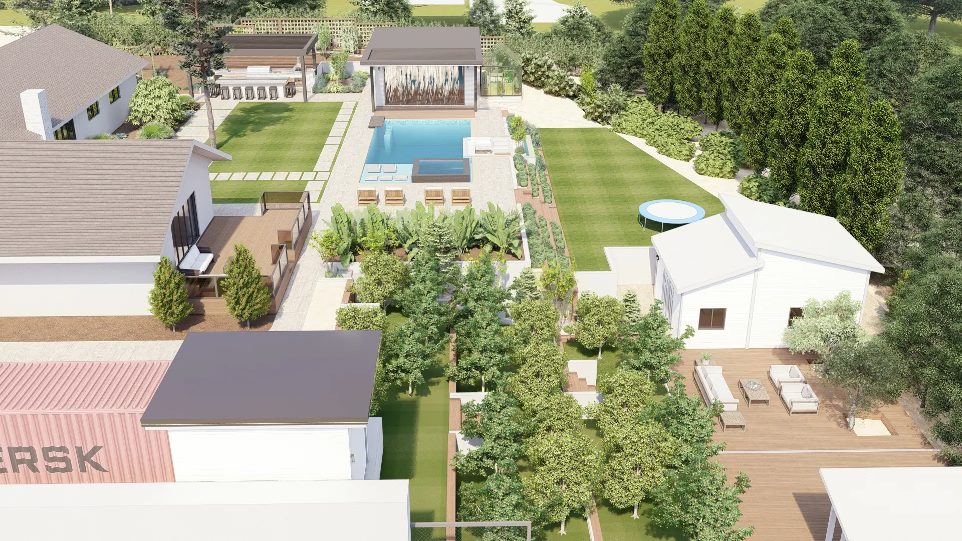 The goal of this project was to create a multi-level outdoor experience that connects functional living with natural surroundings. The design integrates orchard rows, greenhouse, and garden terraces with entertaining zones including a pool, spa, fire lounge, and kitchen.