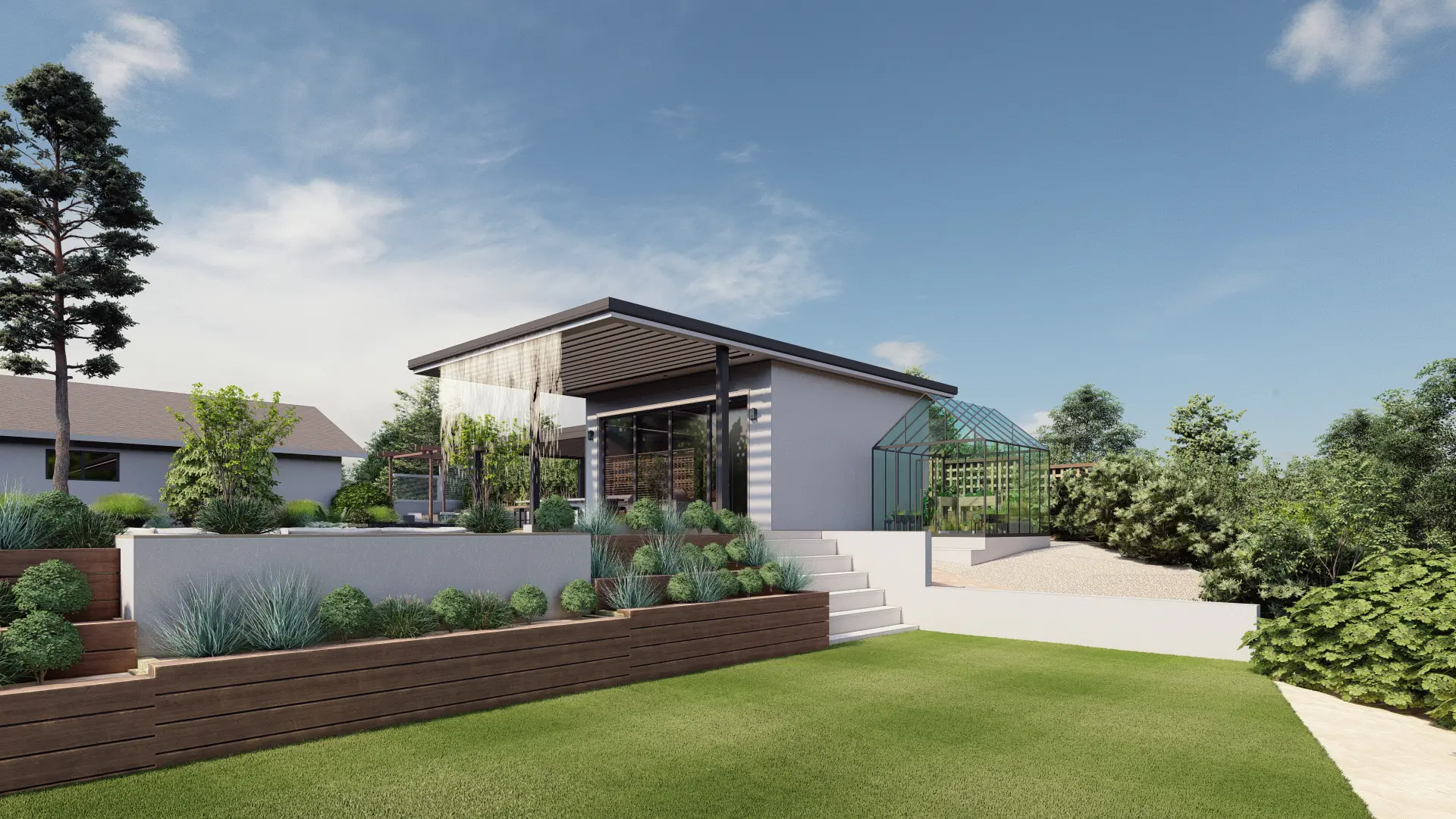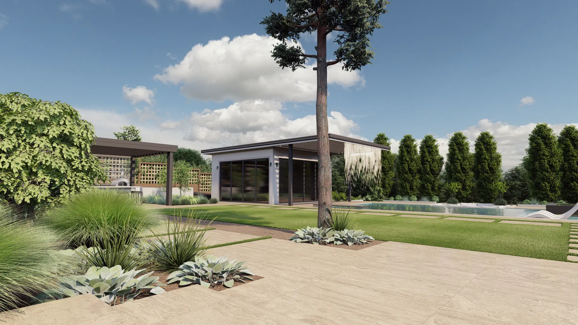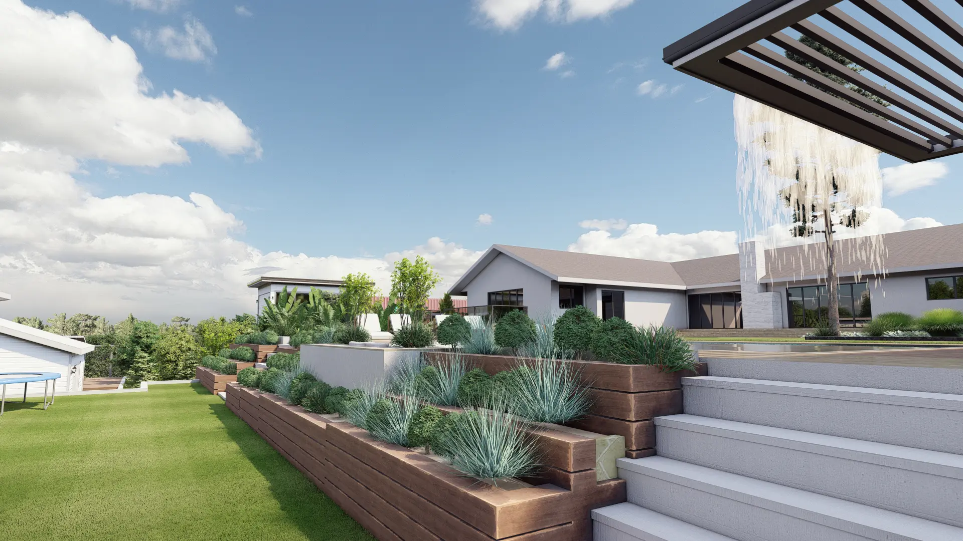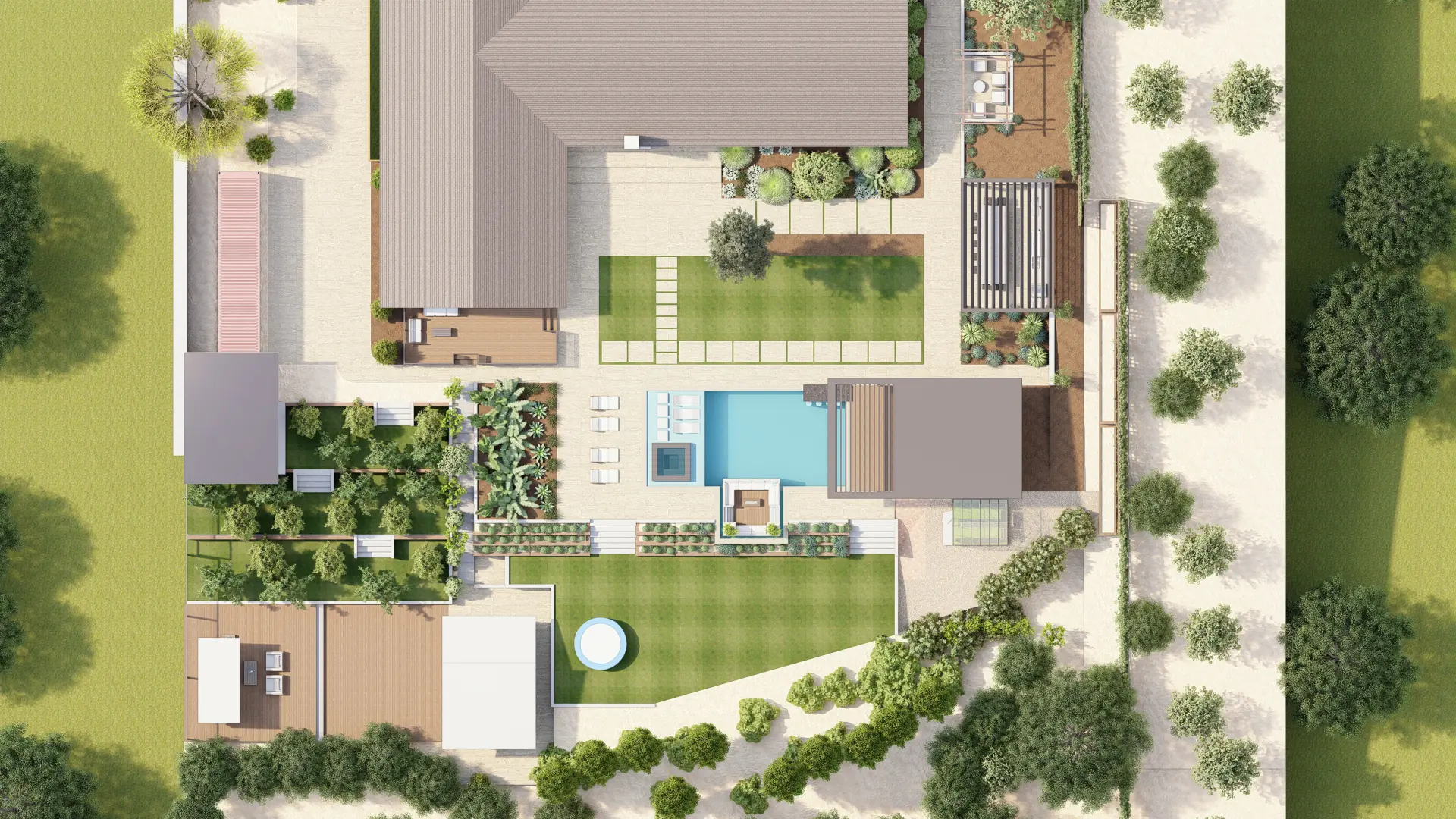 The goal of this project was to create a multi-level outdoor experience that connects functional living with natural surroundings. The design integrates orchard rows, greenhouse, and garden terraces with entertaining zones including a pool, spa, fire lounge, and kitchen.