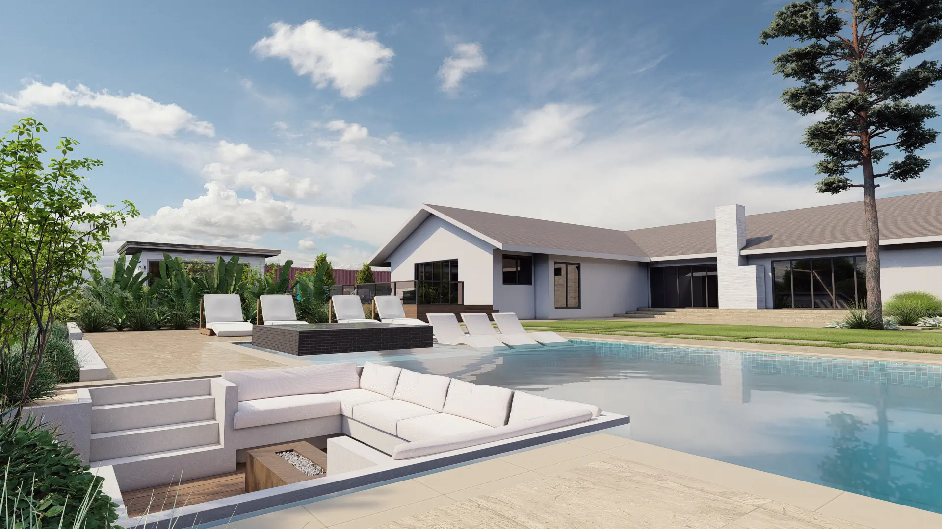 The centerpiece is a custom pool with in-water loungers, raised spa, and sunken firepit. Tiered stone steps lead to a trampoline lawn, orchard plantings, and elevated garden beds for balance of play and nature.