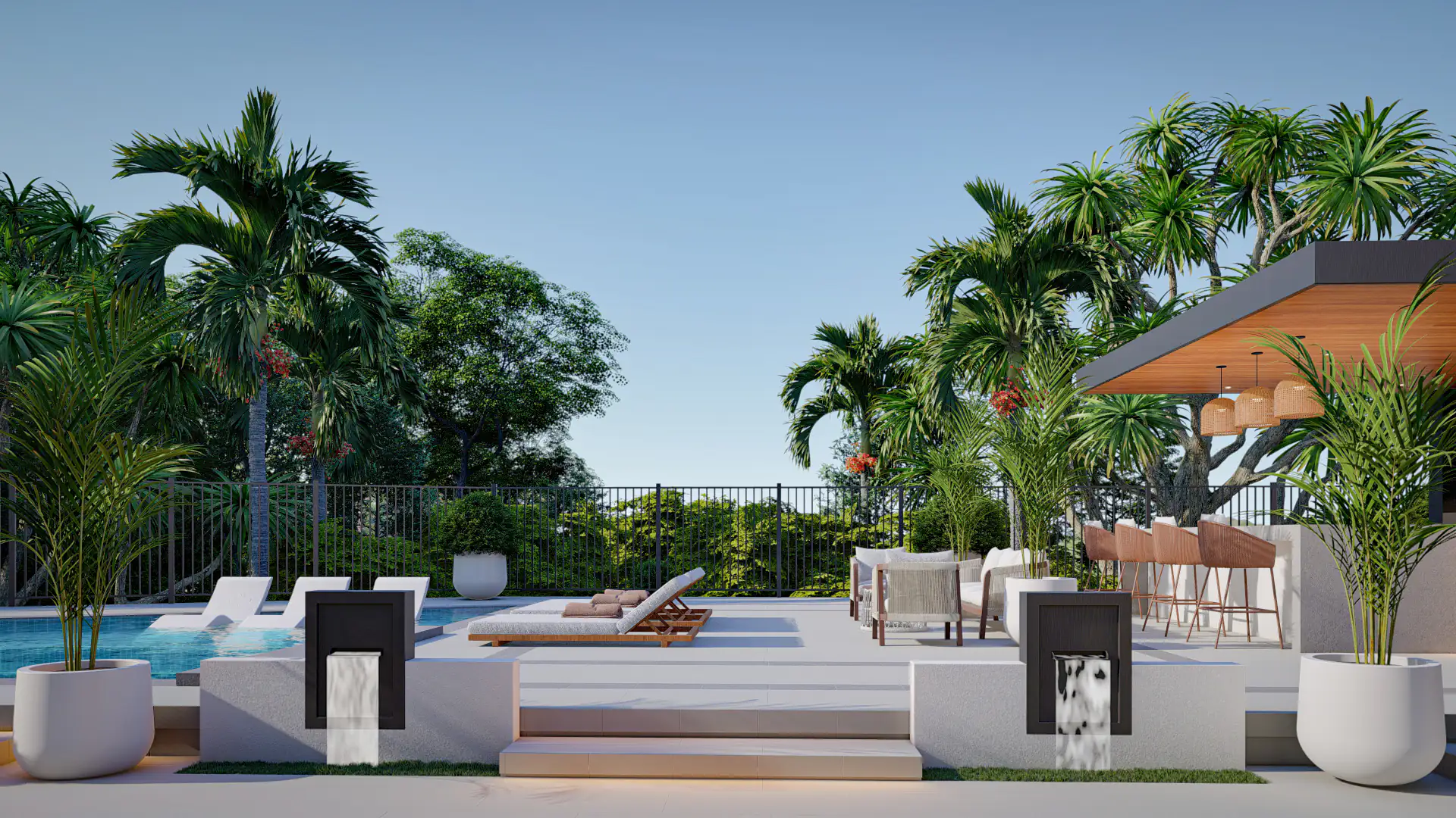 The centerpiece is a sleek pool with a raised spa, tanning ledge, and submerged loungers, framed with porcelain pavers and charcoal tile accents.