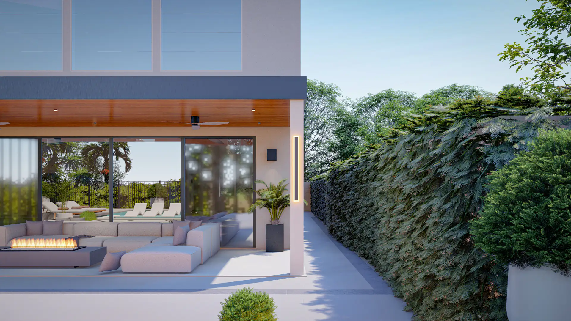 LED step lighting, large potted palms, and minimalist fencing add warmth and structure. Every finish was chosen to emphasize symmetry, contrast, and clean modern lines, making the space inviting day and night.