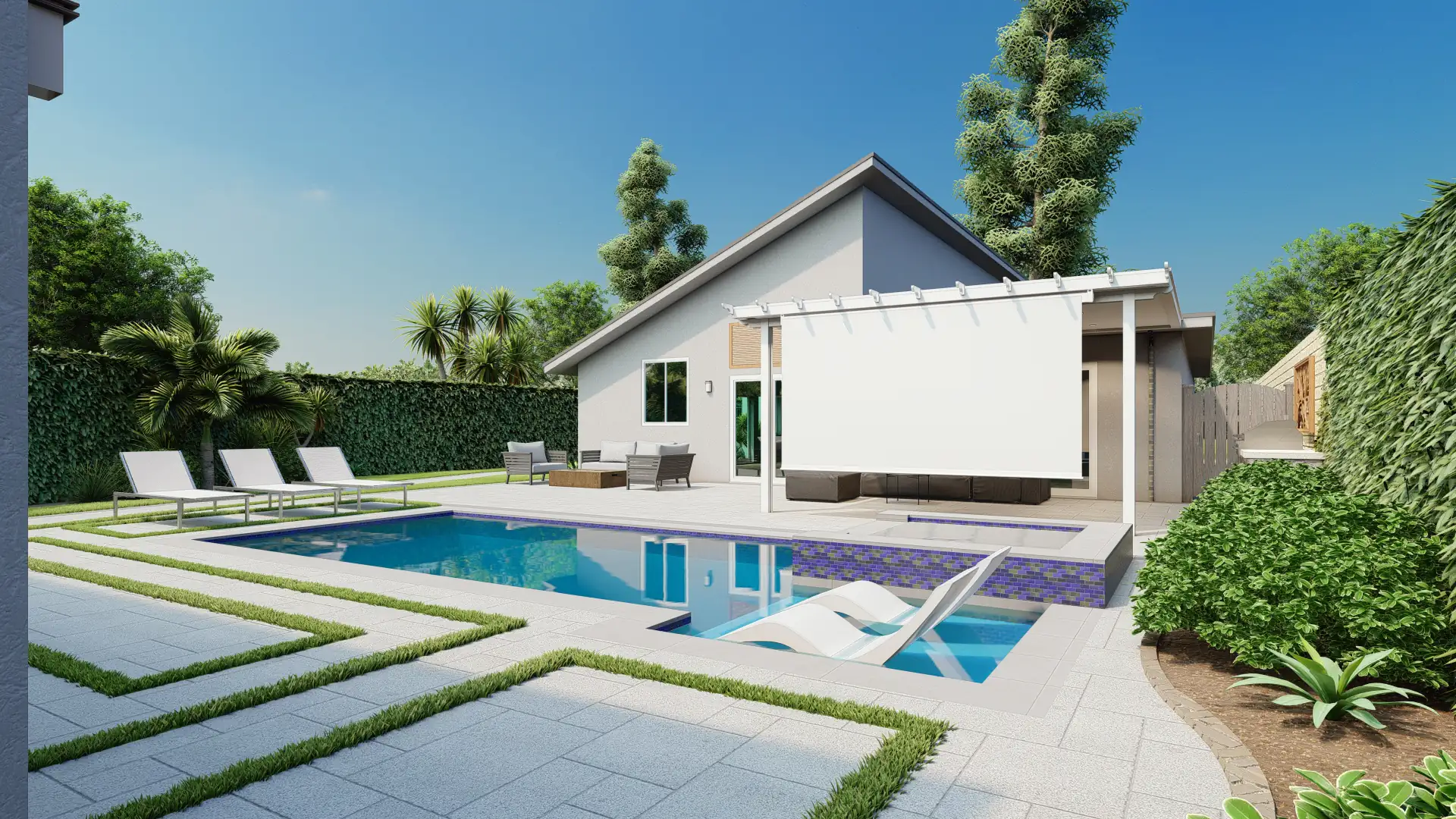 The focal point of the space is a sleek swimming pool with a raised spa, tanning ledge, and submerged loungers, framed by porcelain pavers and charcoal tile accents.