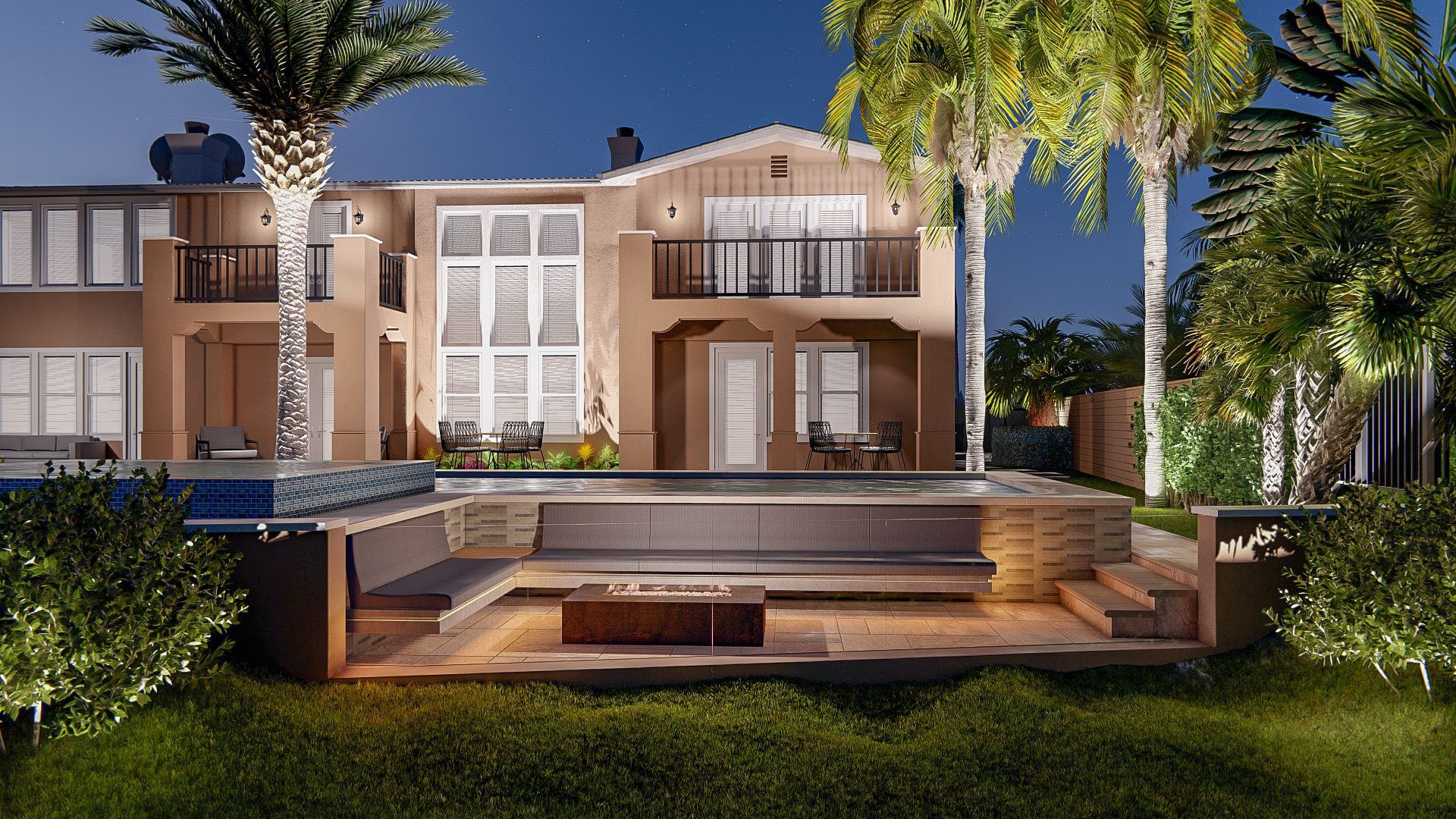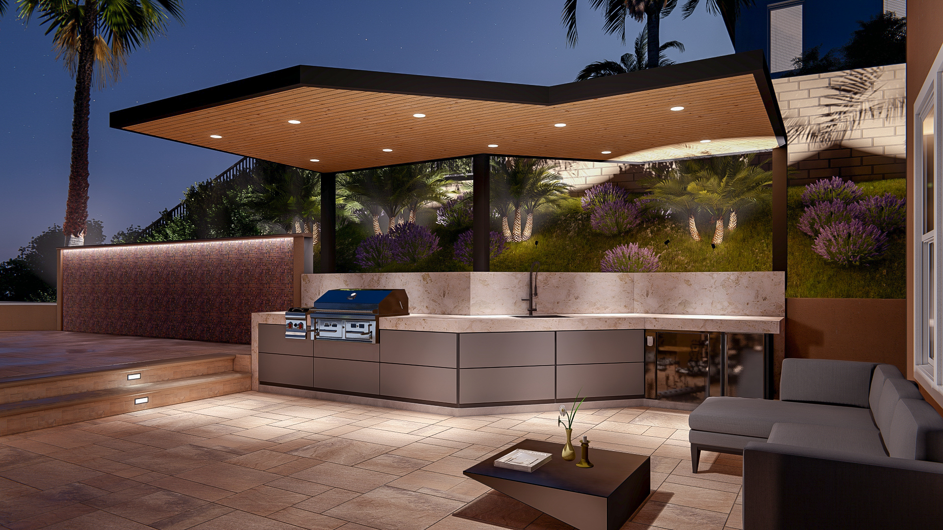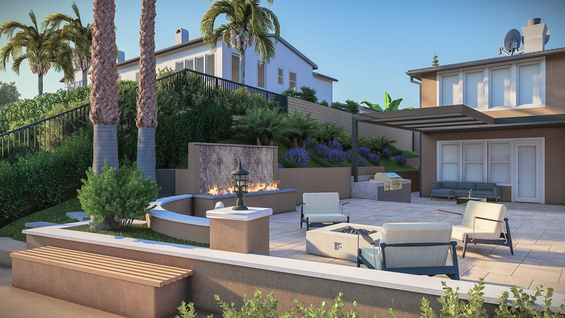An outdoor kitchen anchors the patio with bar seating, dining space, and lounge areas. Tiered fire features and custom seating zones balance relaxation with functionality.