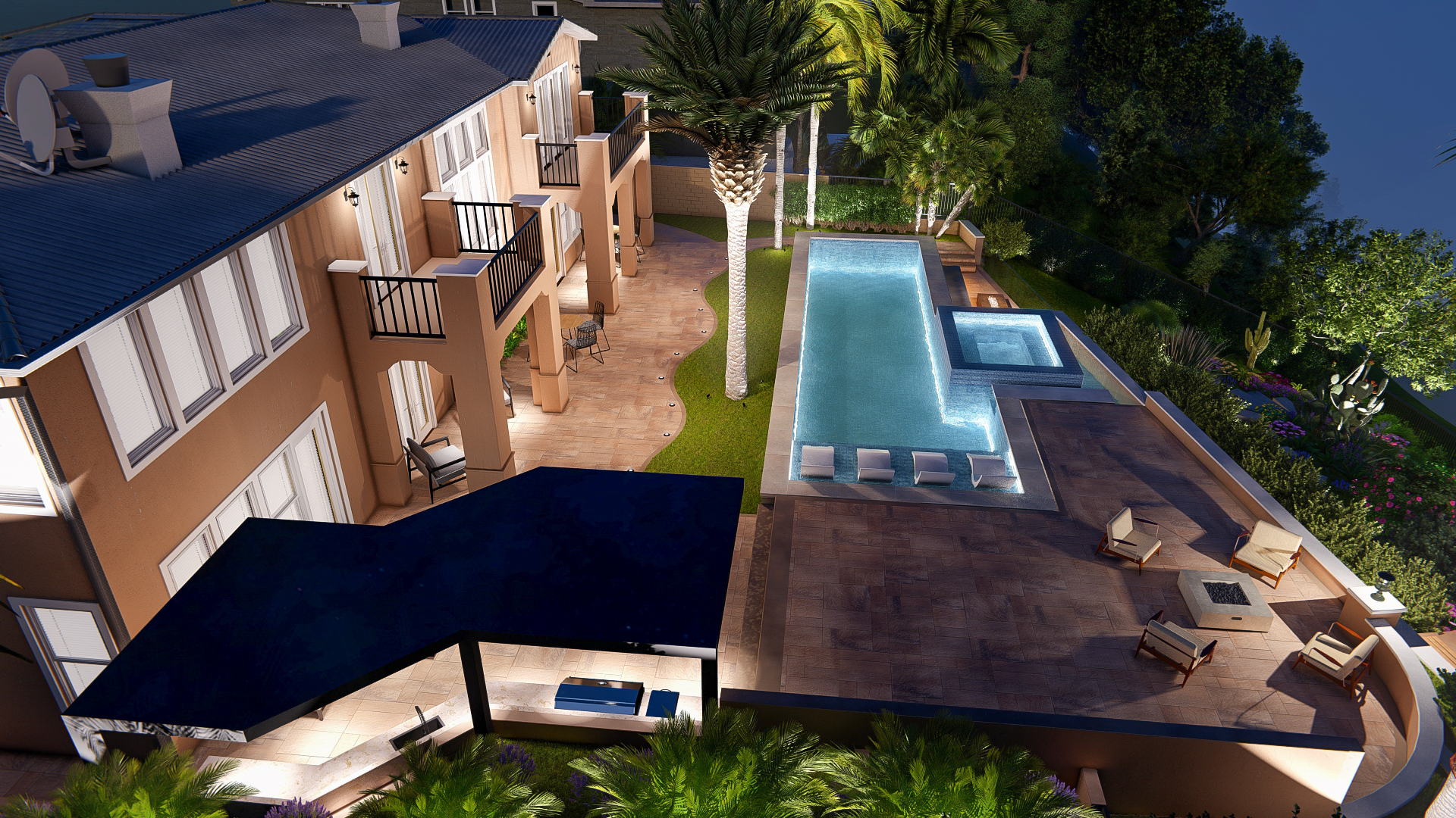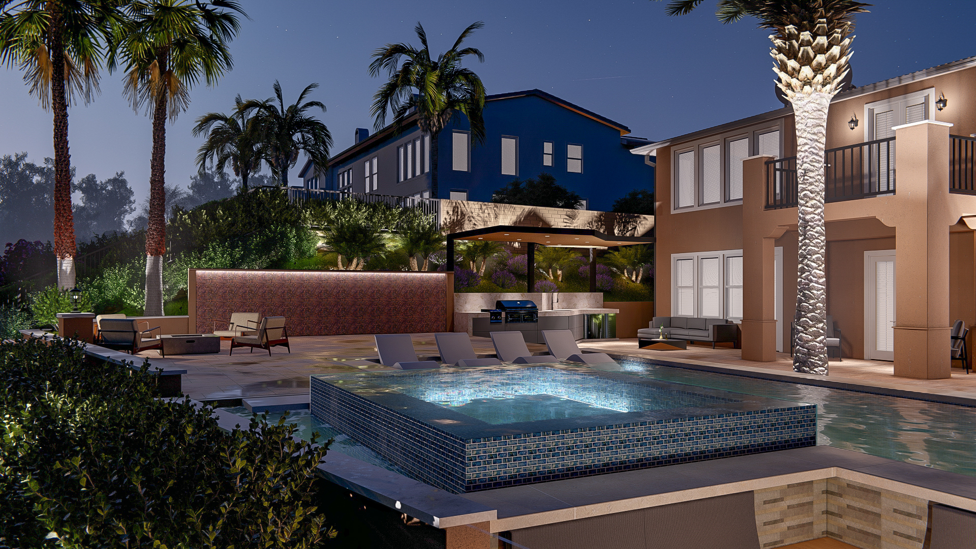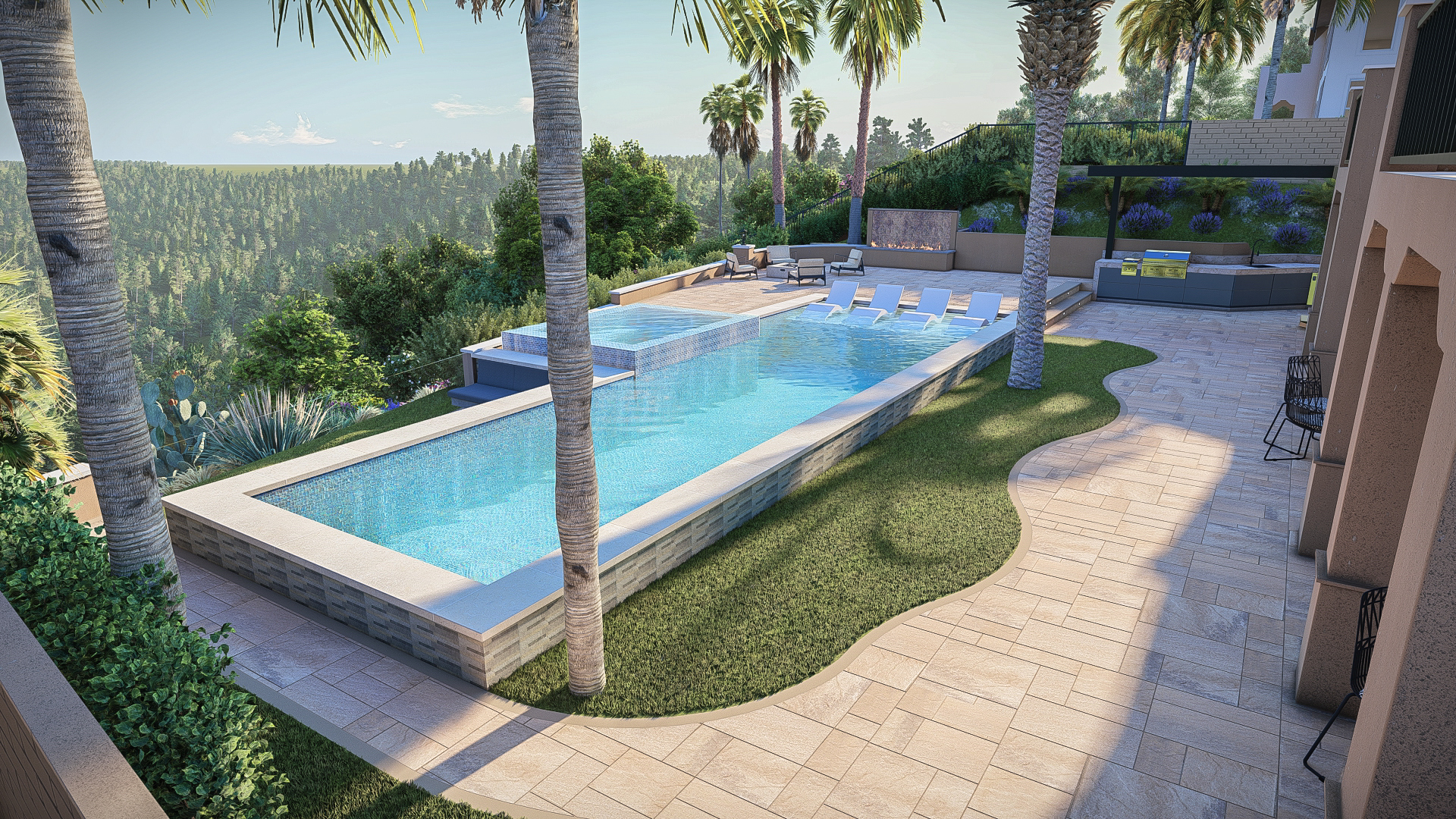 The goal was to maximize sloped terrain with multi-level entertainment zones that seamlessly connect home and landscape. A vanishing-edge pool, elevated spa, and sunken fire lounge create striking focal points against the hillside views.