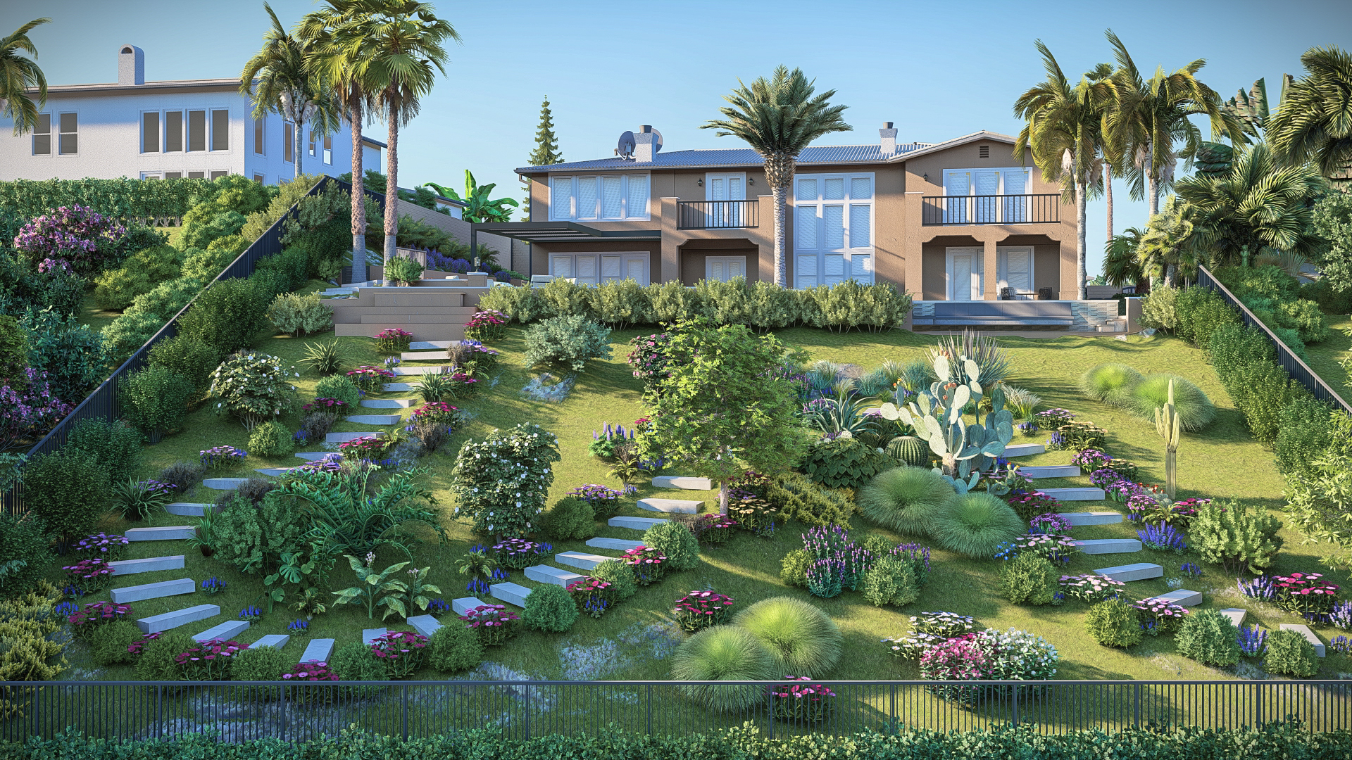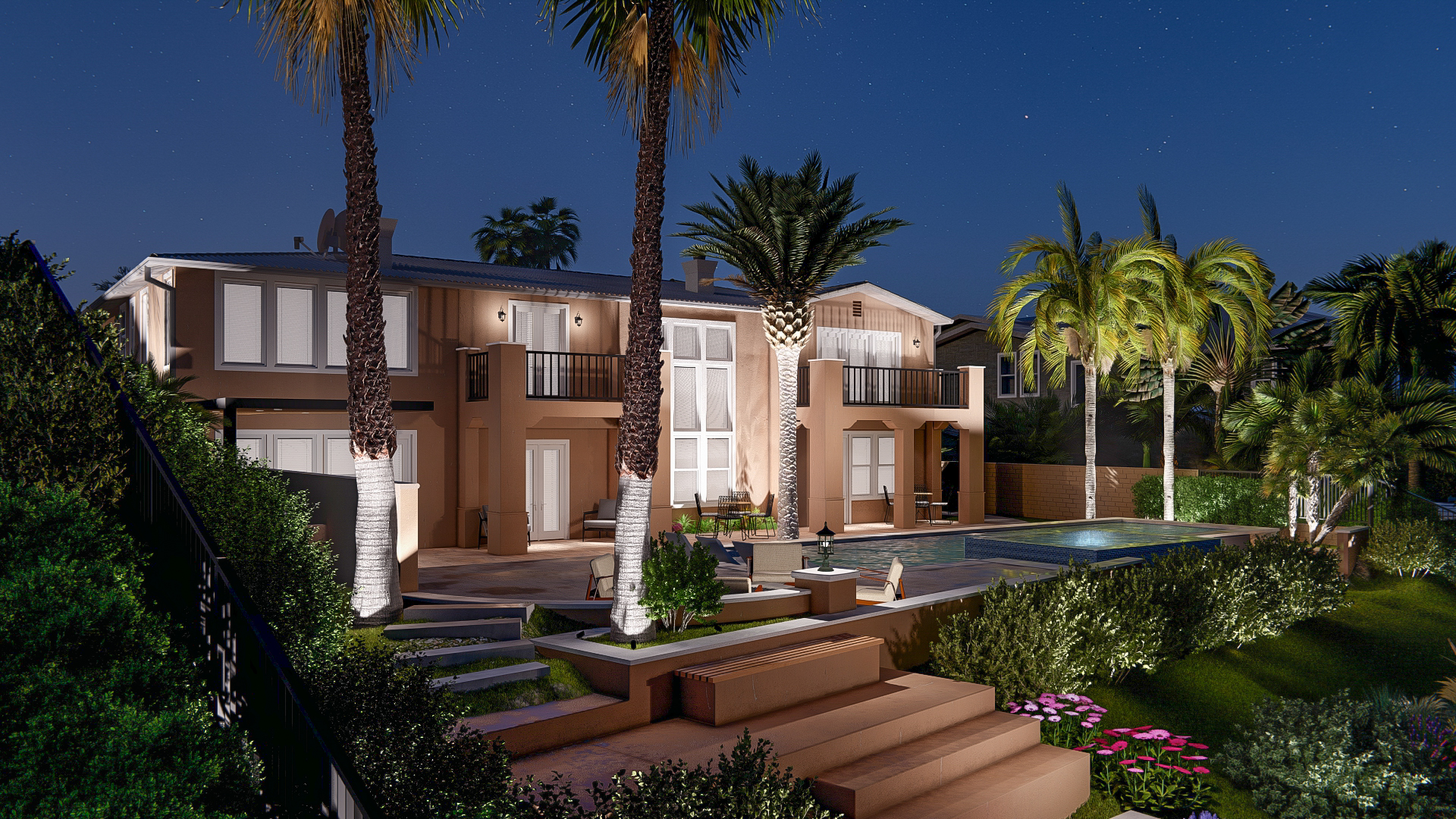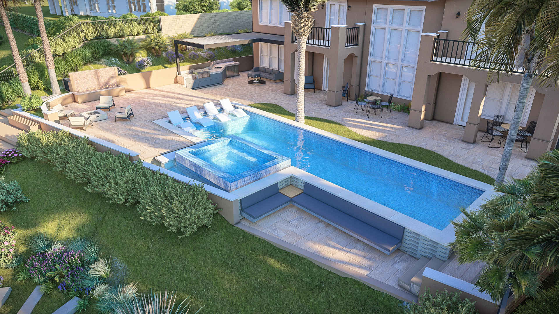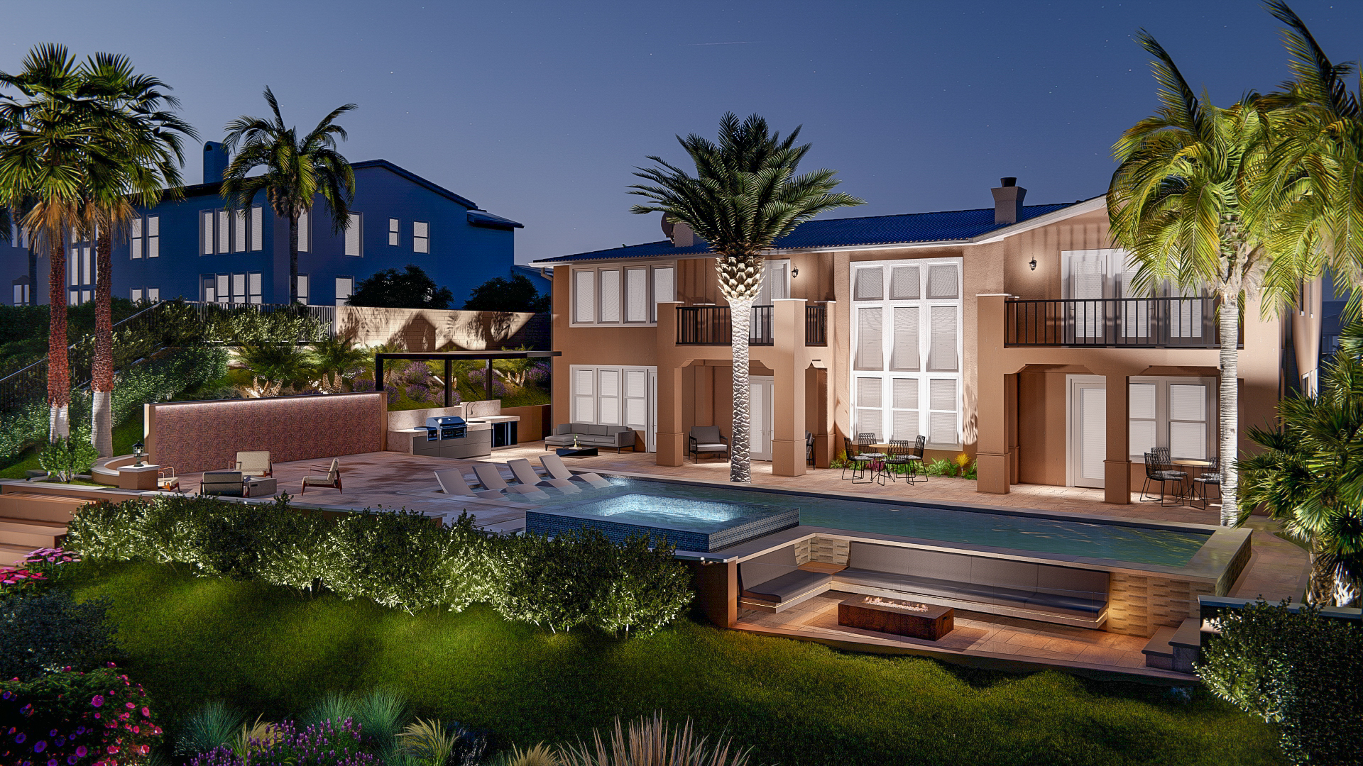 The goal was to maximize sloped terrain with multi-level entertainment zones that seamlessly connect home and landscape. A vanishing-edge pool, elevated spa, and sunken fire lounge create striking focal points against the hillside views.