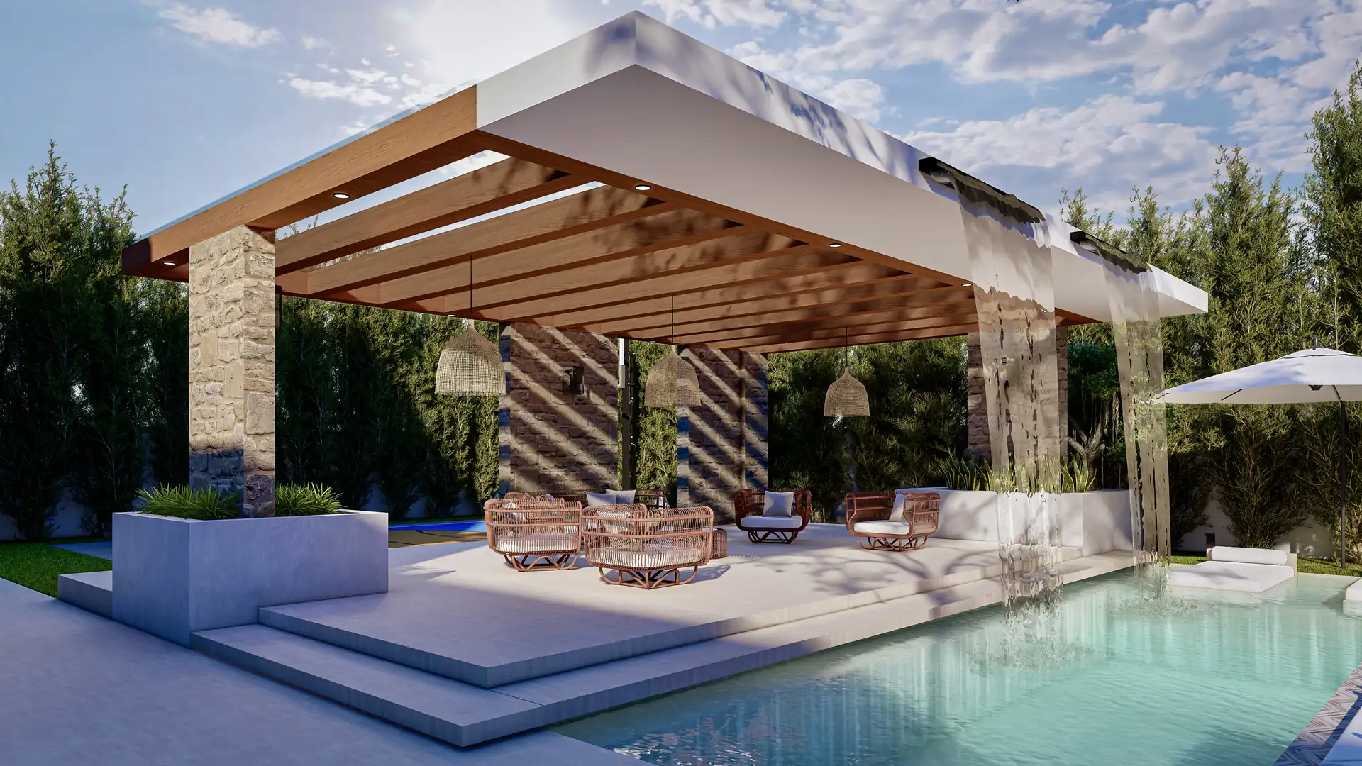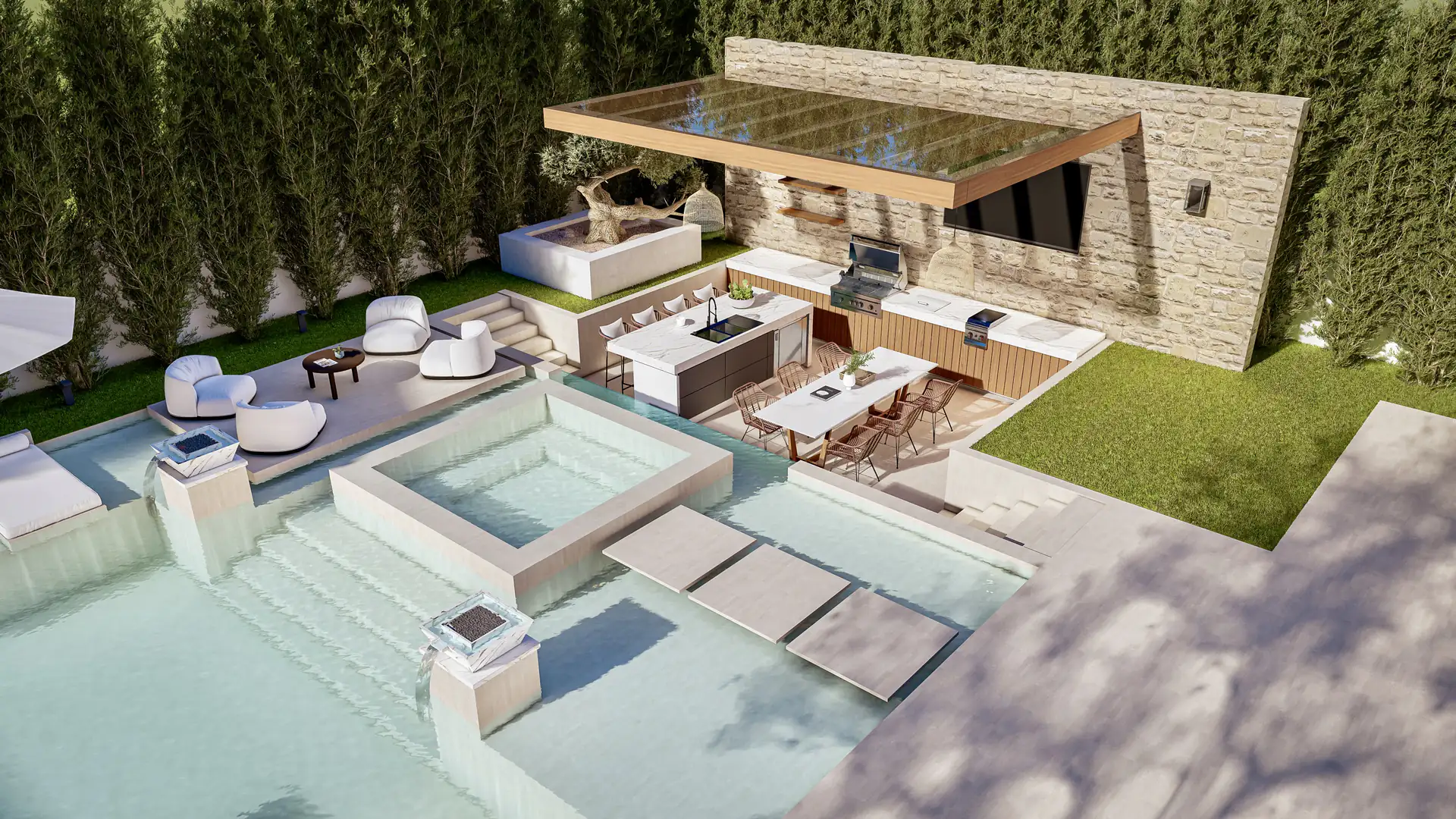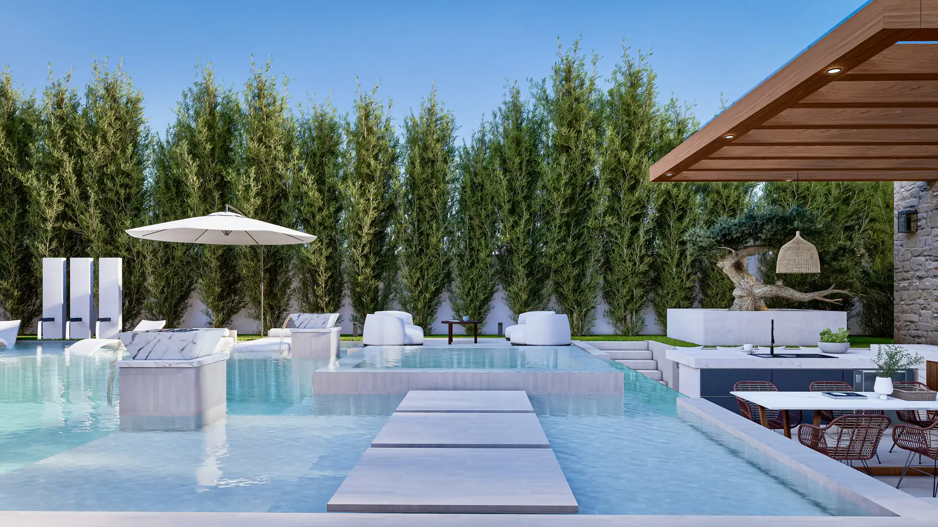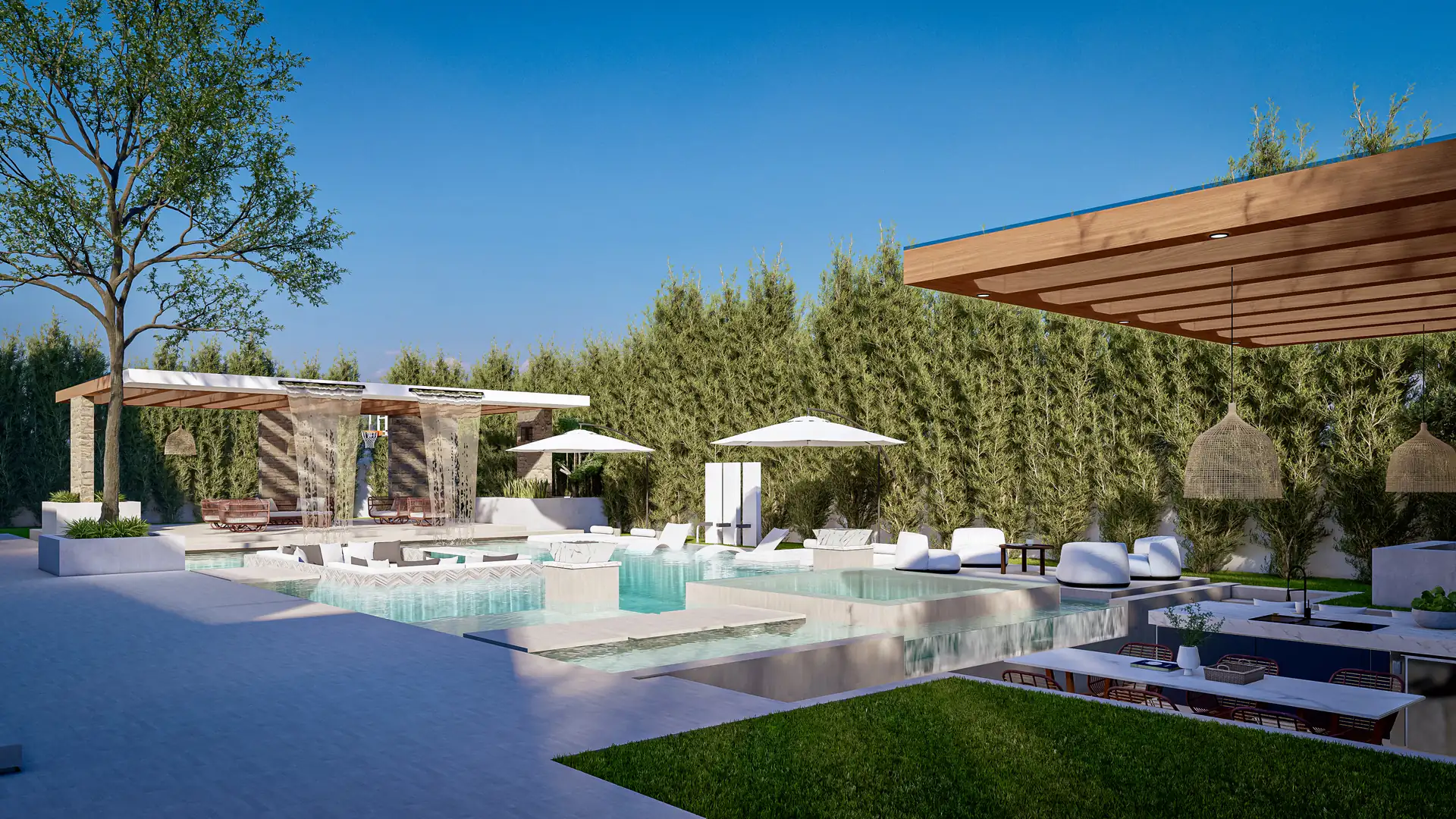 This project meticulously crafts a private, natural sanctuary, seamlessly blending traditional luxury with an organic, resort-inspired landscape.